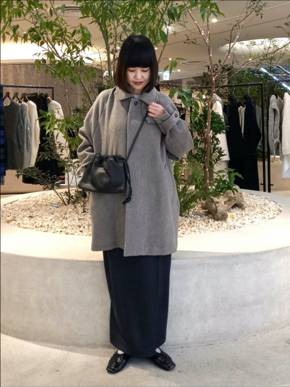 後ろのタックデザインが可愛いこちらのコートは、カシミヤ混で肌触りが良く上品な雰囲気に◎