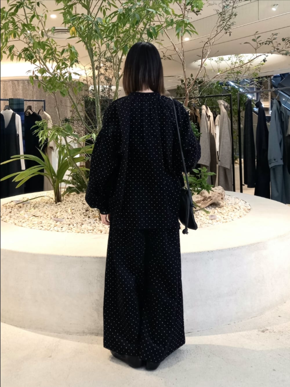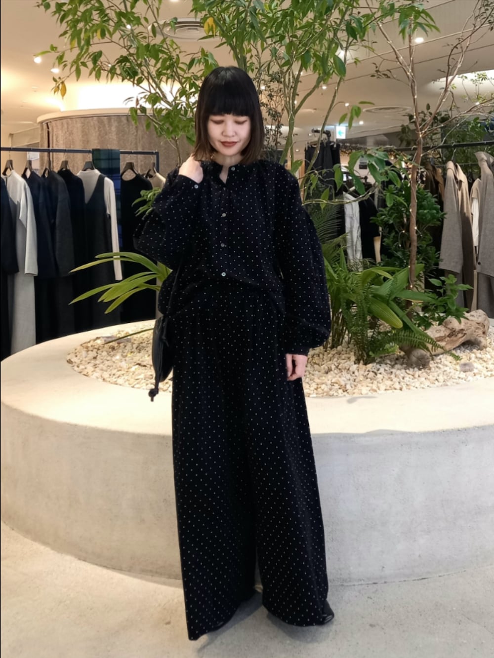 コーデュロイ素材のブラウスとワイドパンツは、小さめのドット柄で甘くなりすぎず上品な印象に◎