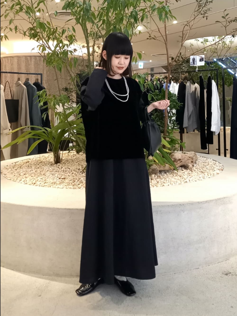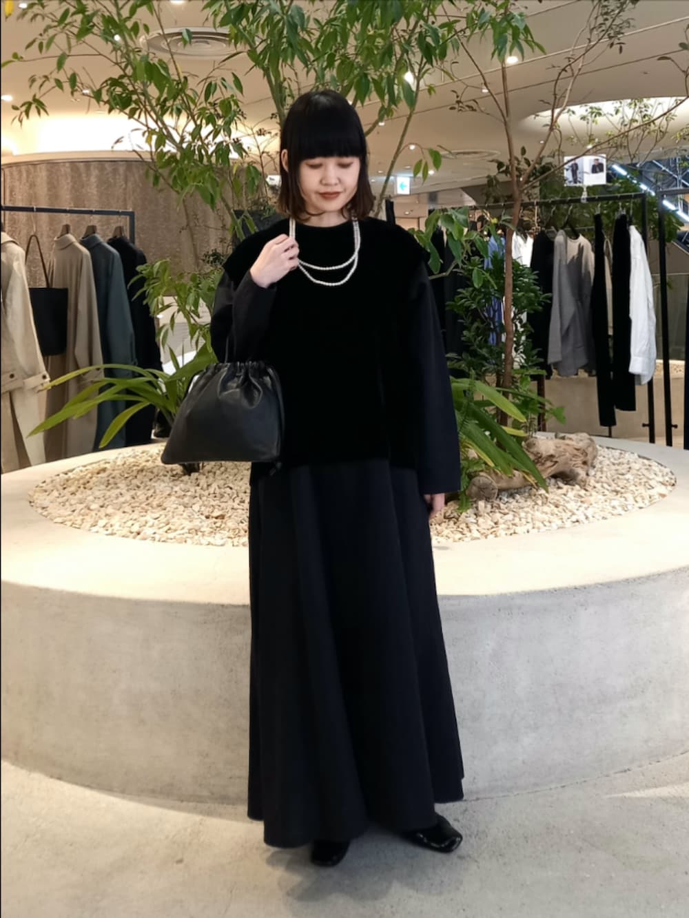 Aラインのシンプルなワンピースとベルベットのプルオーバーをレイヤードしてセレモニースタイルに。