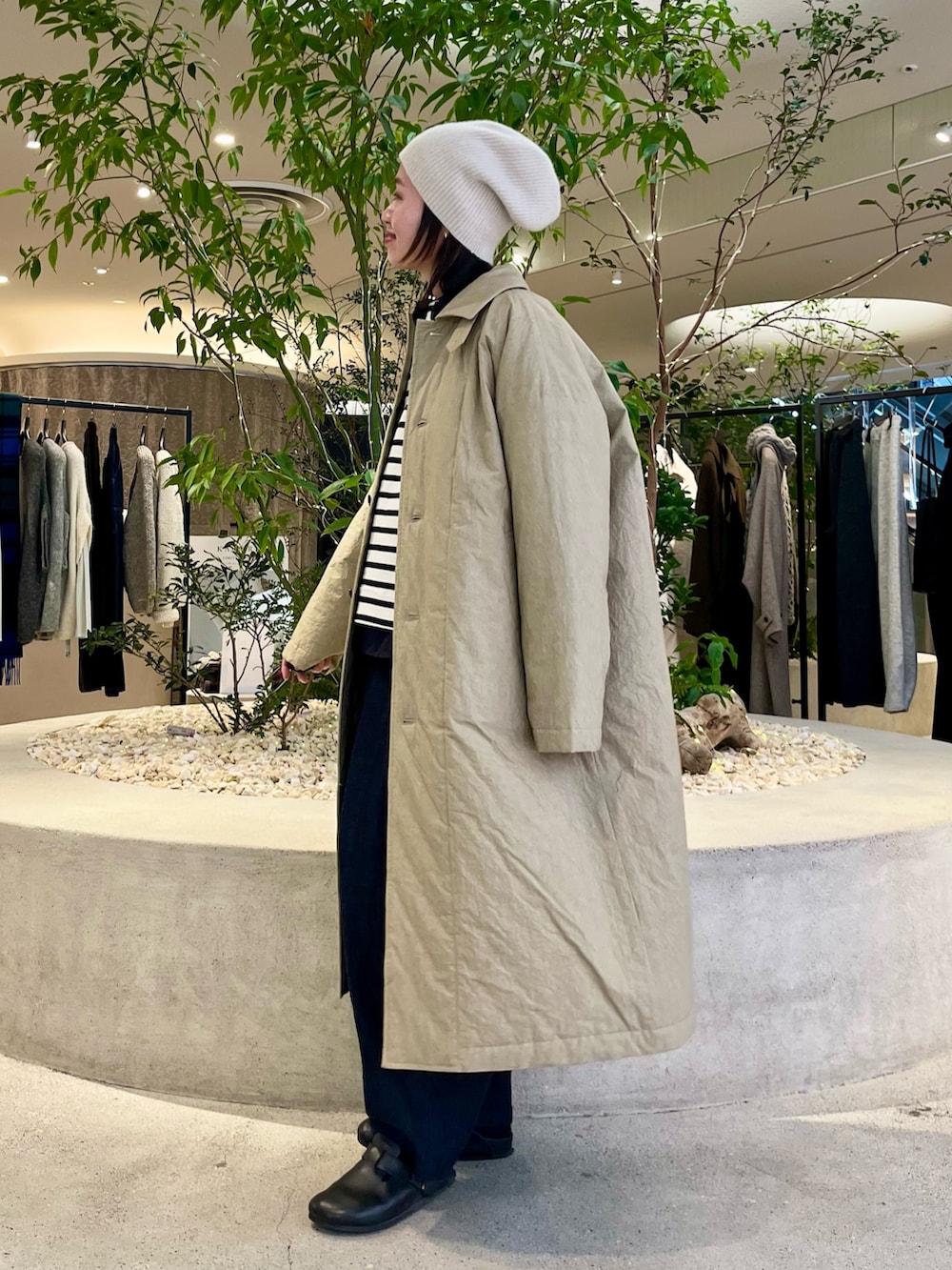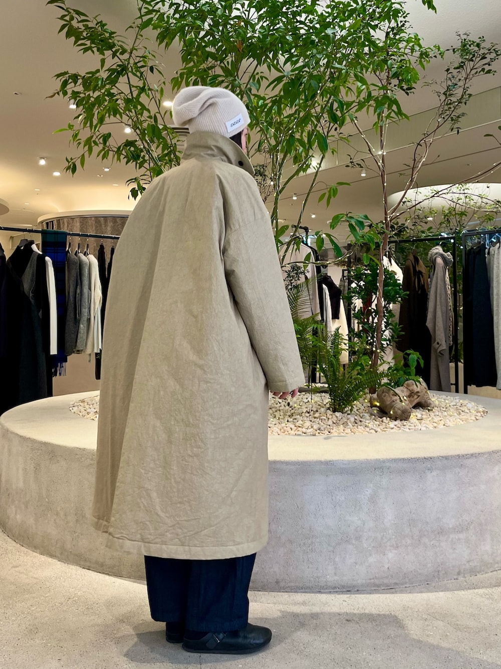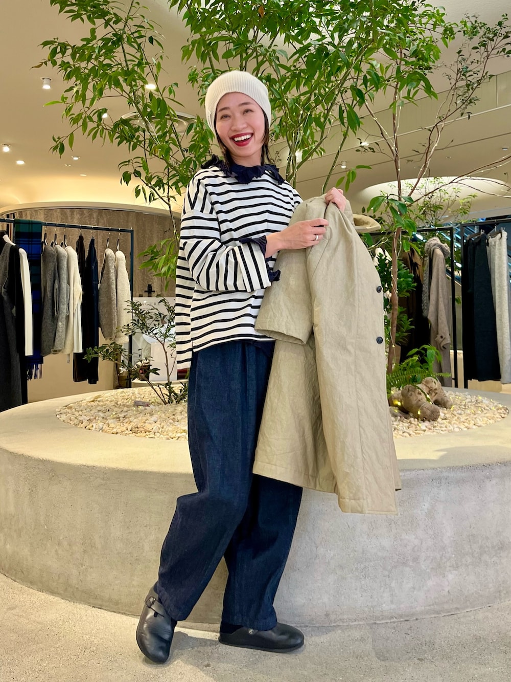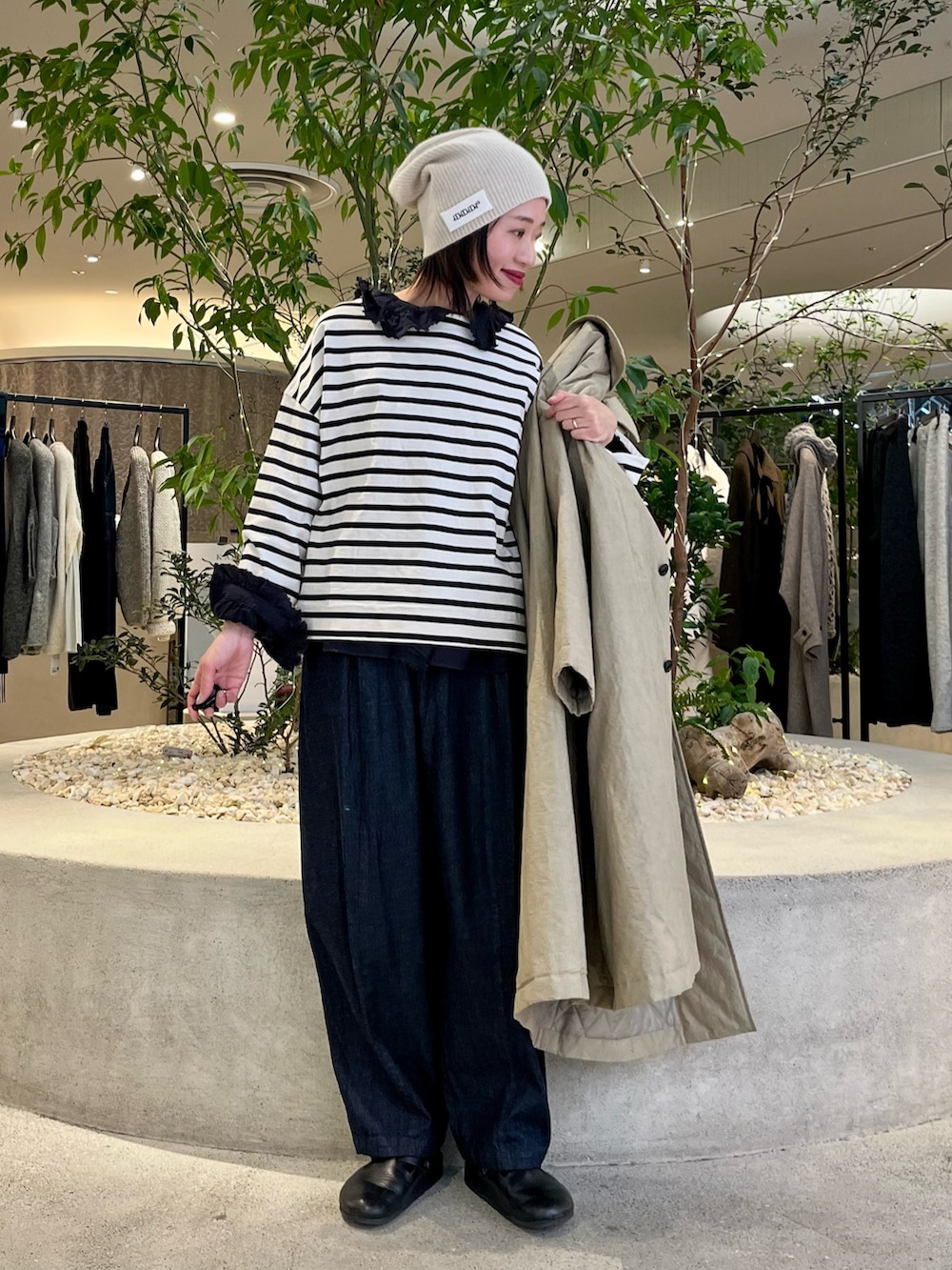 ゆったりしているので、これから寒くなる冬はインナーにタートルネックの薄手のウールニットなど合わせたり、今回はフリルシャツを合わせて、小物にカシミアのビーニーを。
