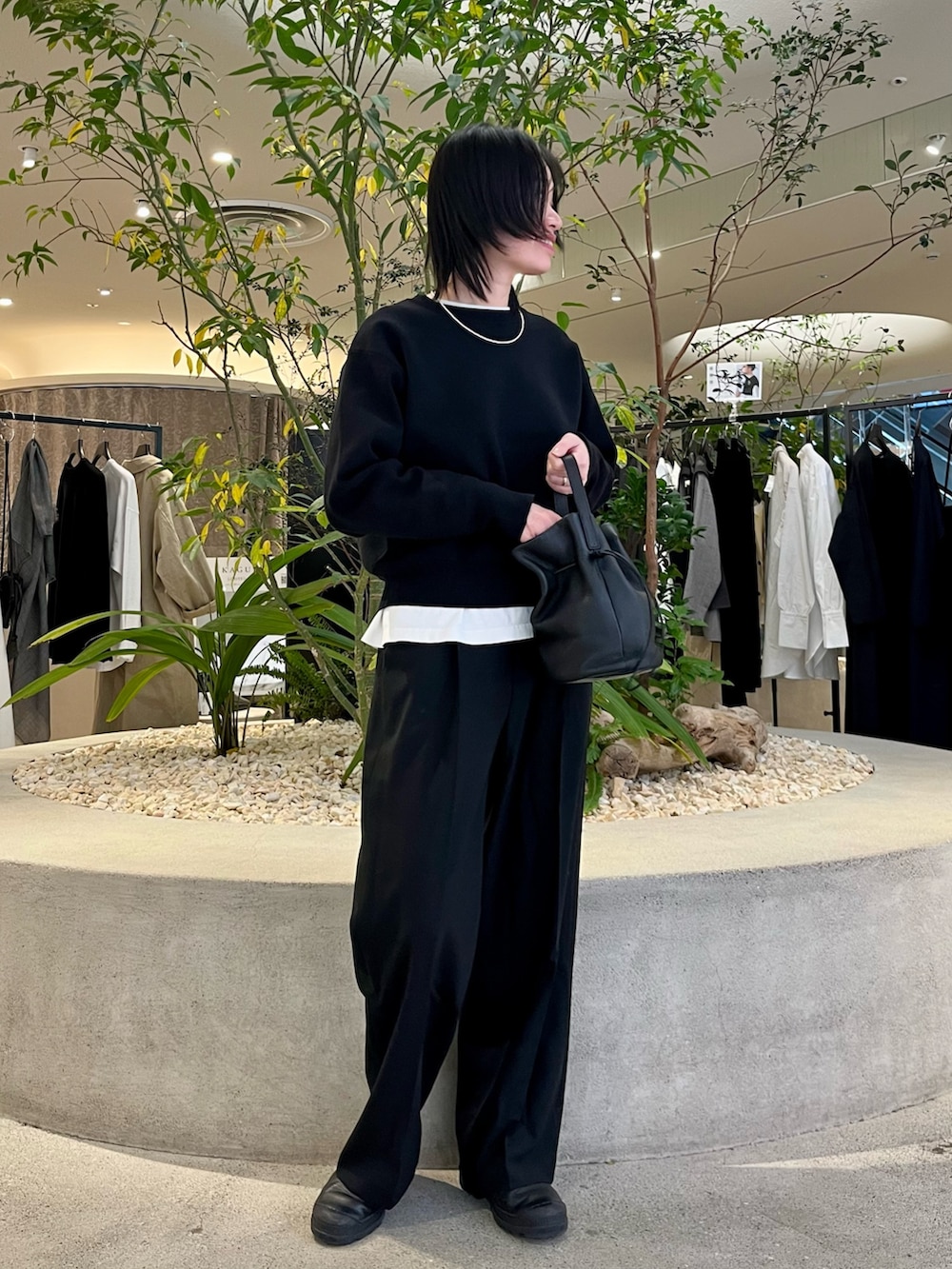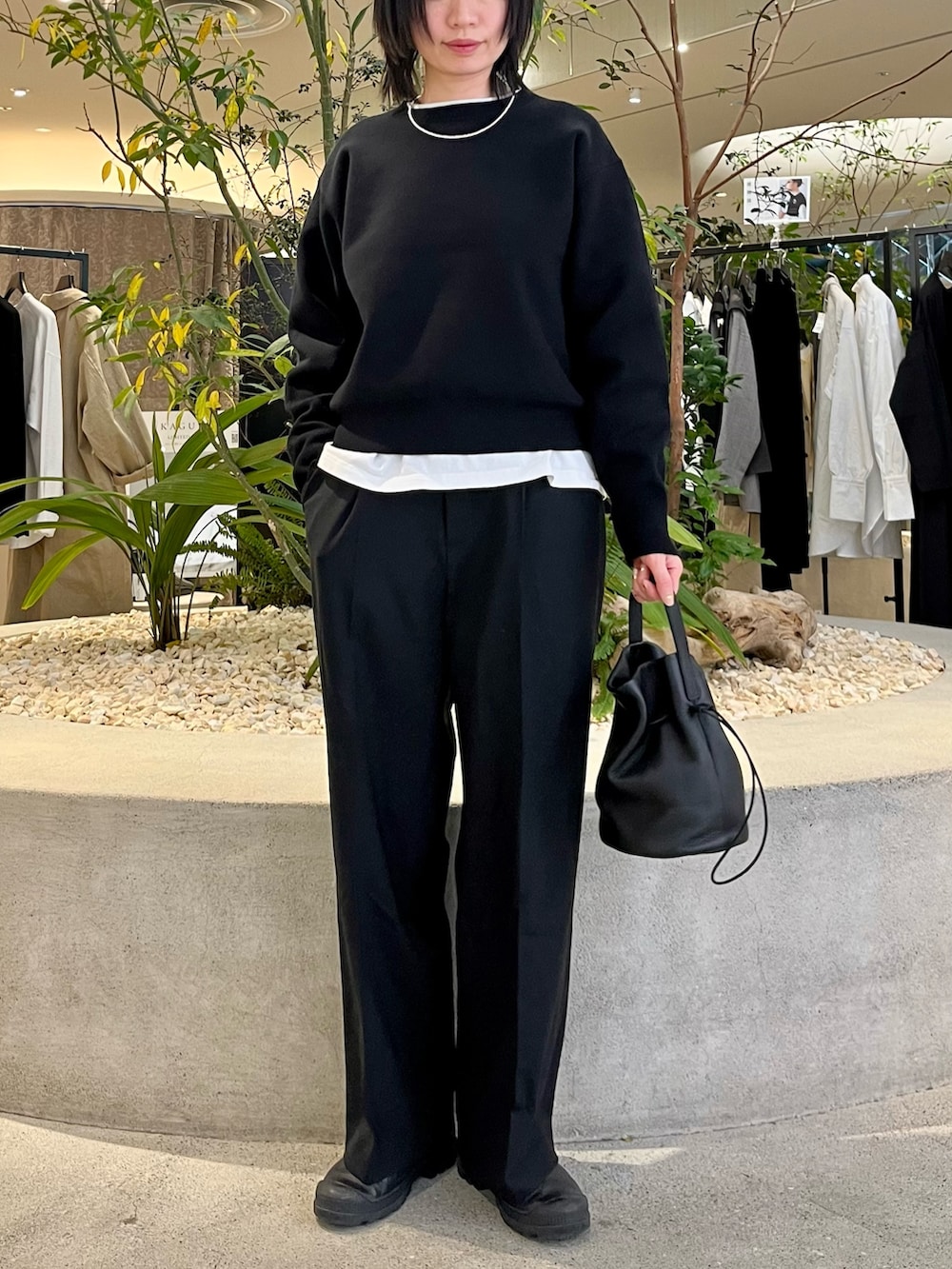 トップスはコットンカシミアの素材でスウェットよりもキレイめに合わせられて、