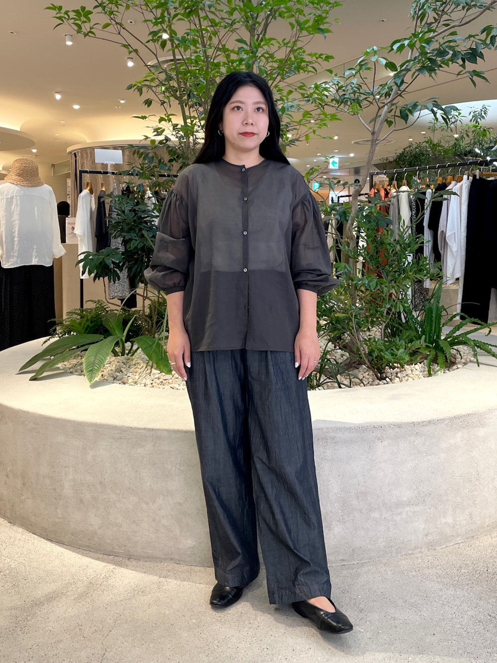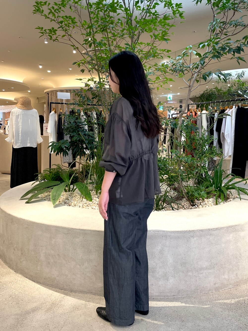 バックスタイルはクシュっと自分で絞り加減を調整できるようになっているのでボトムのシルエットも選ばずに着れます。