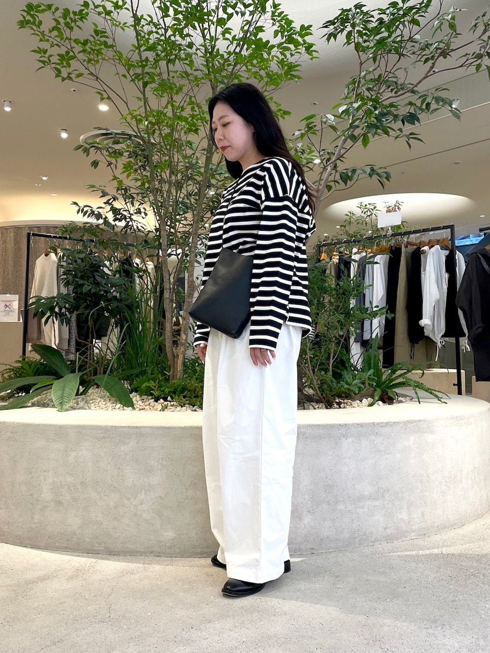 ボトムは以前もご紹介させて頂いたのですが、ハリ感のある生地が体にまとわり着かずストンと落ちたシルエットがきれいな一着です。