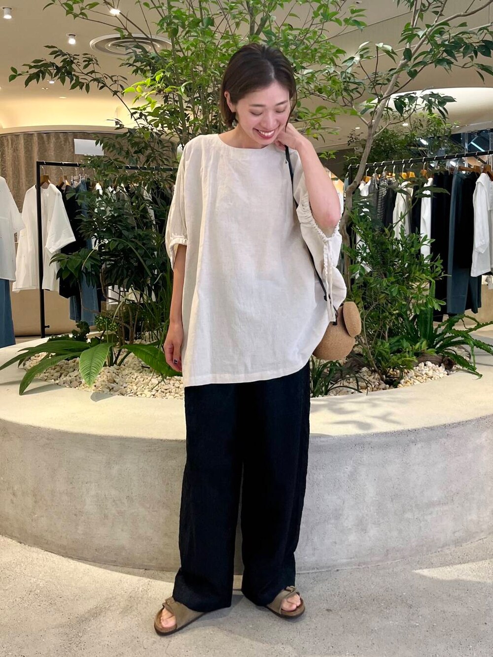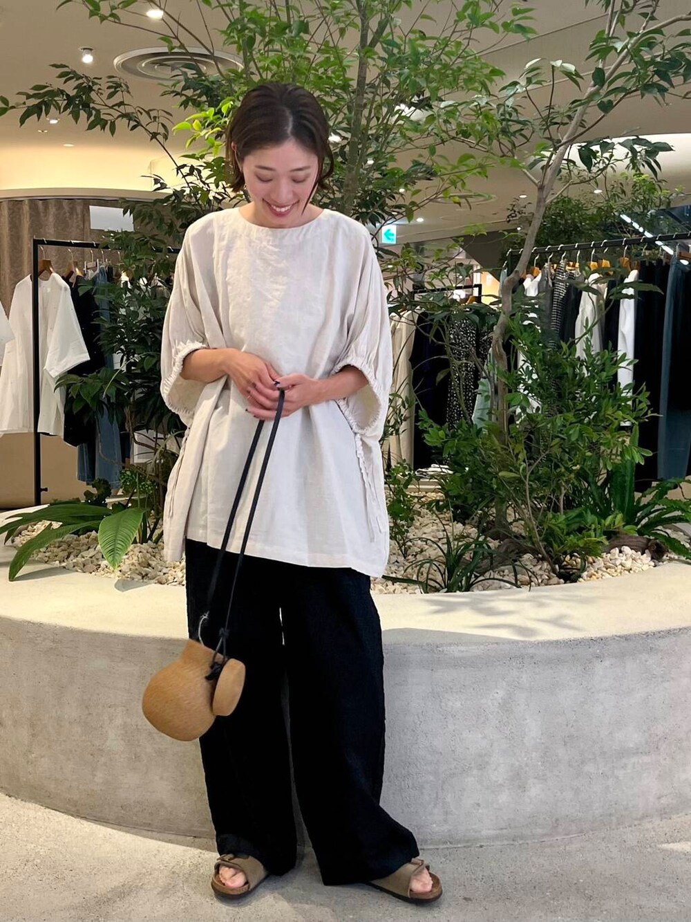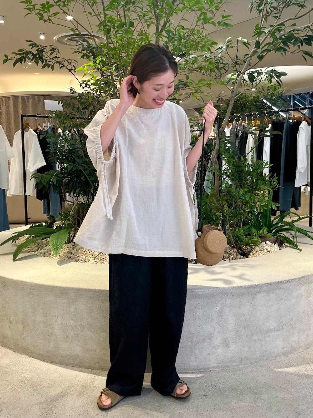 袖の女性らしいキャザーがポイントなので、シンプルなパンツと合わせました。