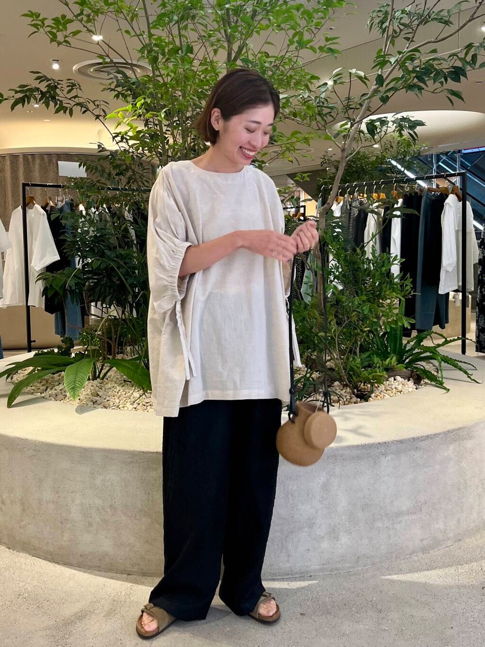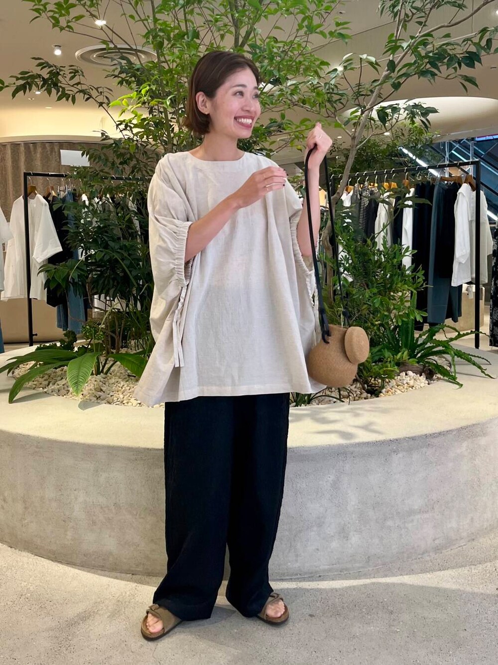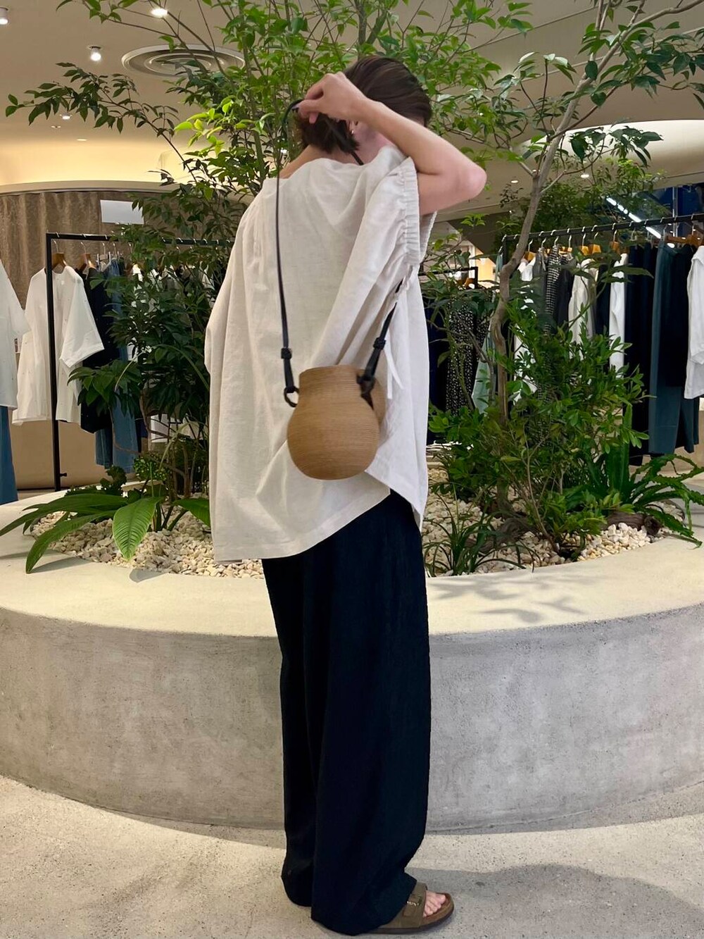 袖の女性らしいキャザーがポイントなので、シンプルなパンツと合わせました。