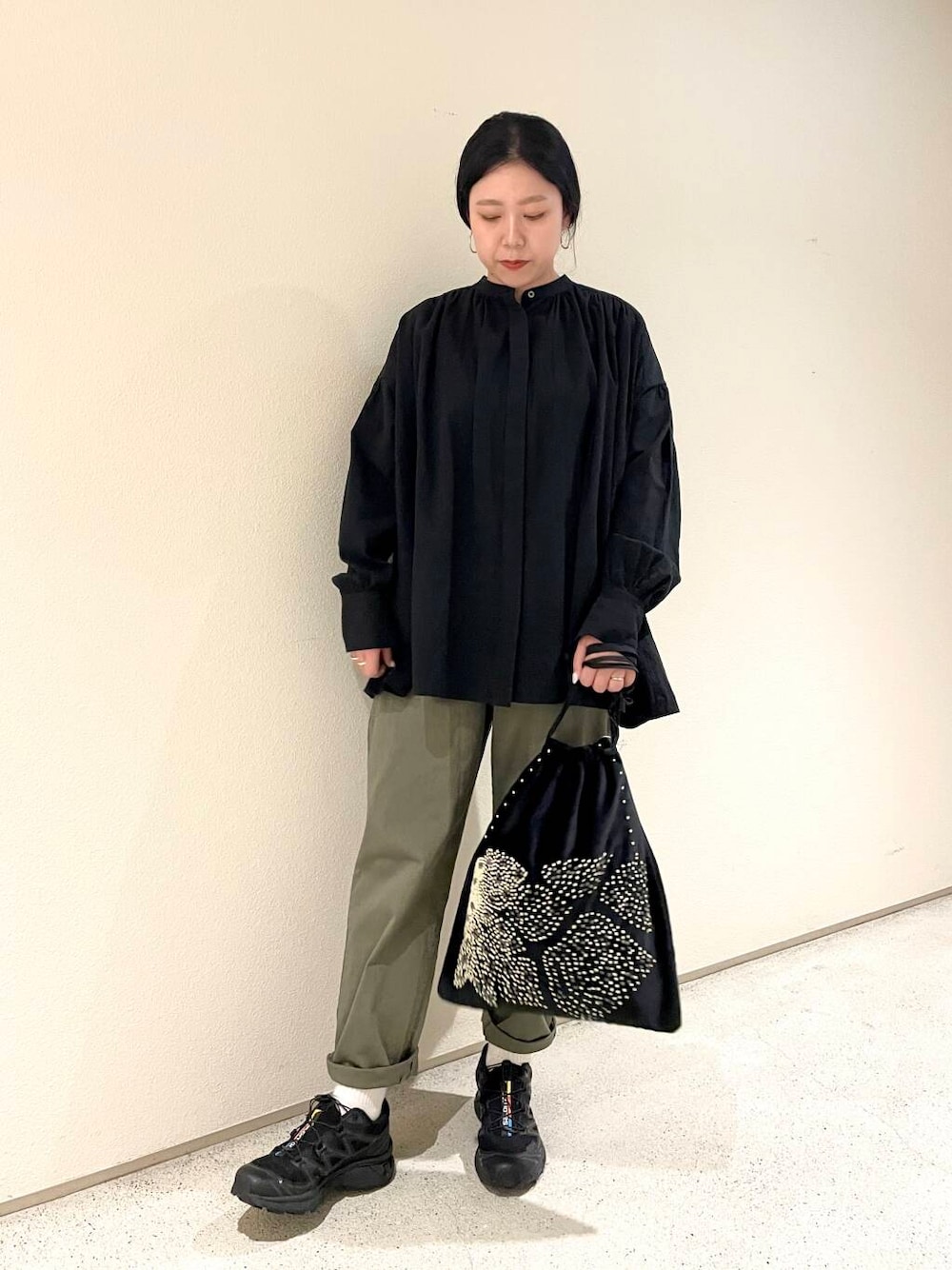 今回はトップスが広がりがあるので裾をロールアップして靴もしっかり見えるバランスにしています。