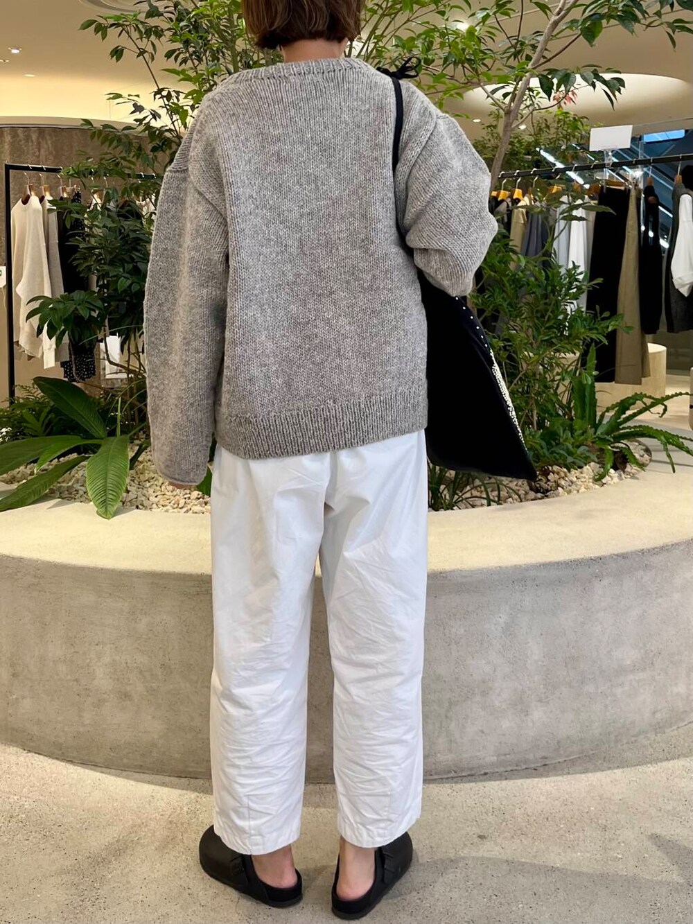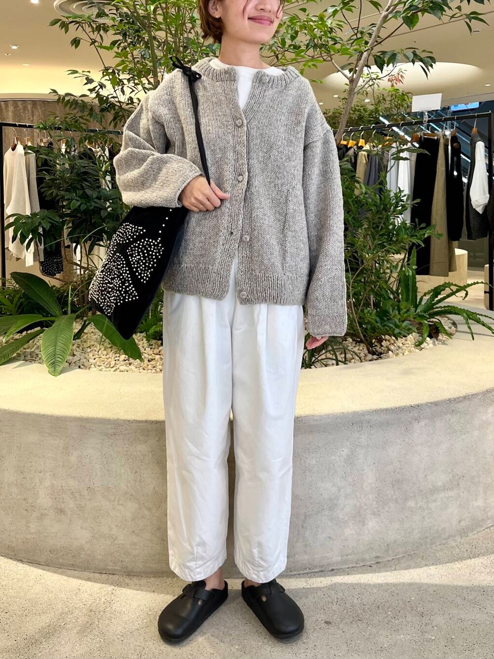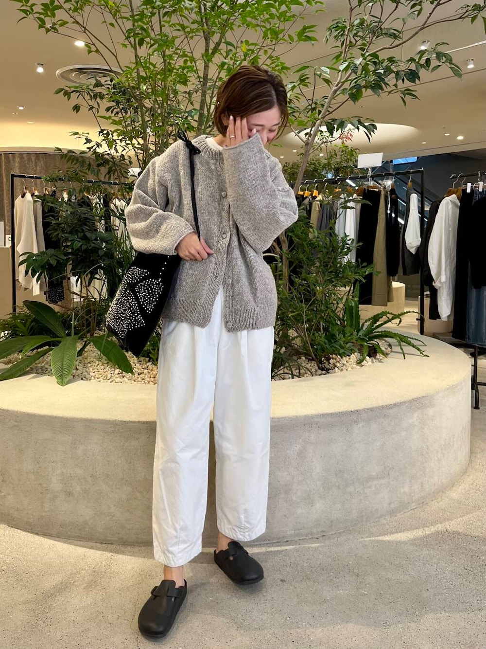 ペルーニットシリーズよりペルークルーネックカーディガンのコーデです。