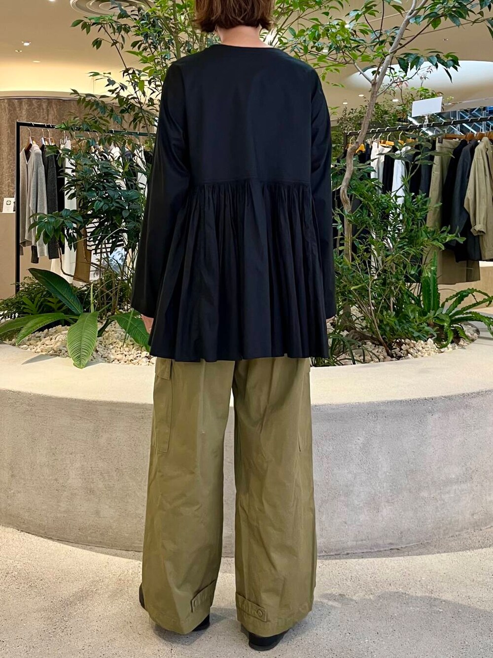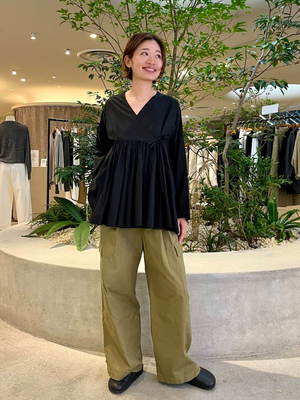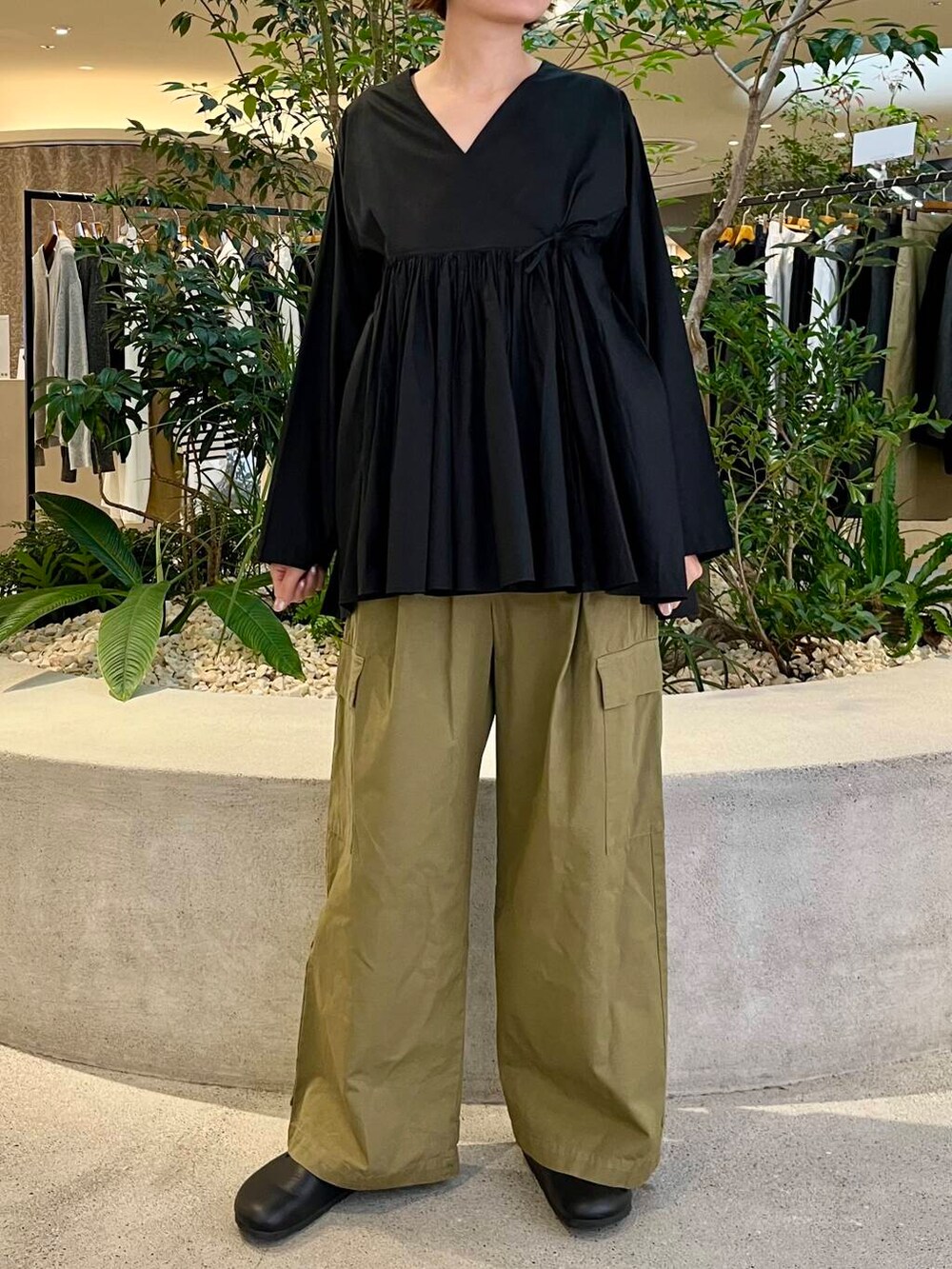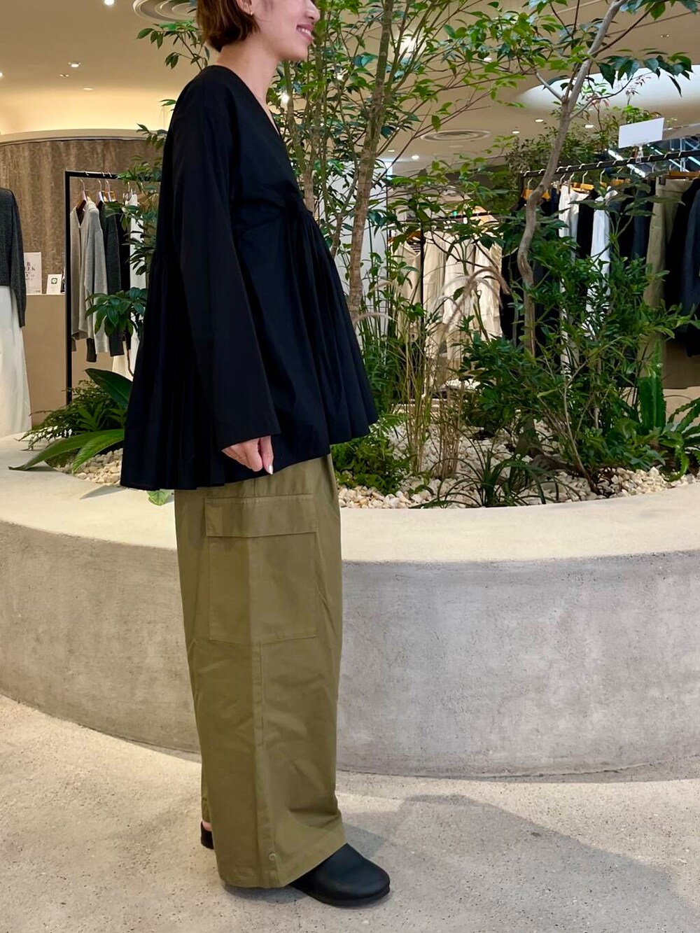 とても合わせやすいKHAKIのパンツにBLACKのブラウスは定番の組み合わせでとても好きです。