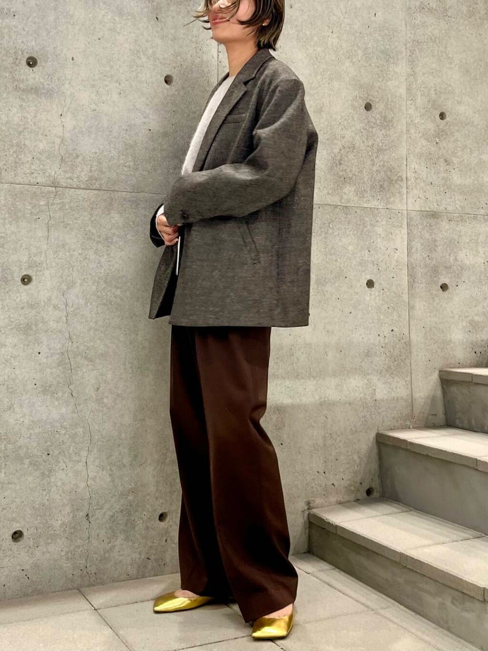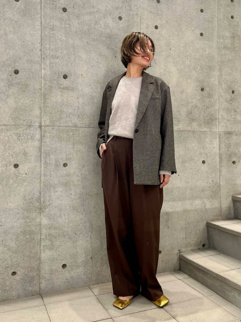 インナーにニットを合わせても腕まわりが余裕があるので、アウター代わりにもなるジャケットでおすすめです。