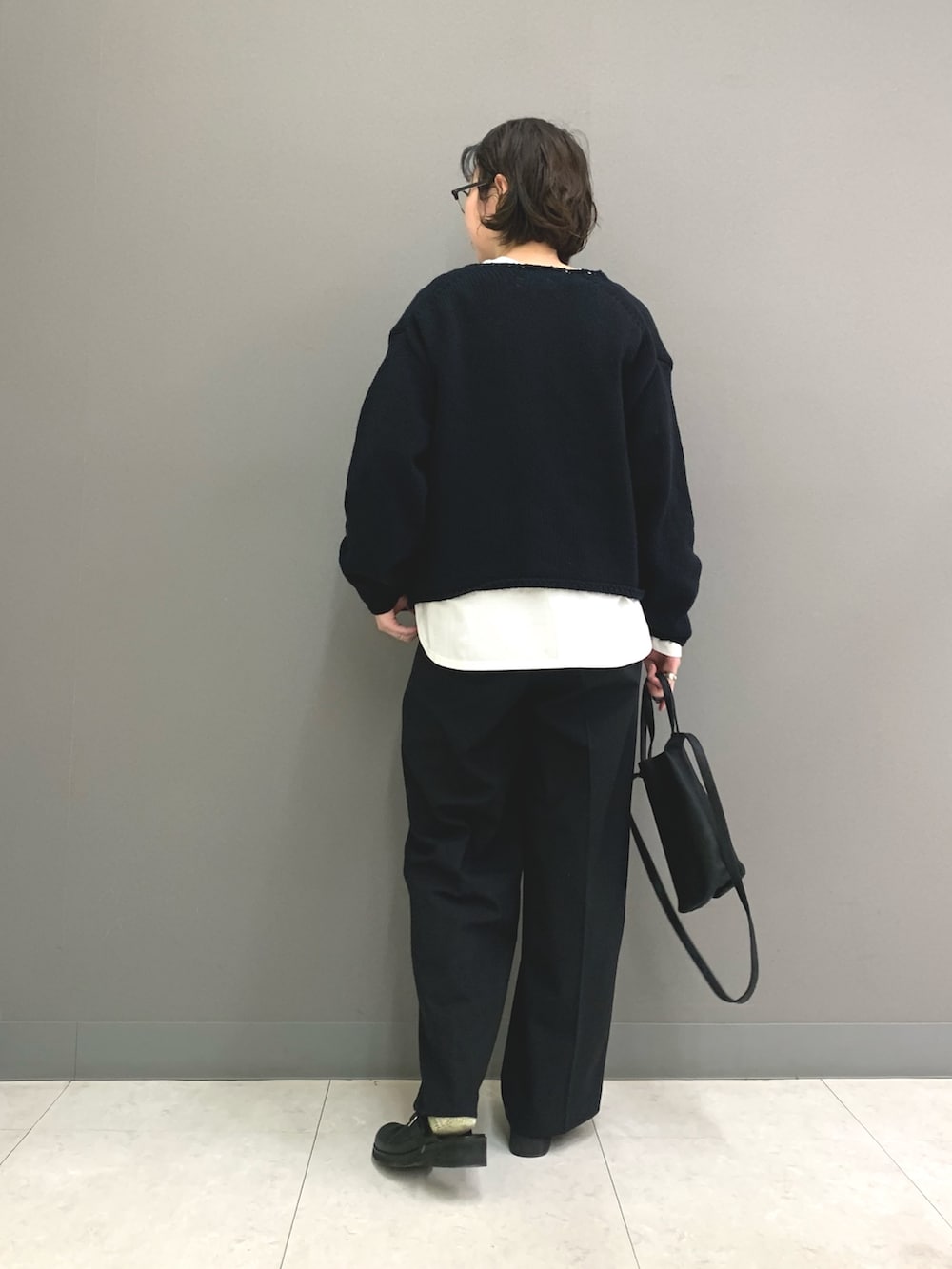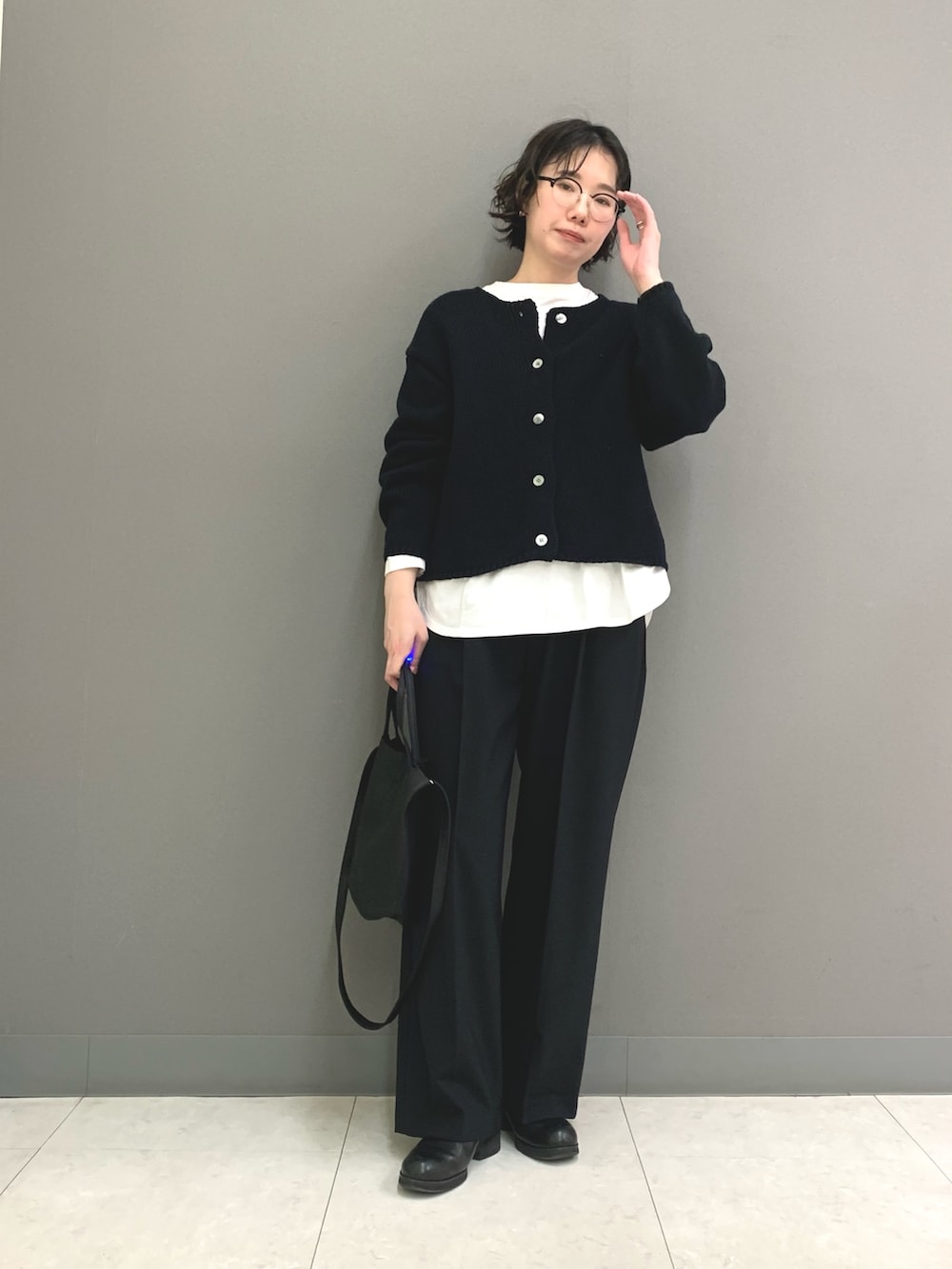 ローゲージのざっくりとした編みのカーディガン。ブラックだと甘過ぎず大人な雰囲気で合わせられます。大きな貝ボタンがポイントで素敵です。丈が長過ぎず短過ぎずでボトムの合わせを選ばないのも◎
