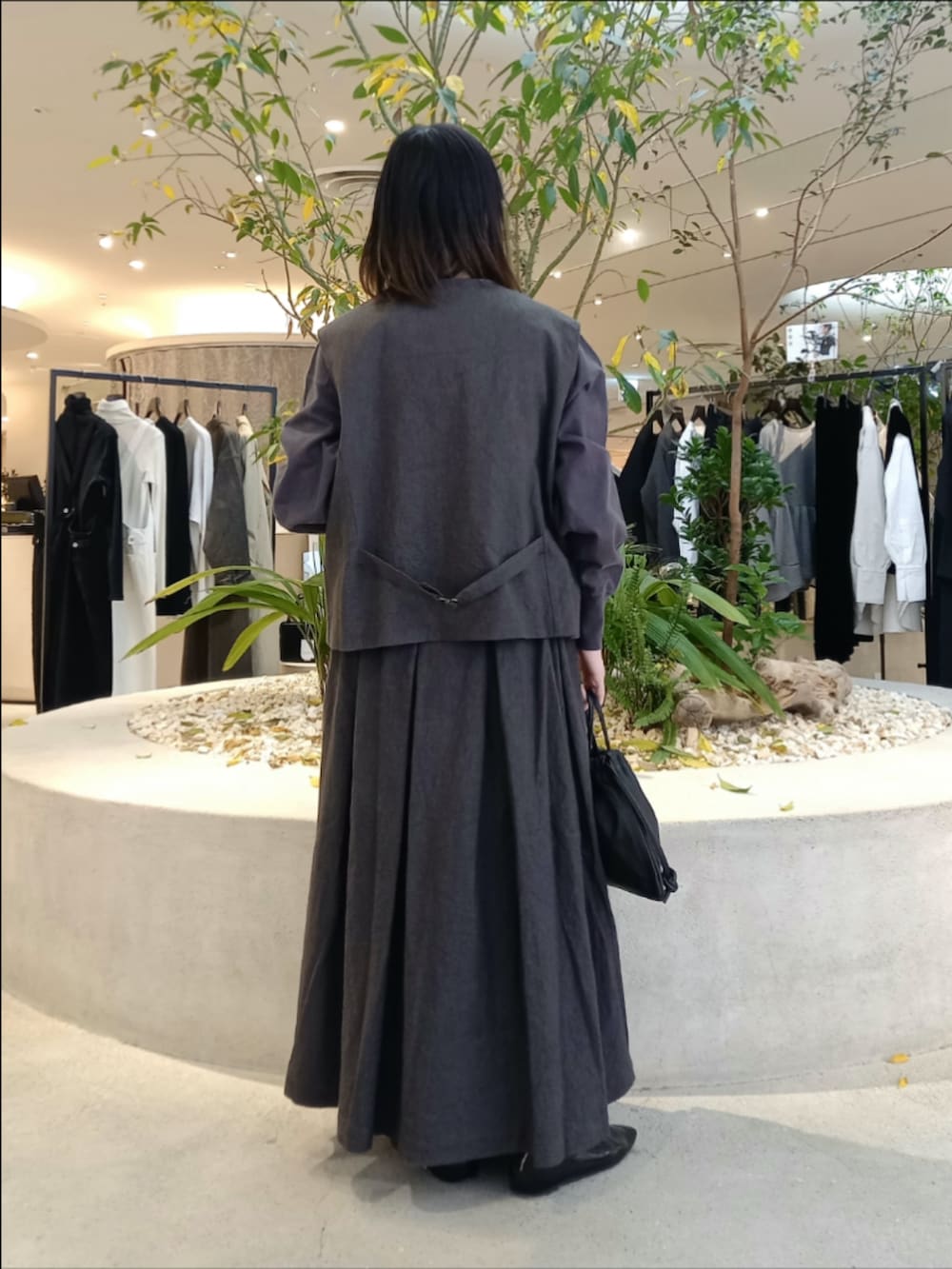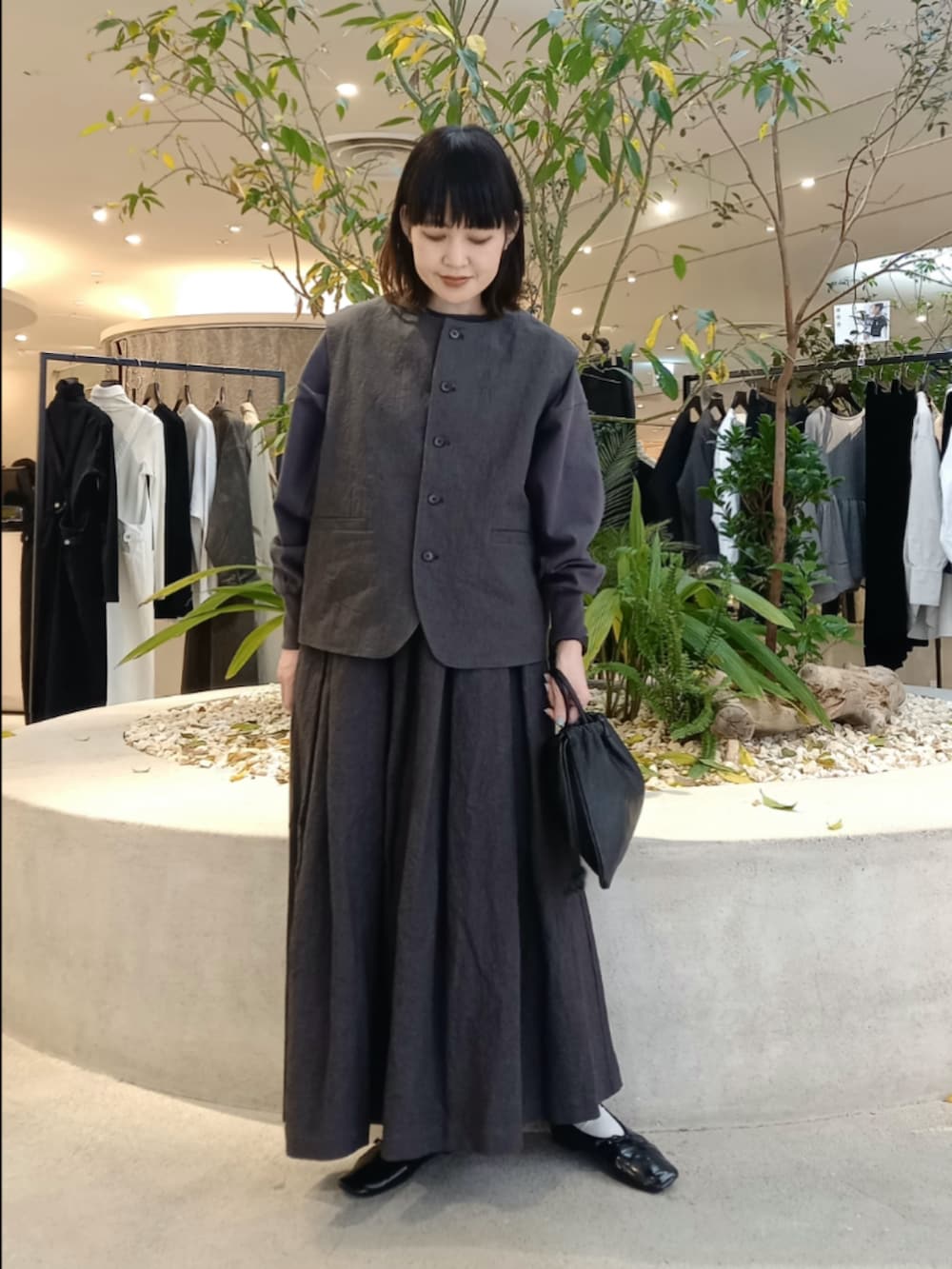 コットンリネンのベストと同素材のスカートでセットアップコーデです。