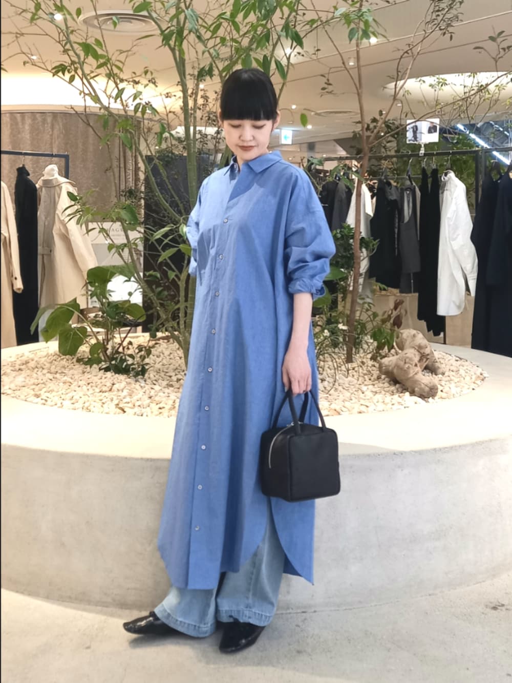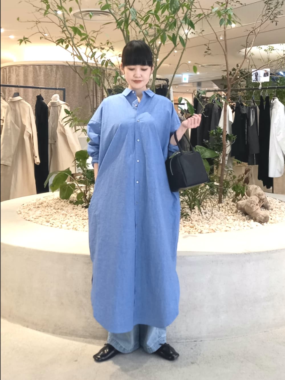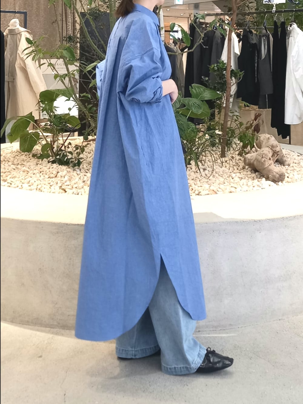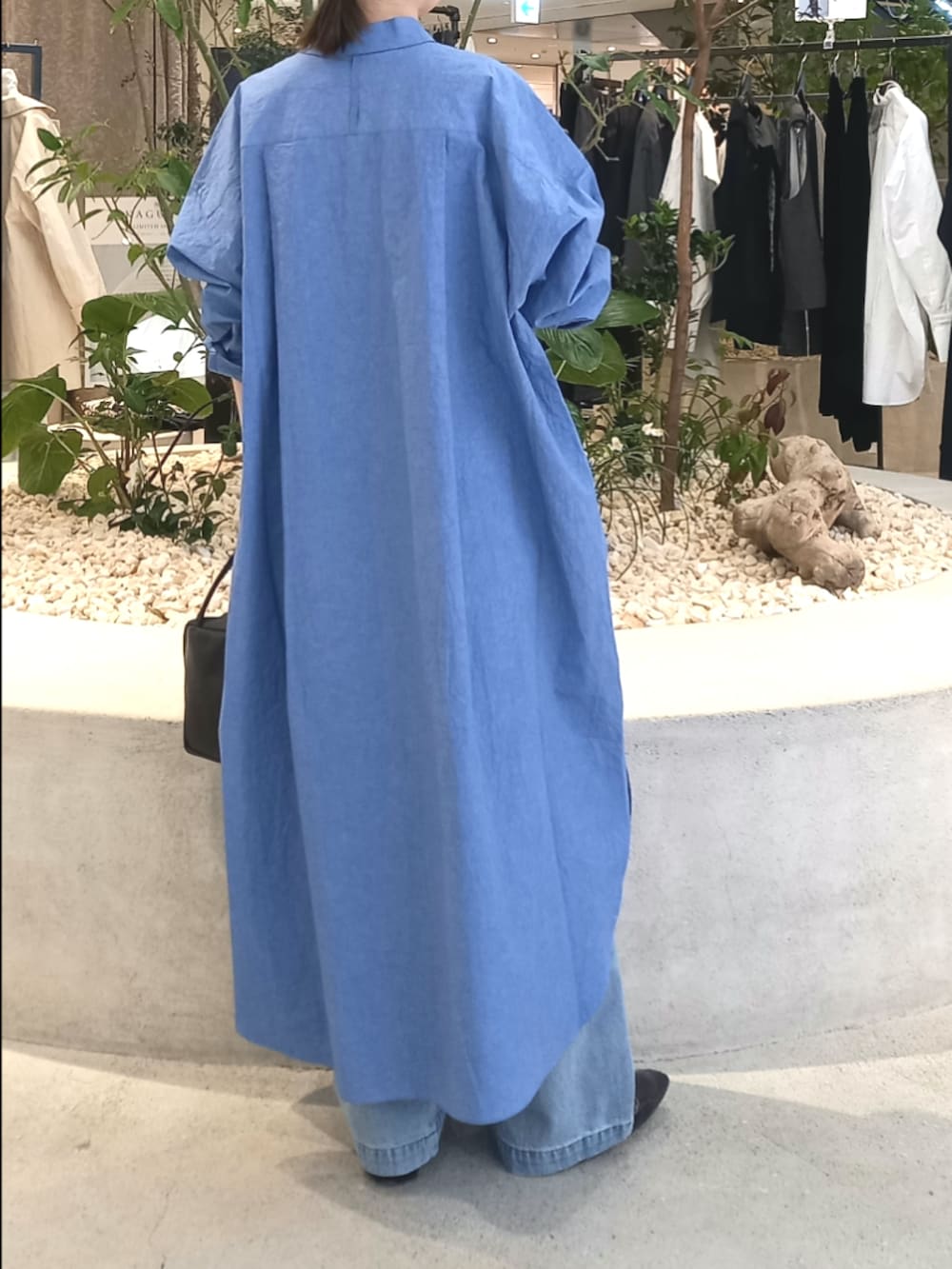前回ご紹介したシャツワンピースですがBLUEのカラーはスタッフ人気も高く、ハリのある生地感が上品な雰囲気にしてくれます。