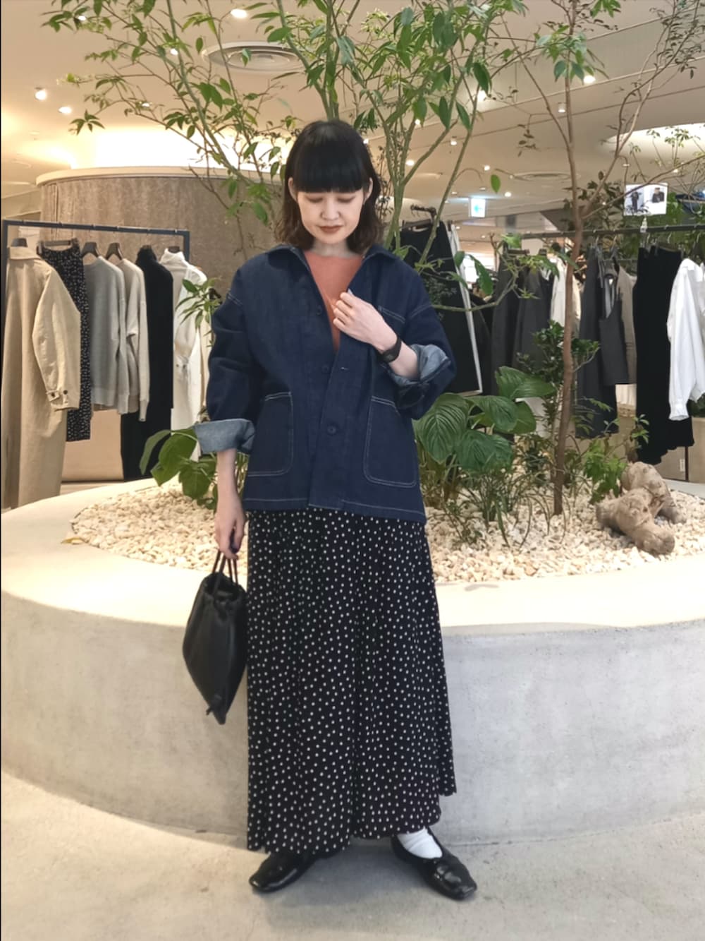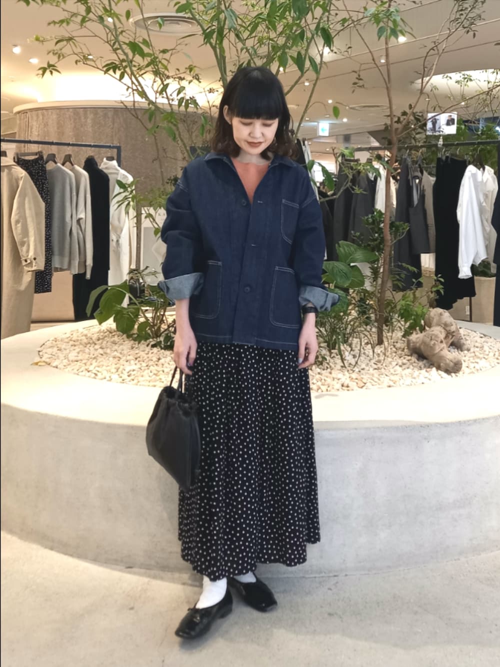 デニムと相性の良いPINKのニットと、私も愛用しているドットのスカートで春らしいスタイリングにしてみました。
