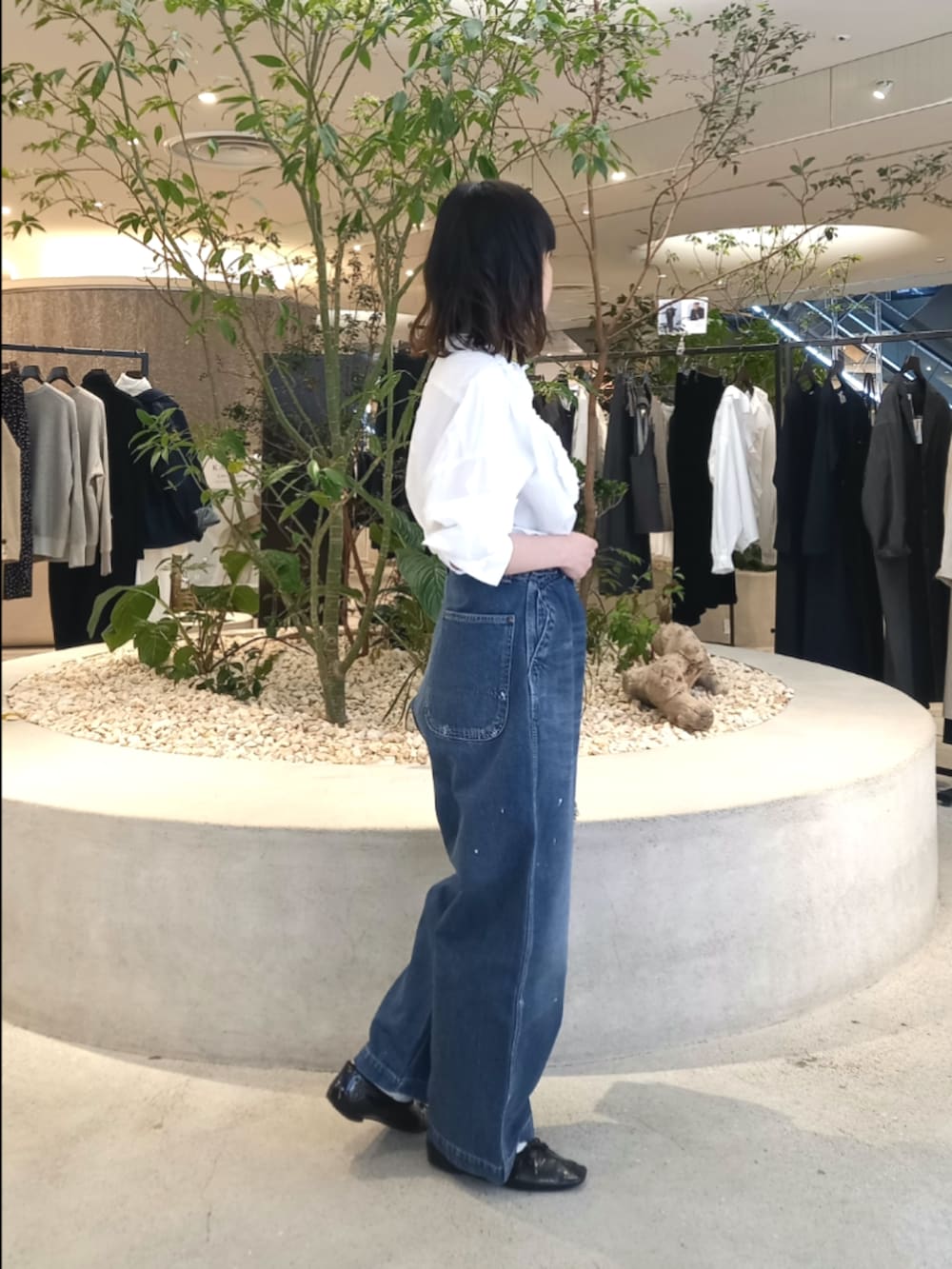 ヴィンテージっぽいデニムパンツはやや太めのシルエットで、ウエスト部分的を絞って調節していただけます。所々にペイントが入っているのもポイントです。