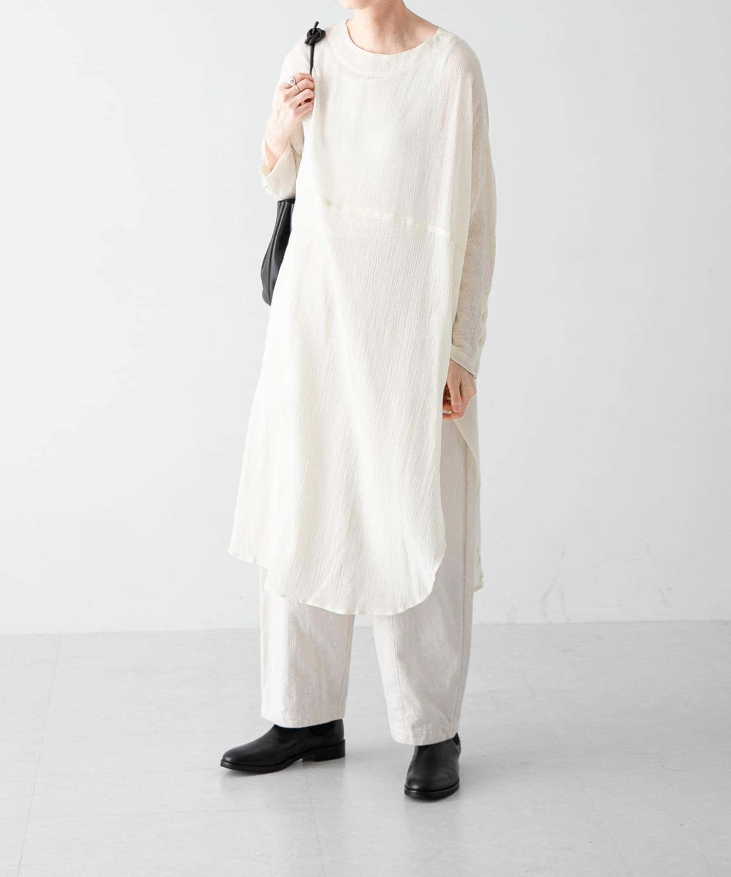 店頭でもオンラインショップでも大人気のガーゼロングチュニックは秋らしく、ベストやベロアパンツを合わせて新鮮に♪