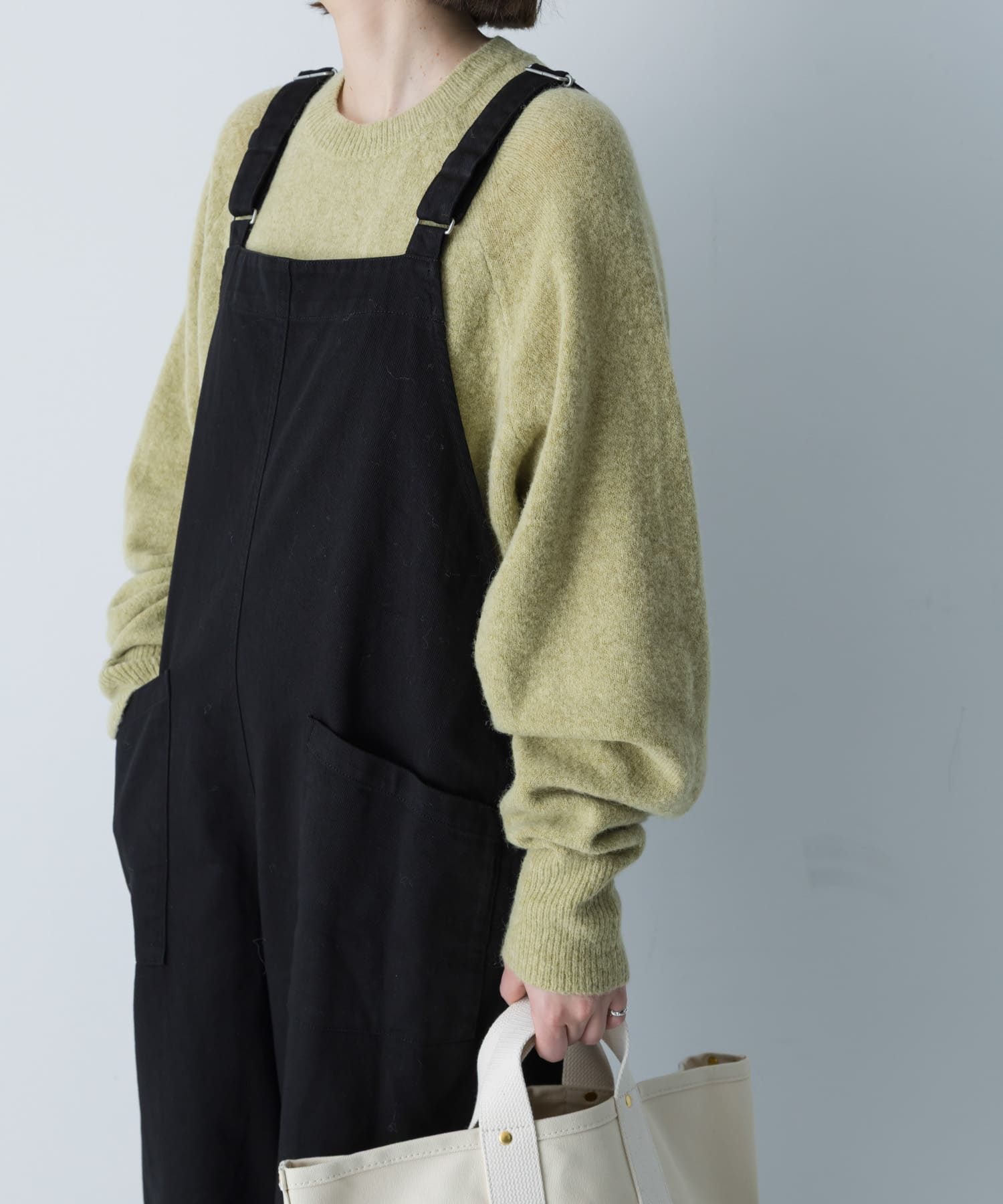 シンプルなクルーネックのニットは丈感が少しだけ短めなので、ボトムとのバランスが取りやすくパンツでもスカートでも◎