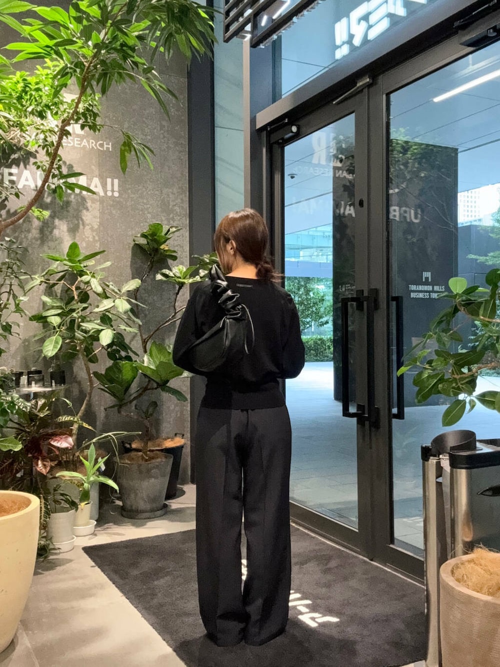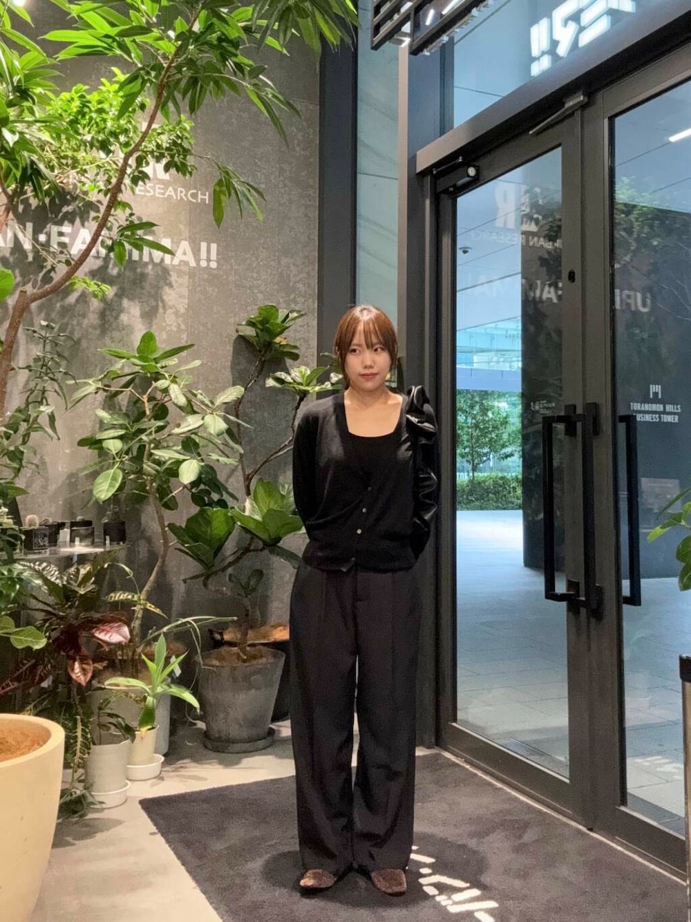 全身黒だと重たくなりがちなので、Vネックのカーディガンで首元を出しました!