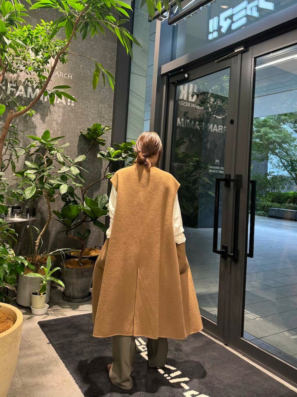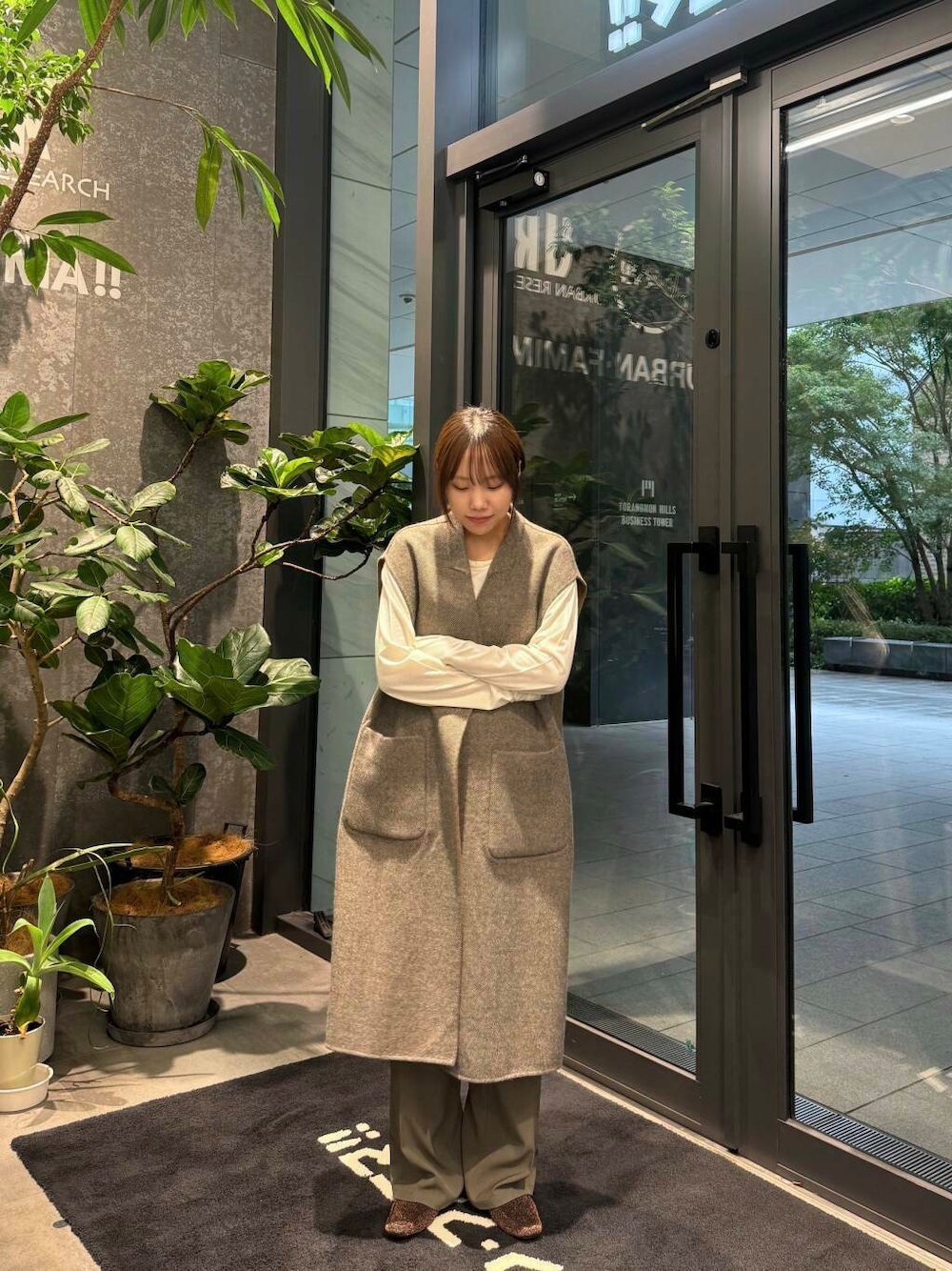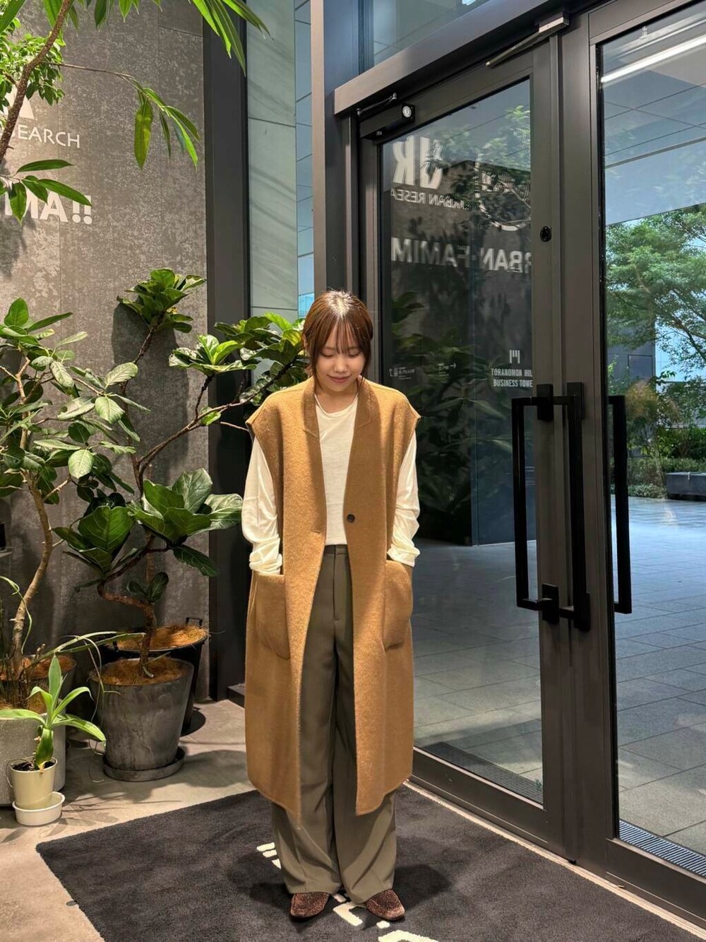 トップスやパンツはロングジレのトーンに合わせて選び、小物で差し色を加えるとバランスがいいです♪