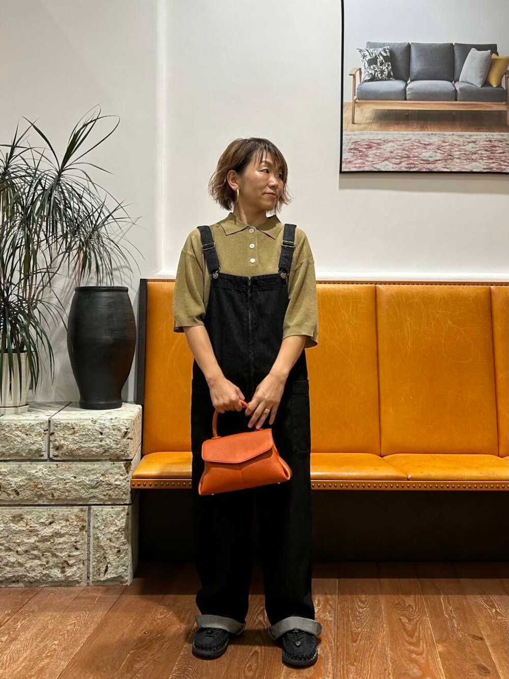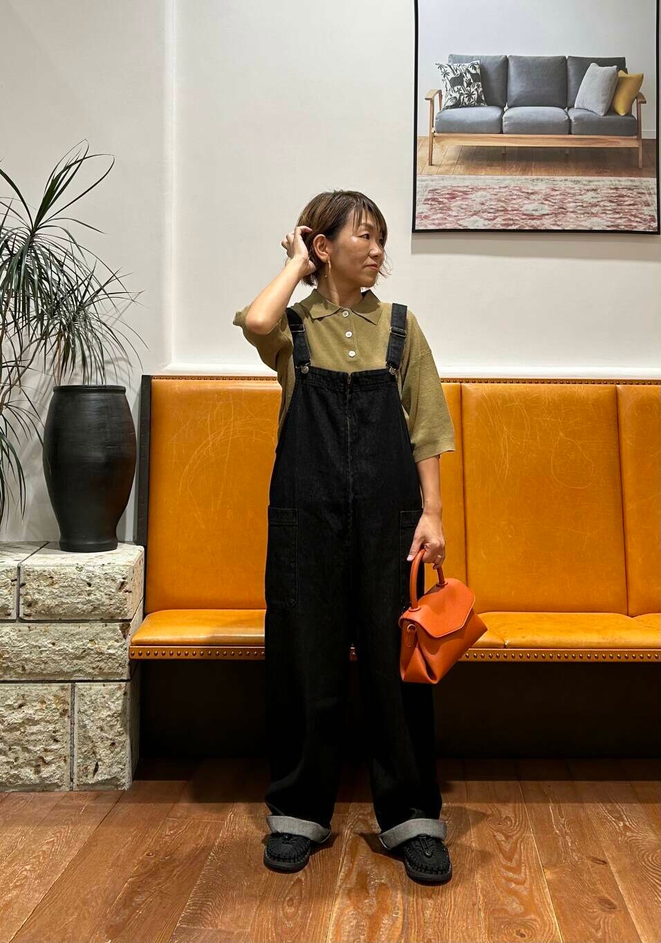 トップスには、柔らかなシルエットのニットポロで、フェミニンに。
