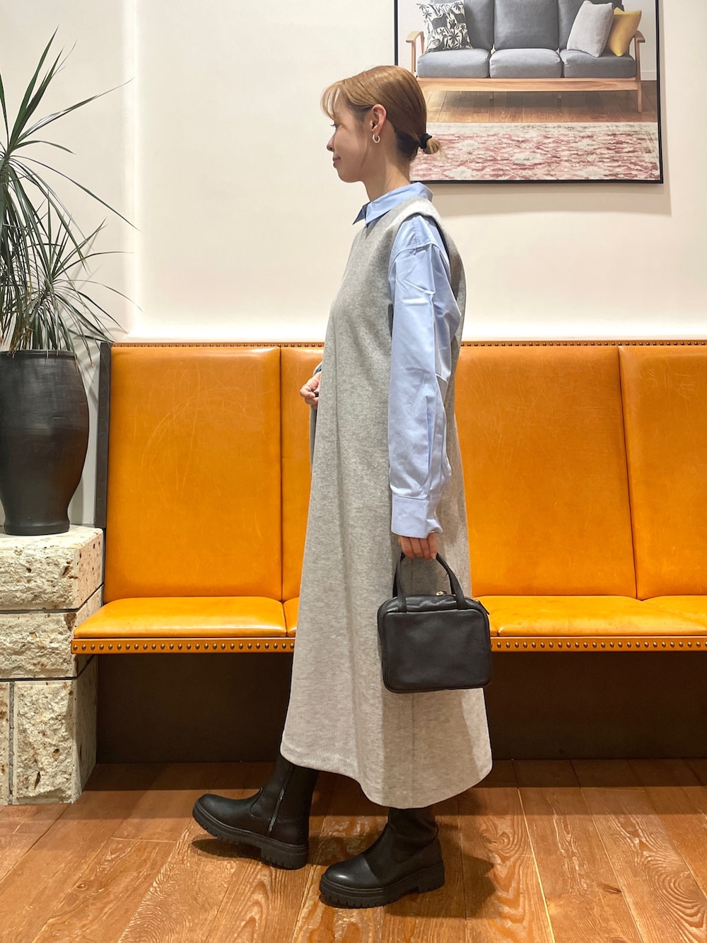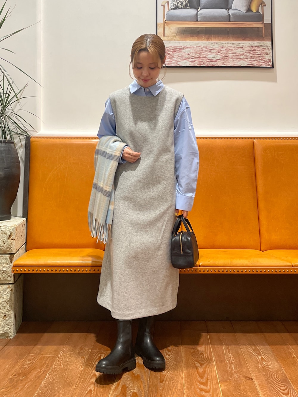 ジャンパースカートはウールライクな素材感が暖かみがあり、裏地も付いているので寒い日でも安心して着用して頂けます。