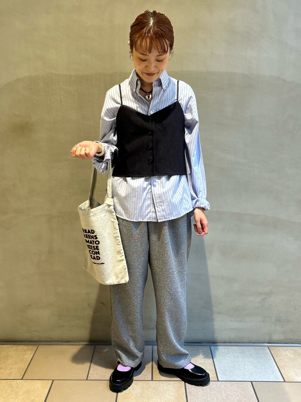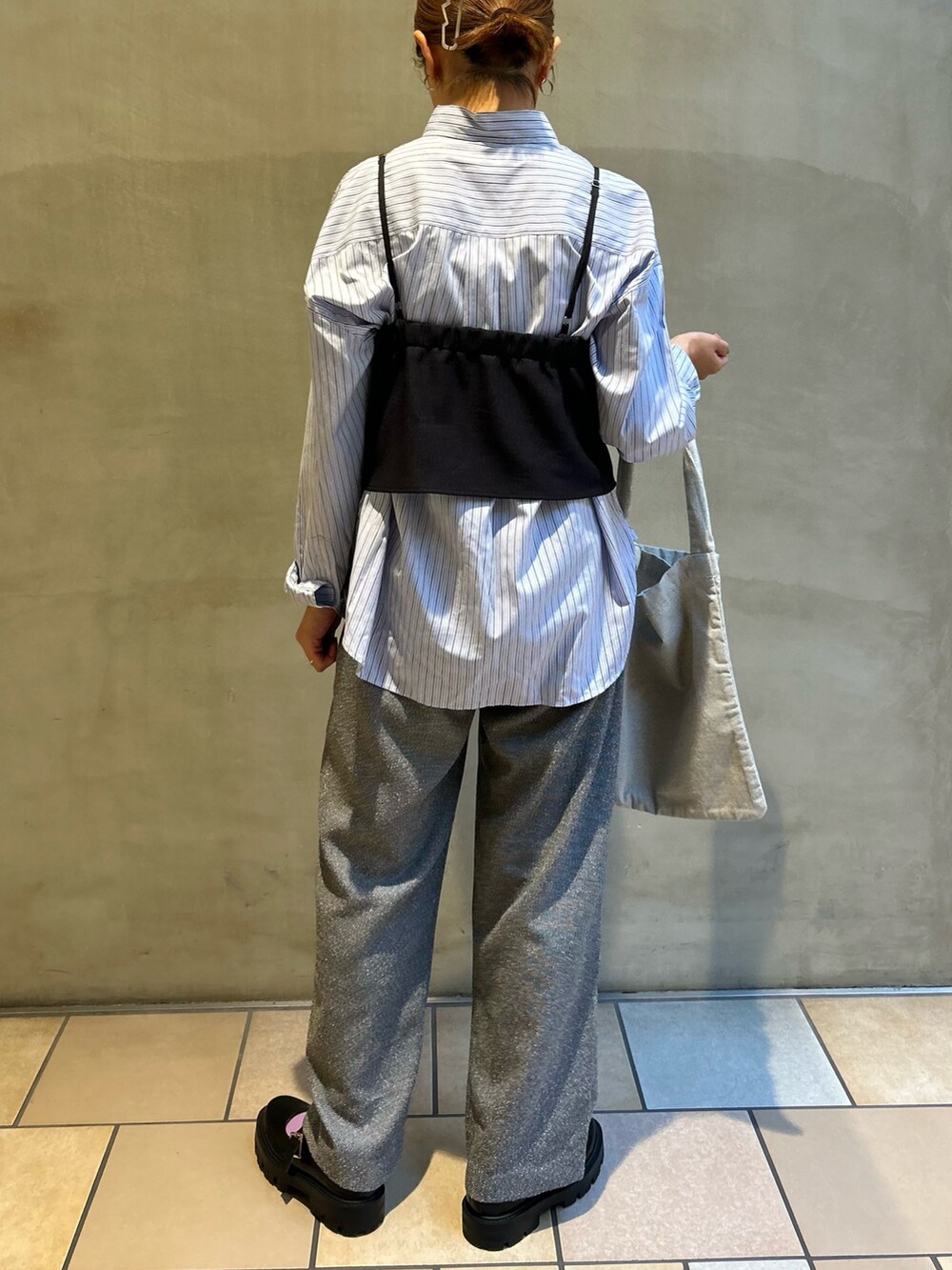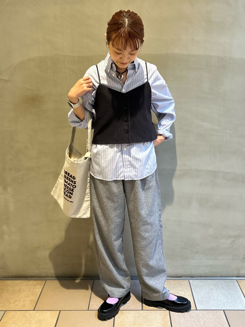 シャツ✖️ビスチェでカッチリし過ぎないように、ツイードのイージーパンツで楽ちんコーデです。