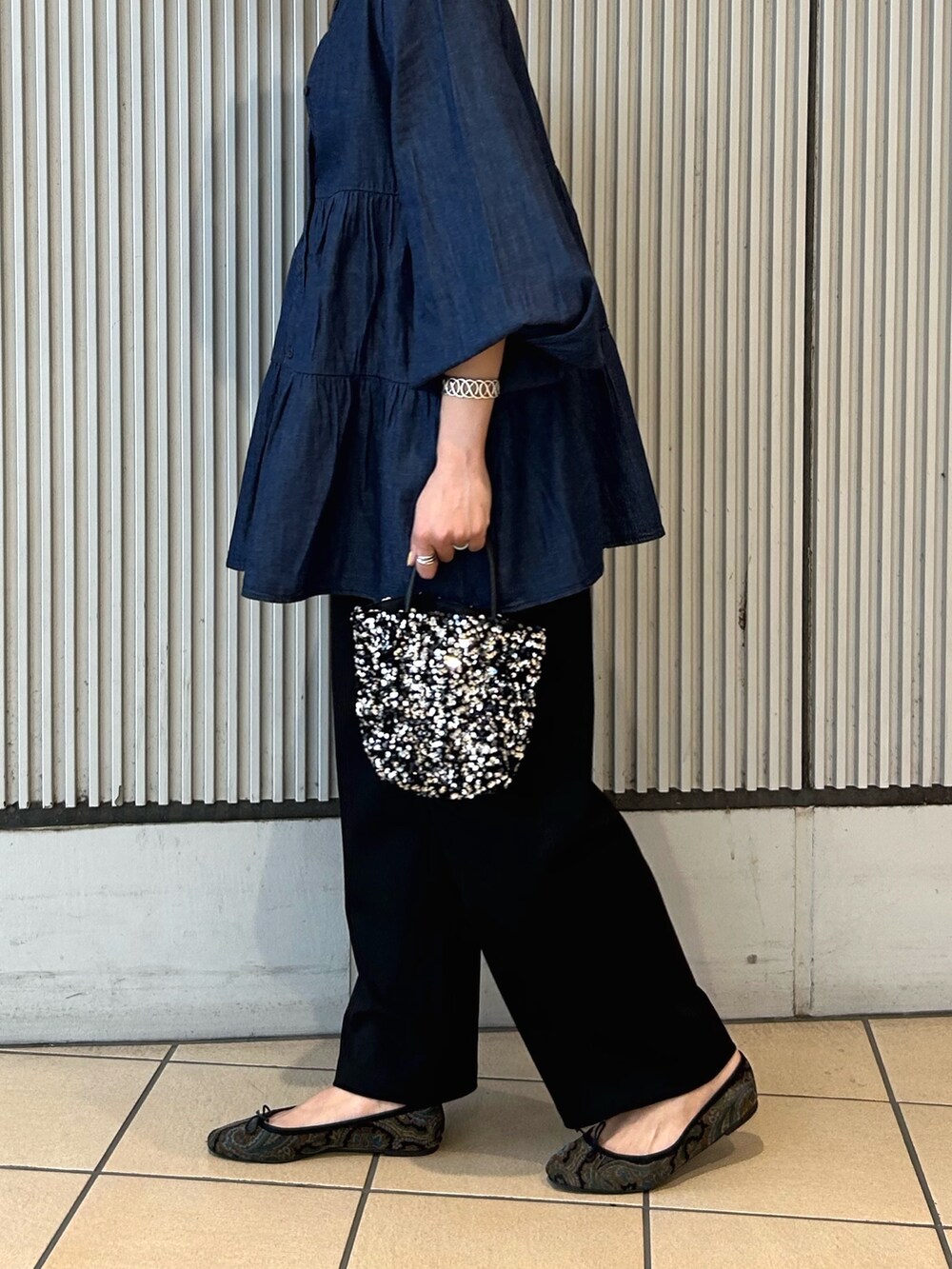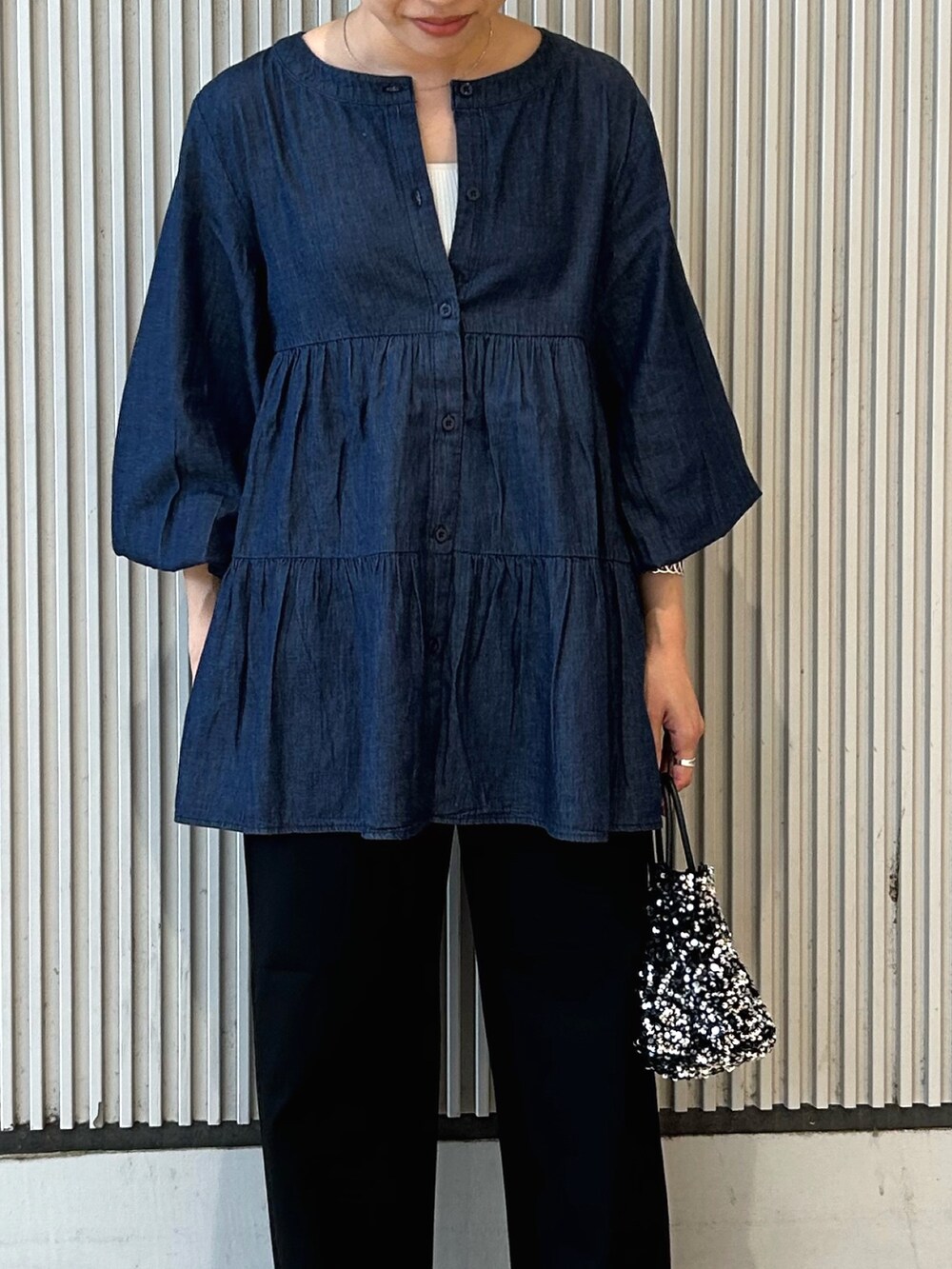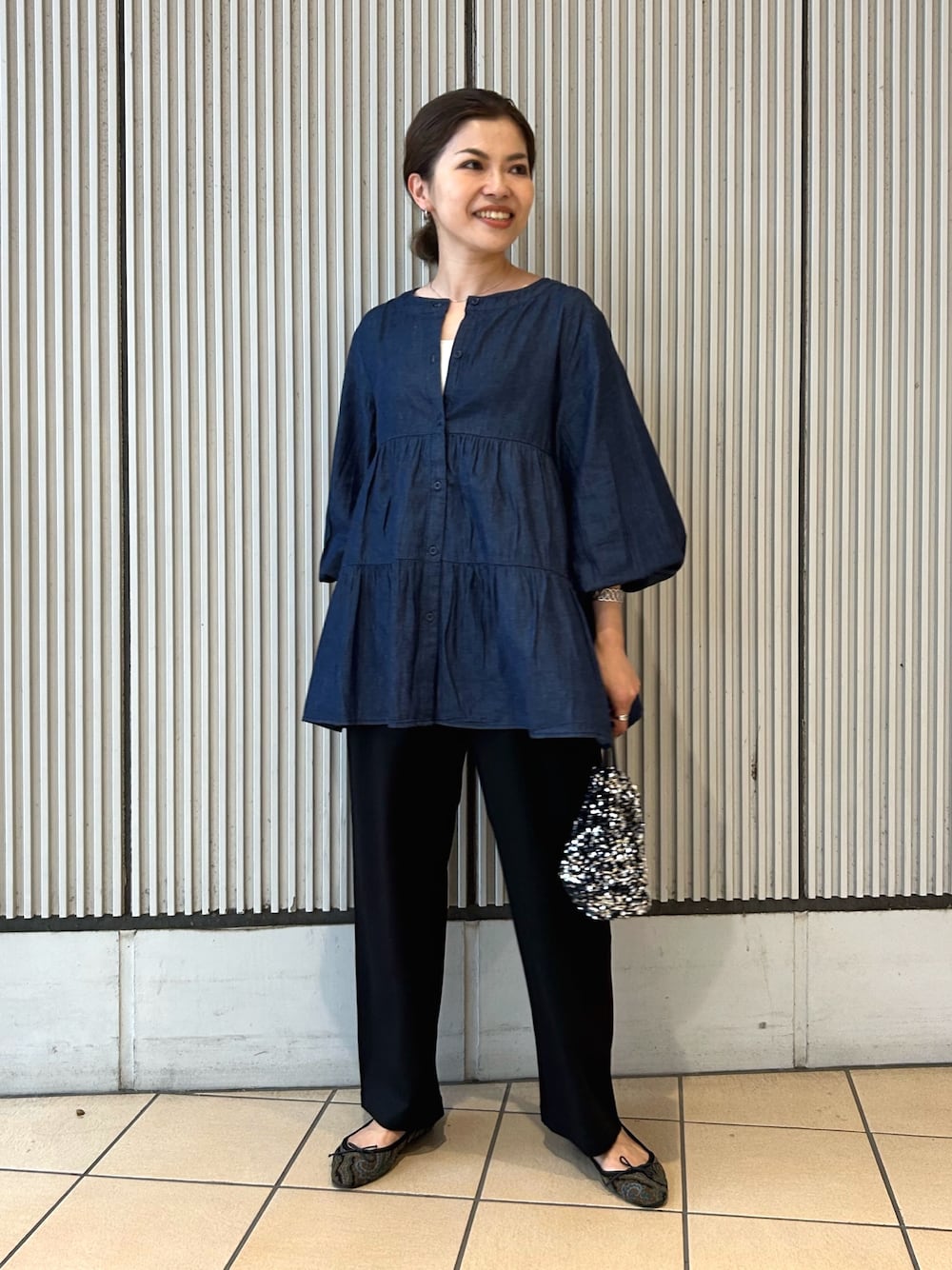 新作のデニムブラウスは切り替えが高い位置にあってスタイルアップが出来、程よいボリューム感で着映えるので秋のお出かけにもぴったりです🙆♀️