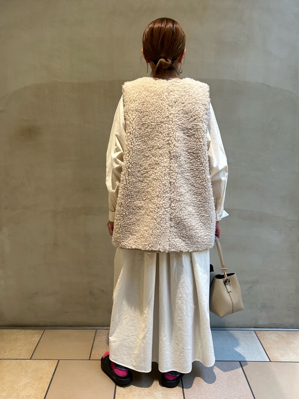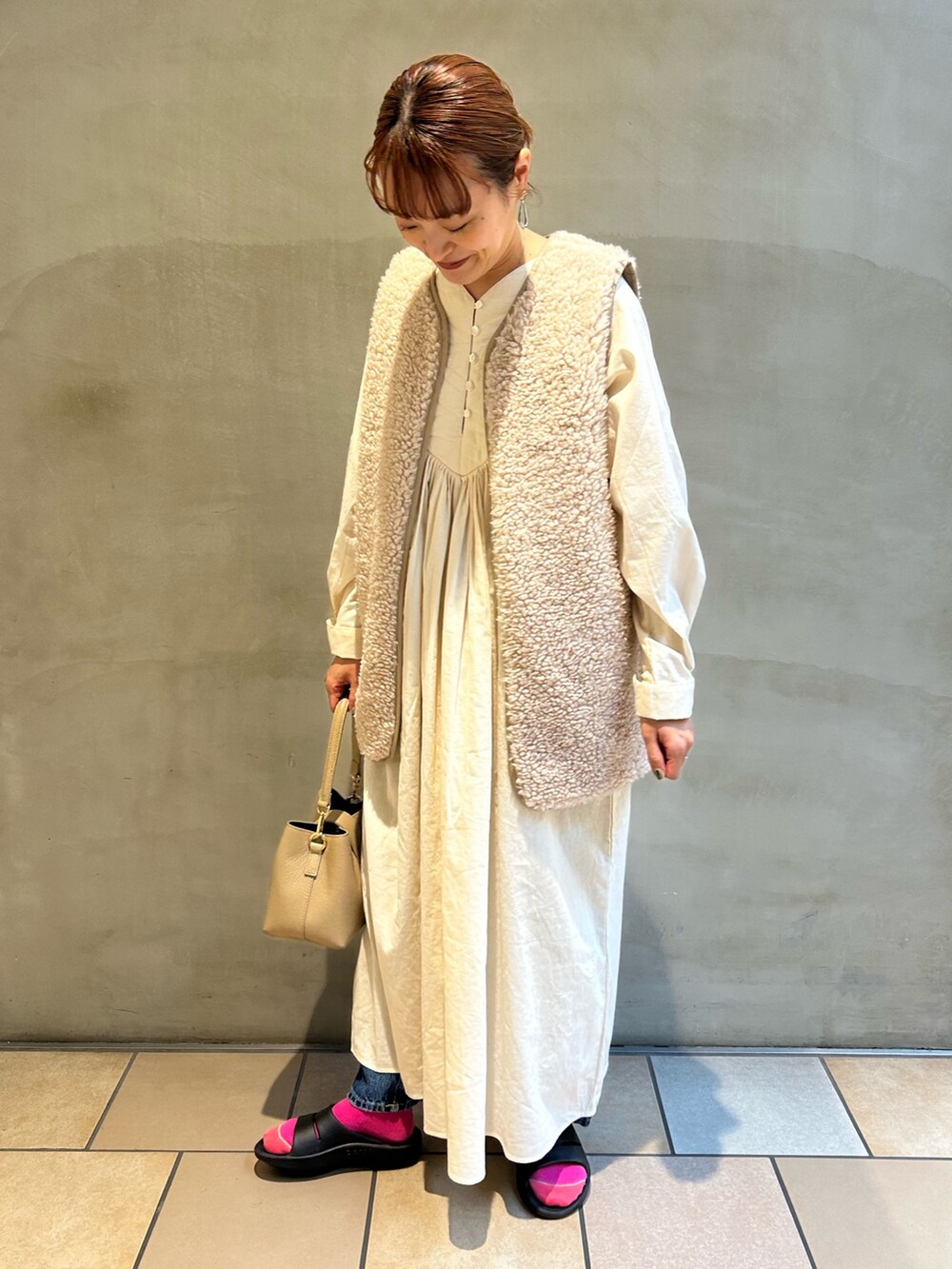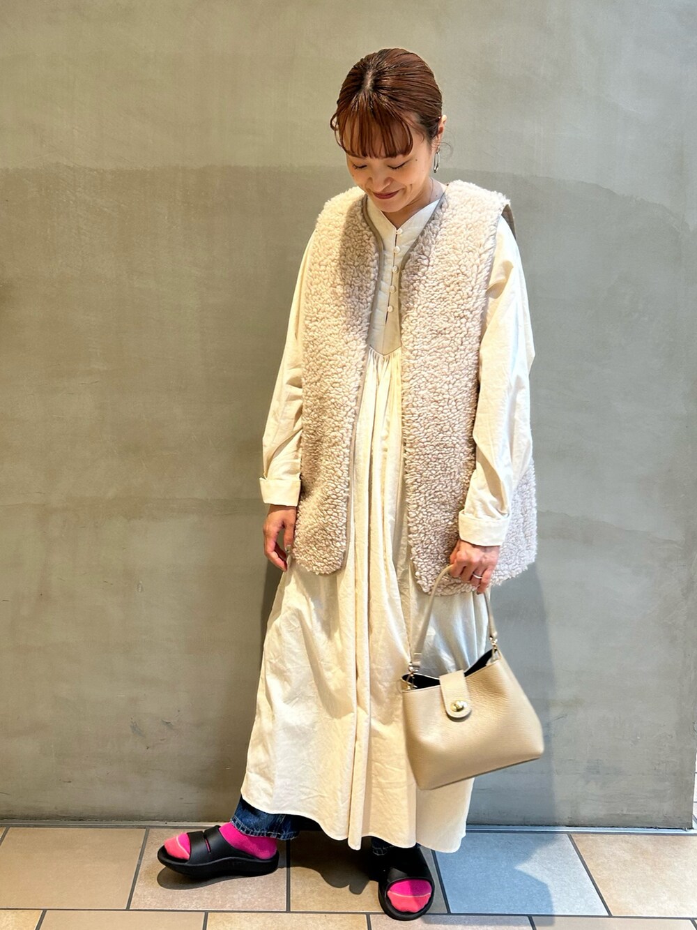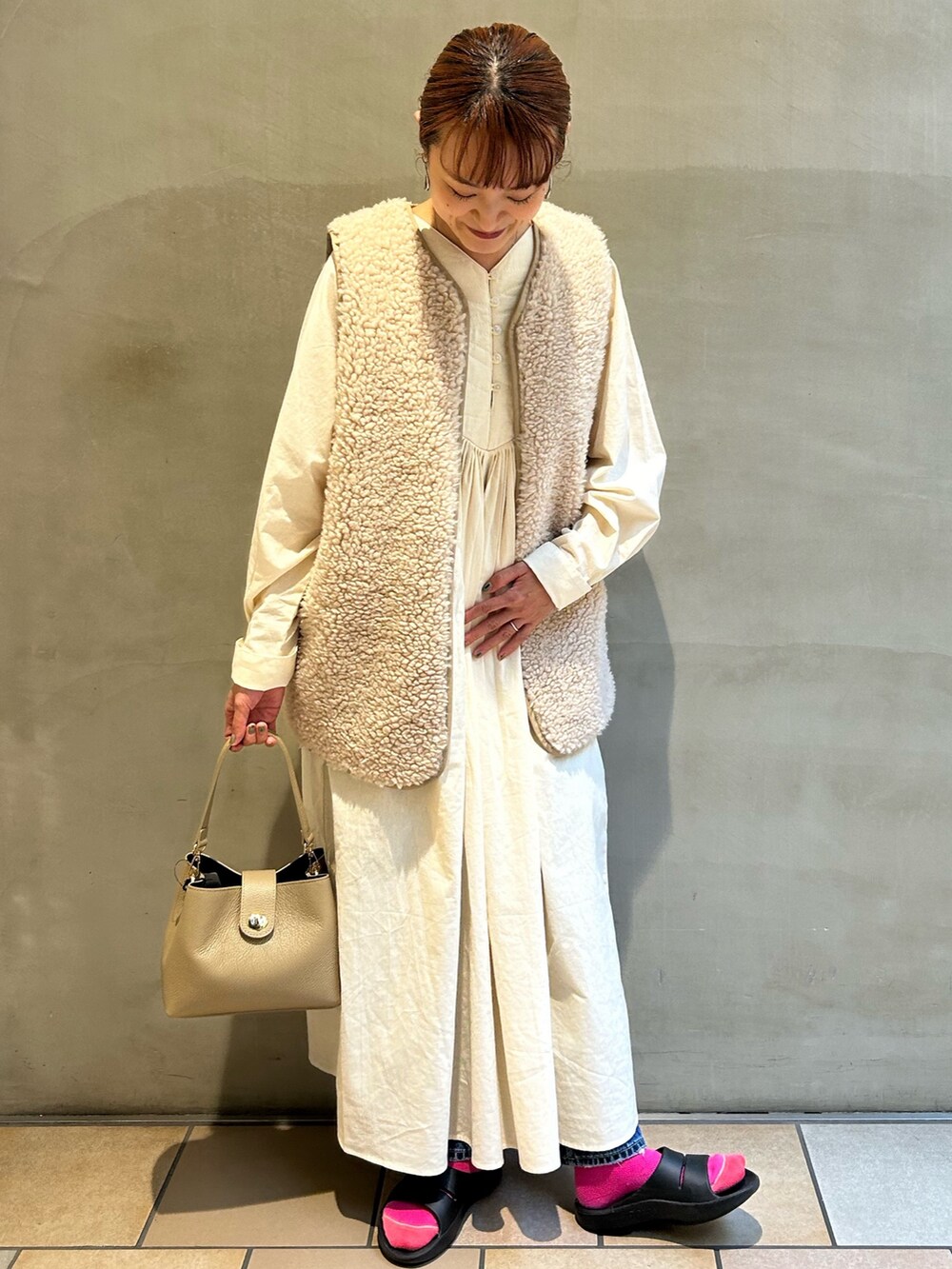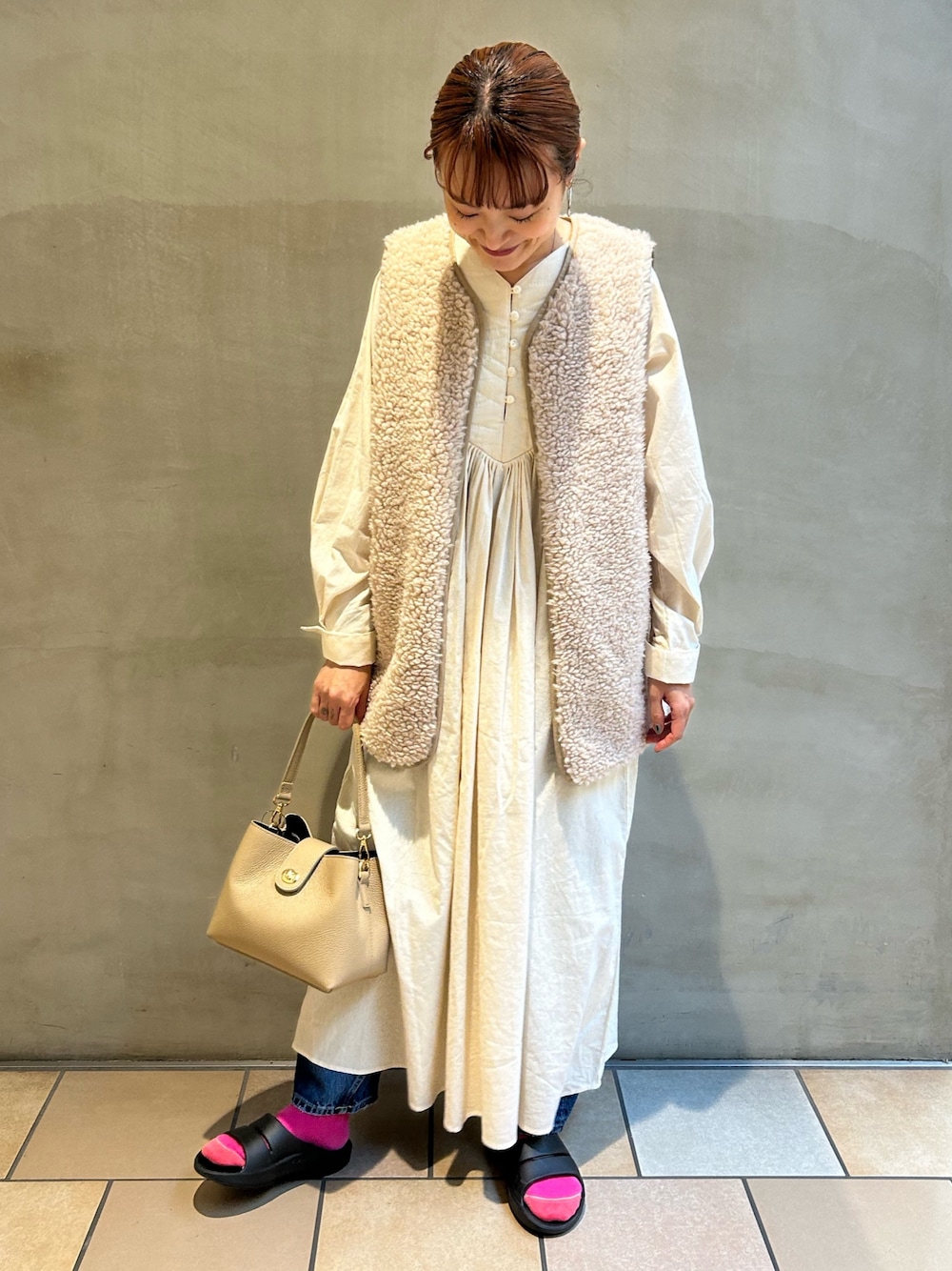 ワンピースは丈感のバランスも丁度良く、胸元のキルティング仕様が可愛いです。