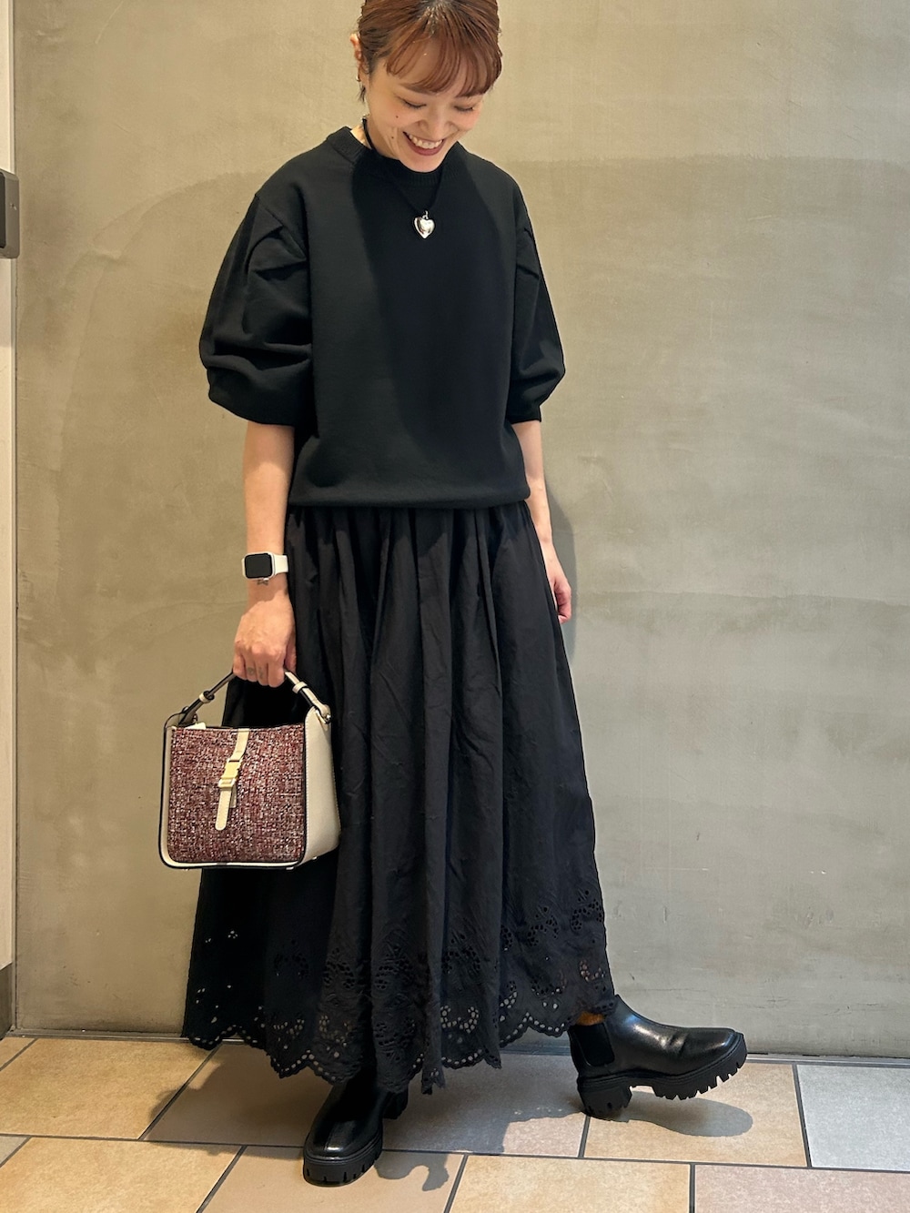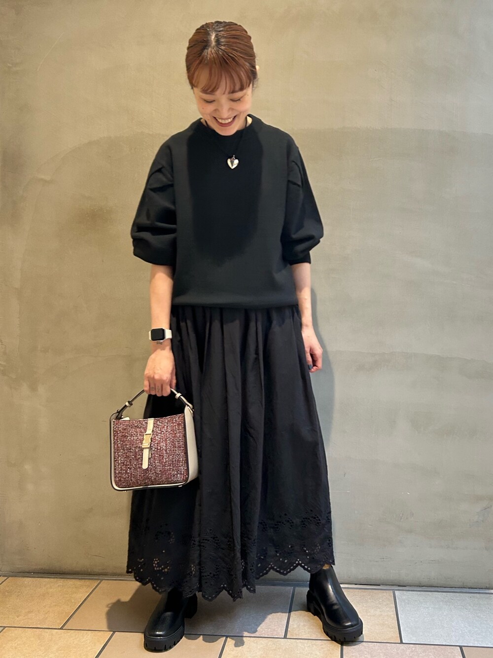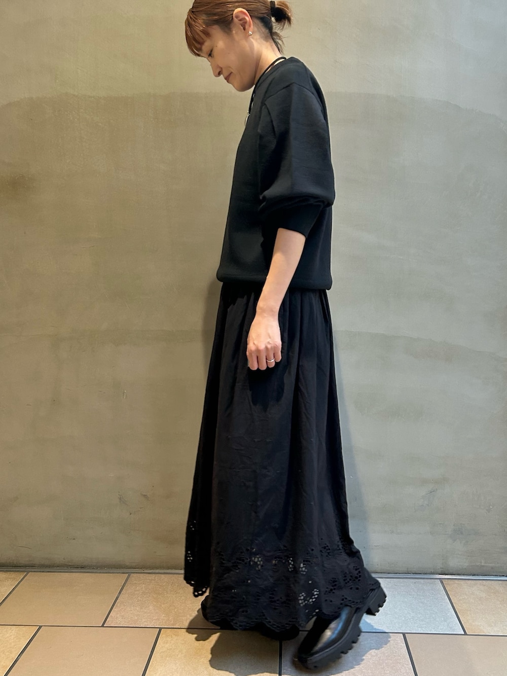 レーススカートと合わせて、ブラックコーデでお出かけスタイルです。
