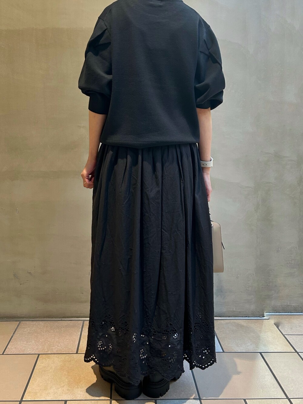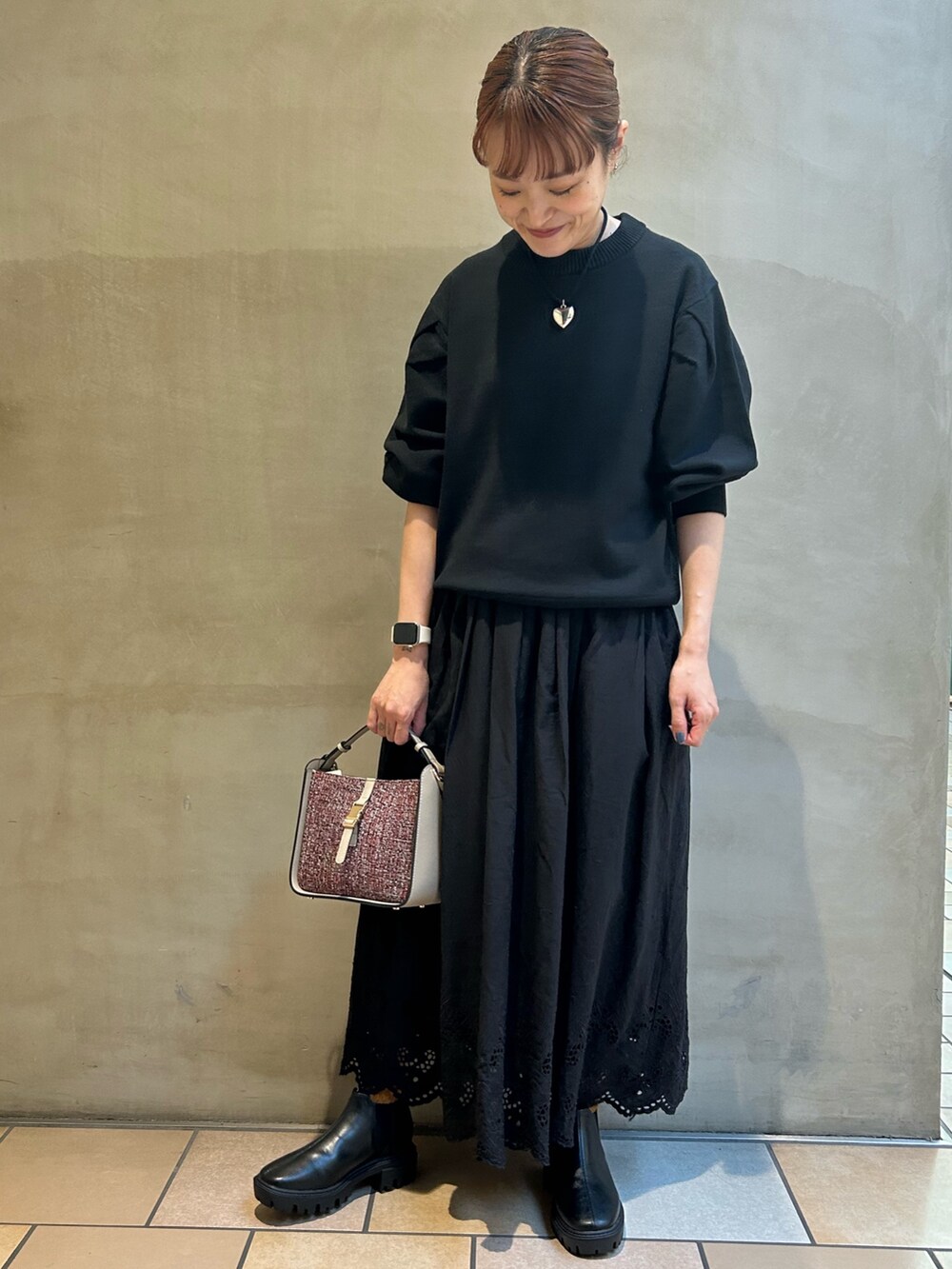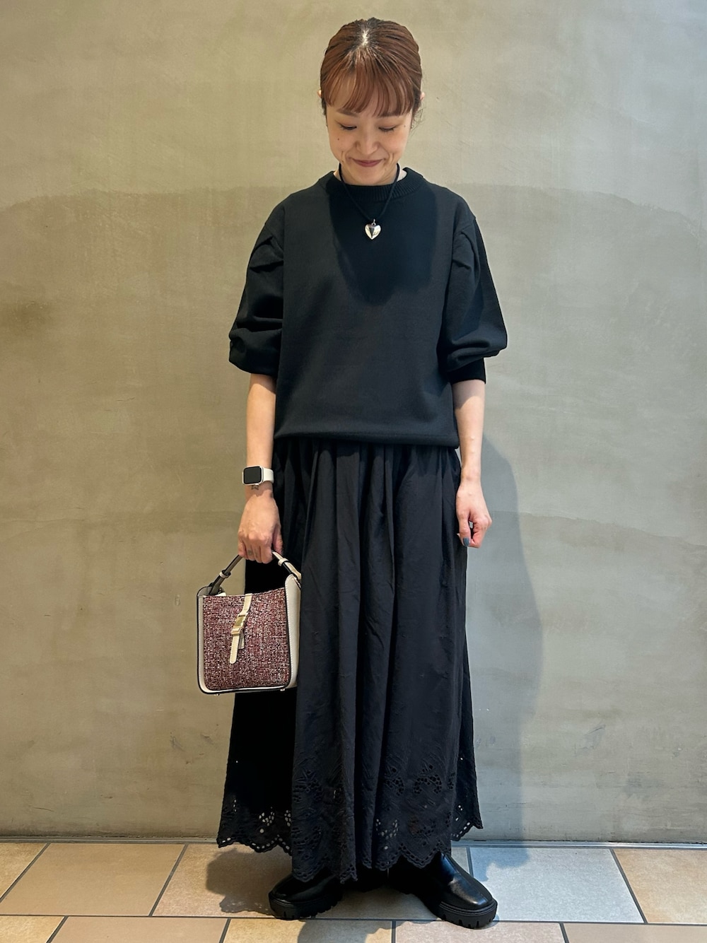 レーススカートと合わせて、ブラックコーデでお出かけスタイルです。