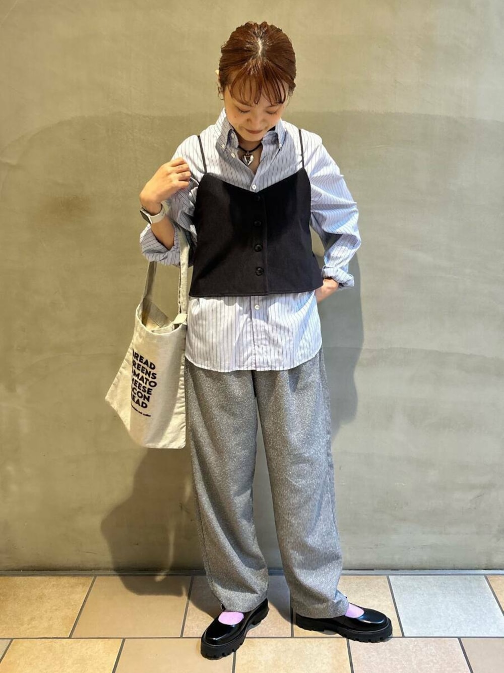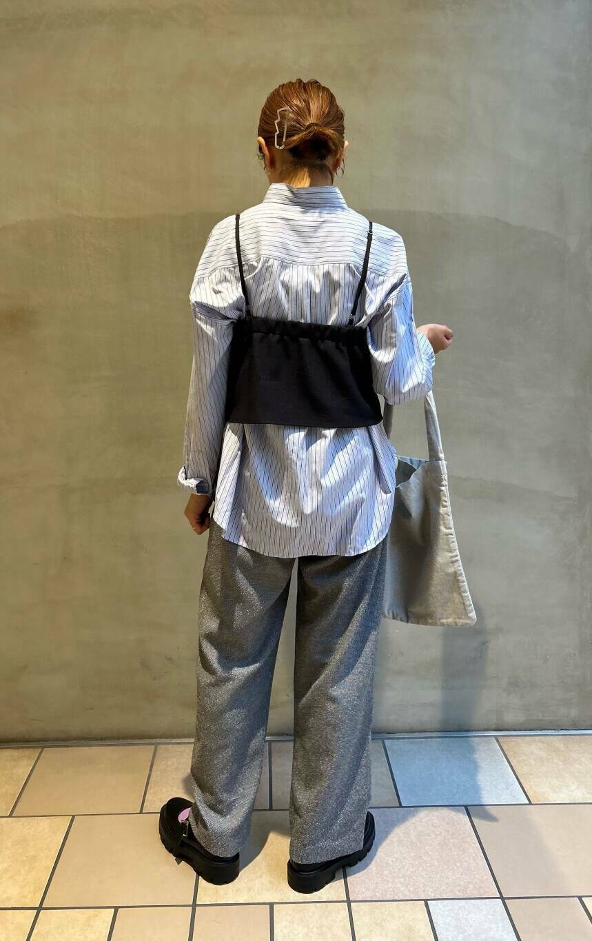 シャツ✖️ビスチェでカッチリし過ぎないように、ツイードのイージーパンツで楽ちんコーデです。