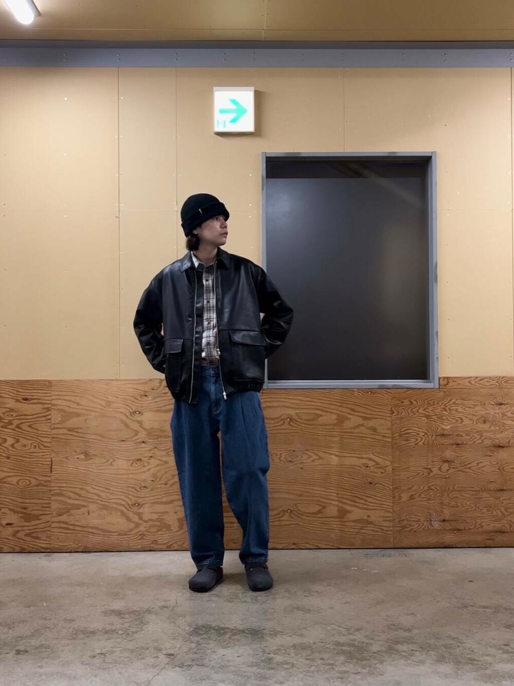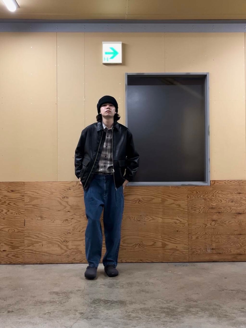 ポイントとしてはチェックシャツインににゆるめのパンツです