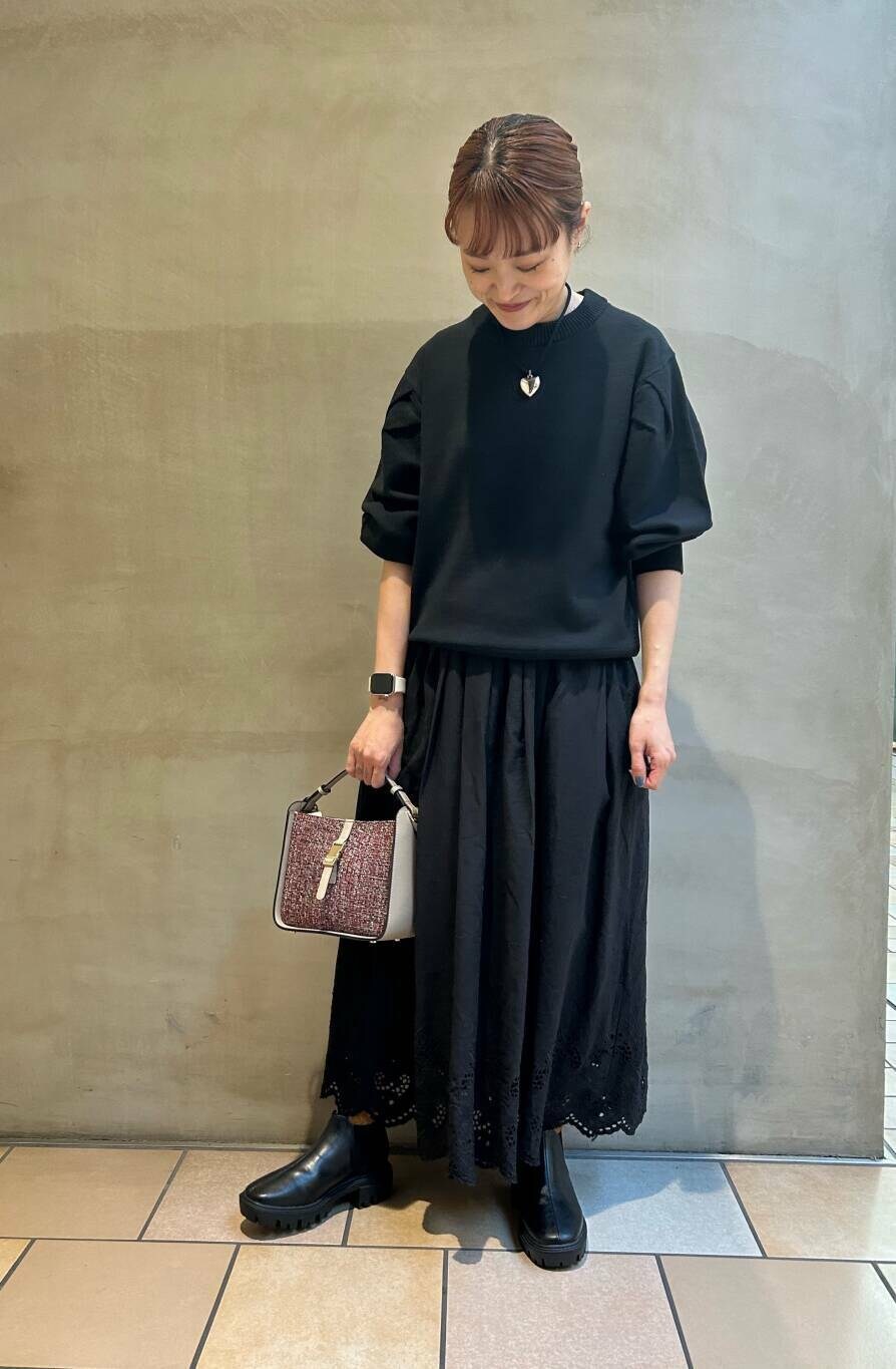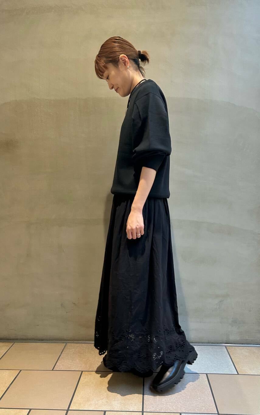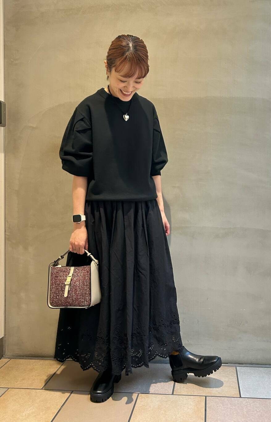 レーススカートと合わせて、ブラックコーデでお出かけスタイルです。