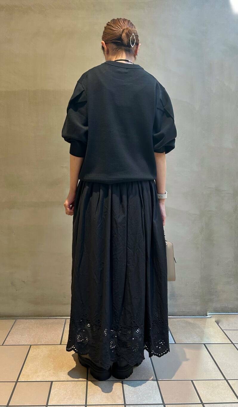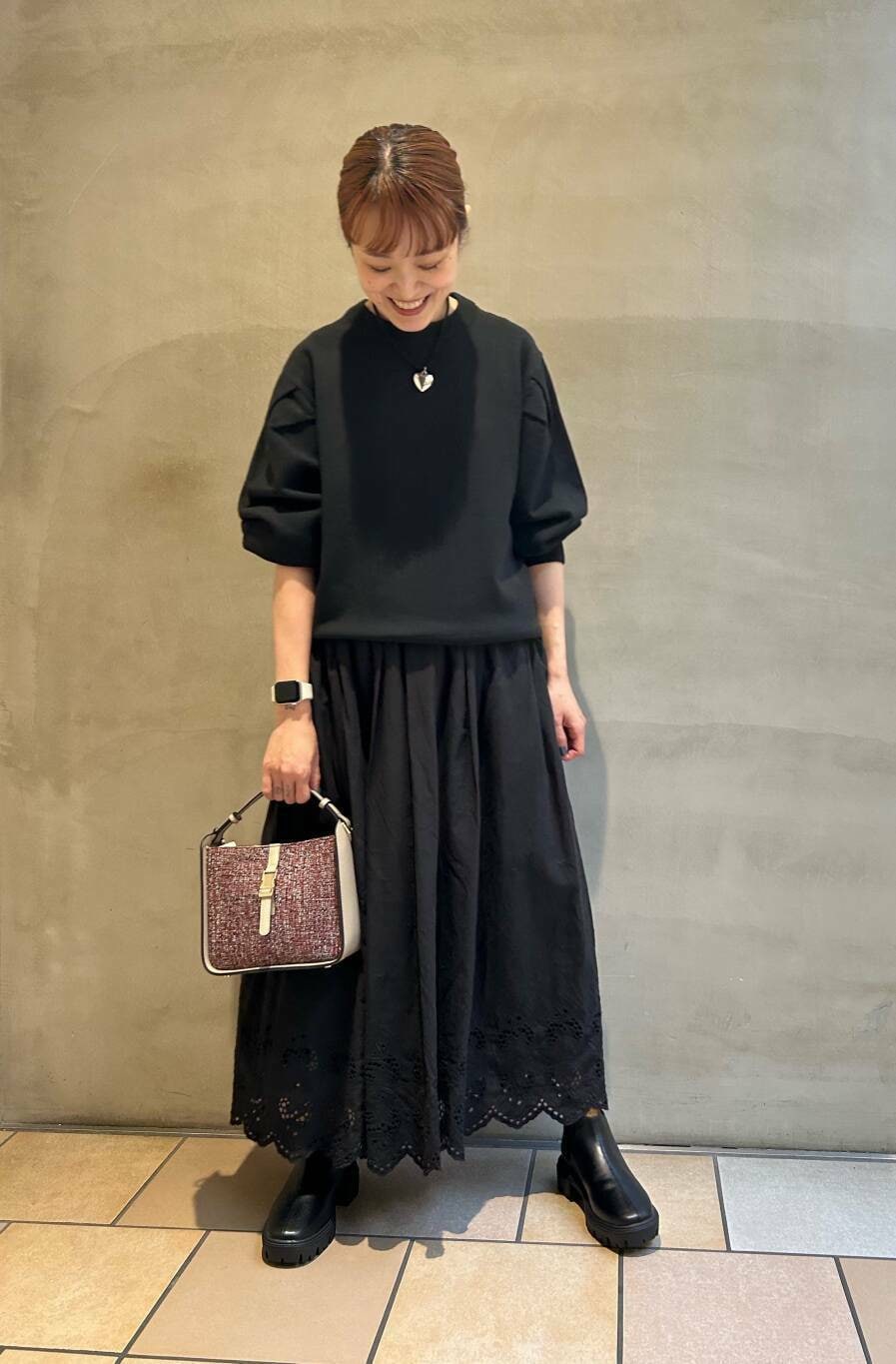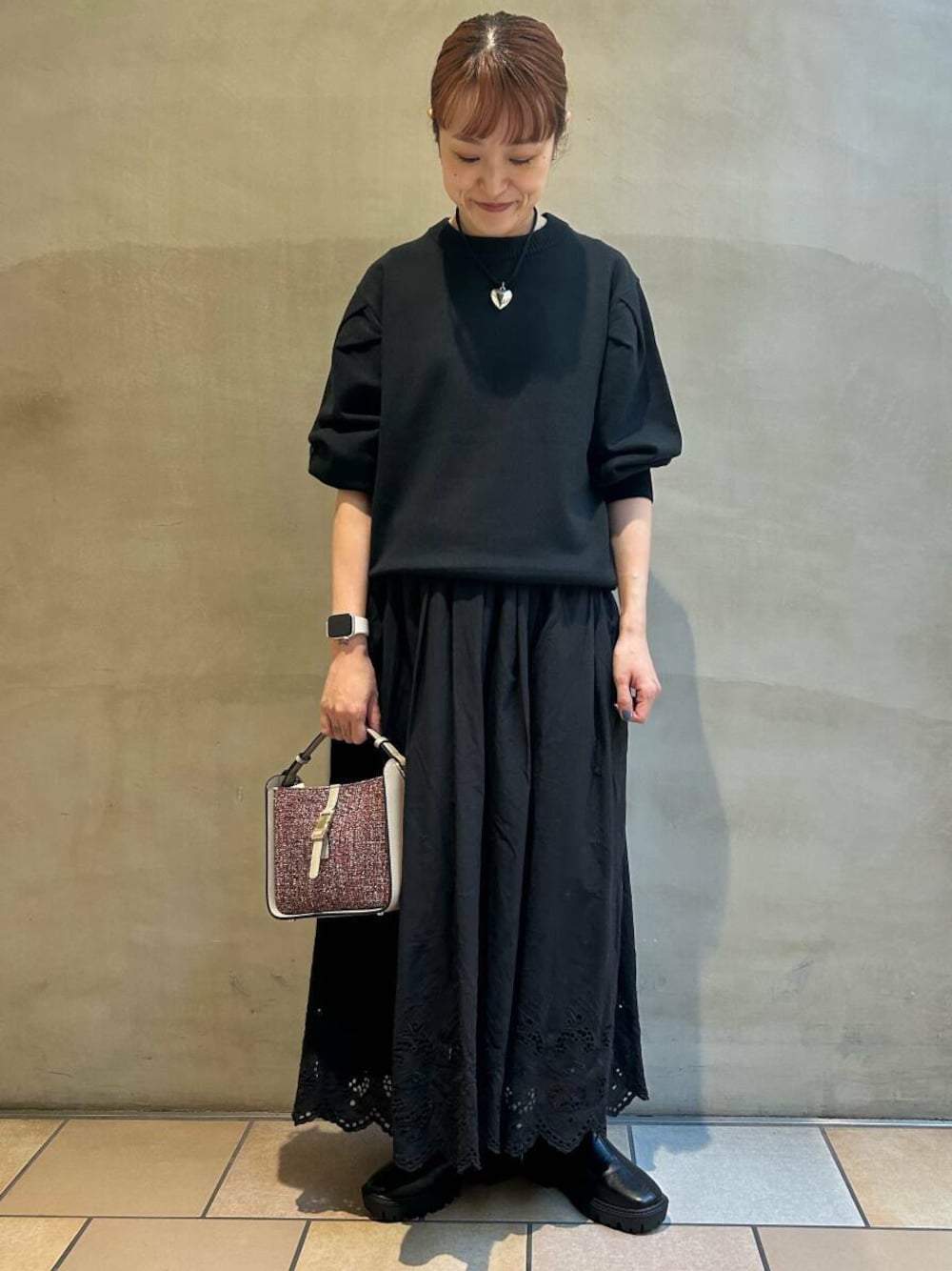レーススカートと合わせて、ブラックコーデでお出かけスタイルです。