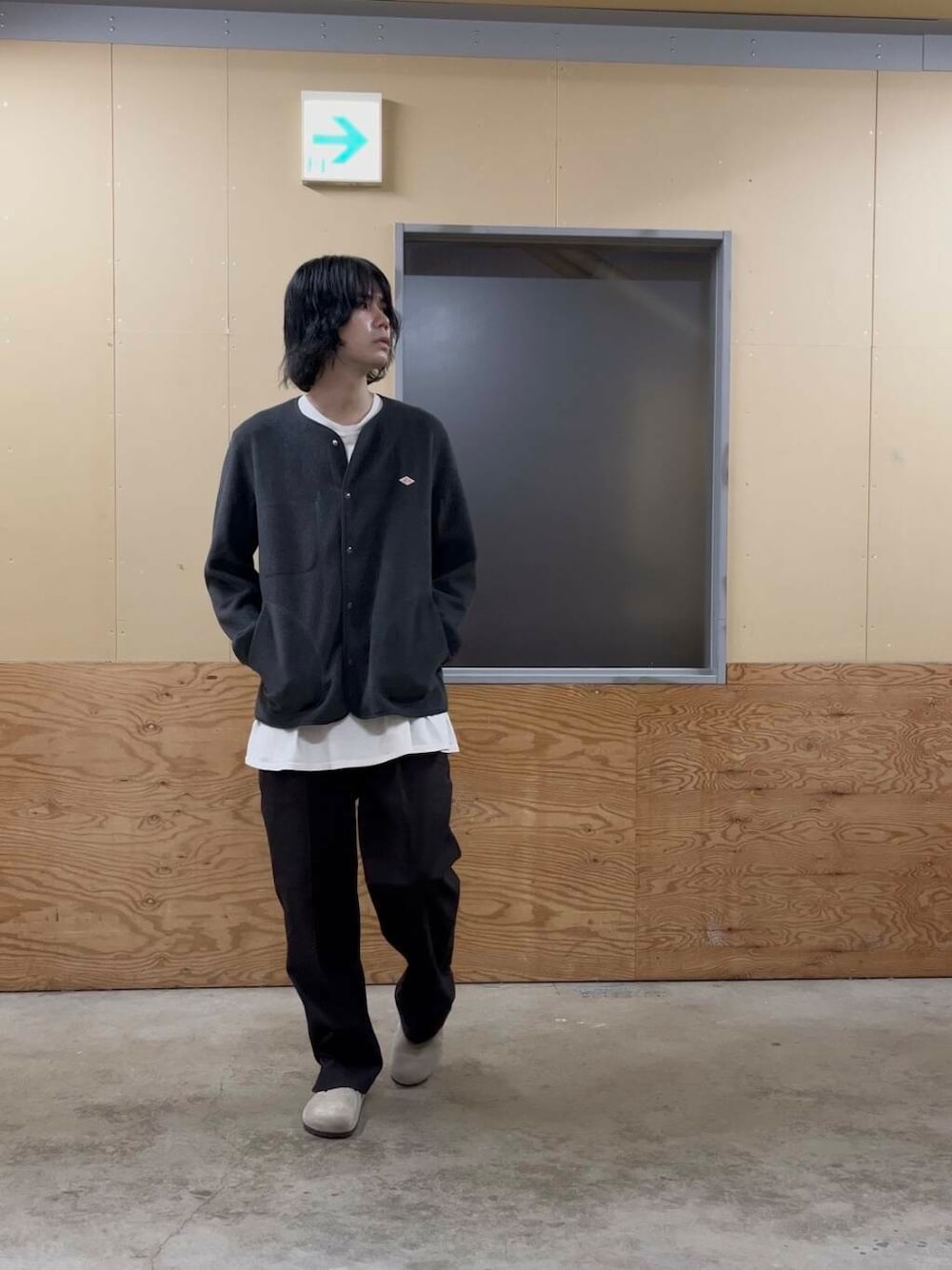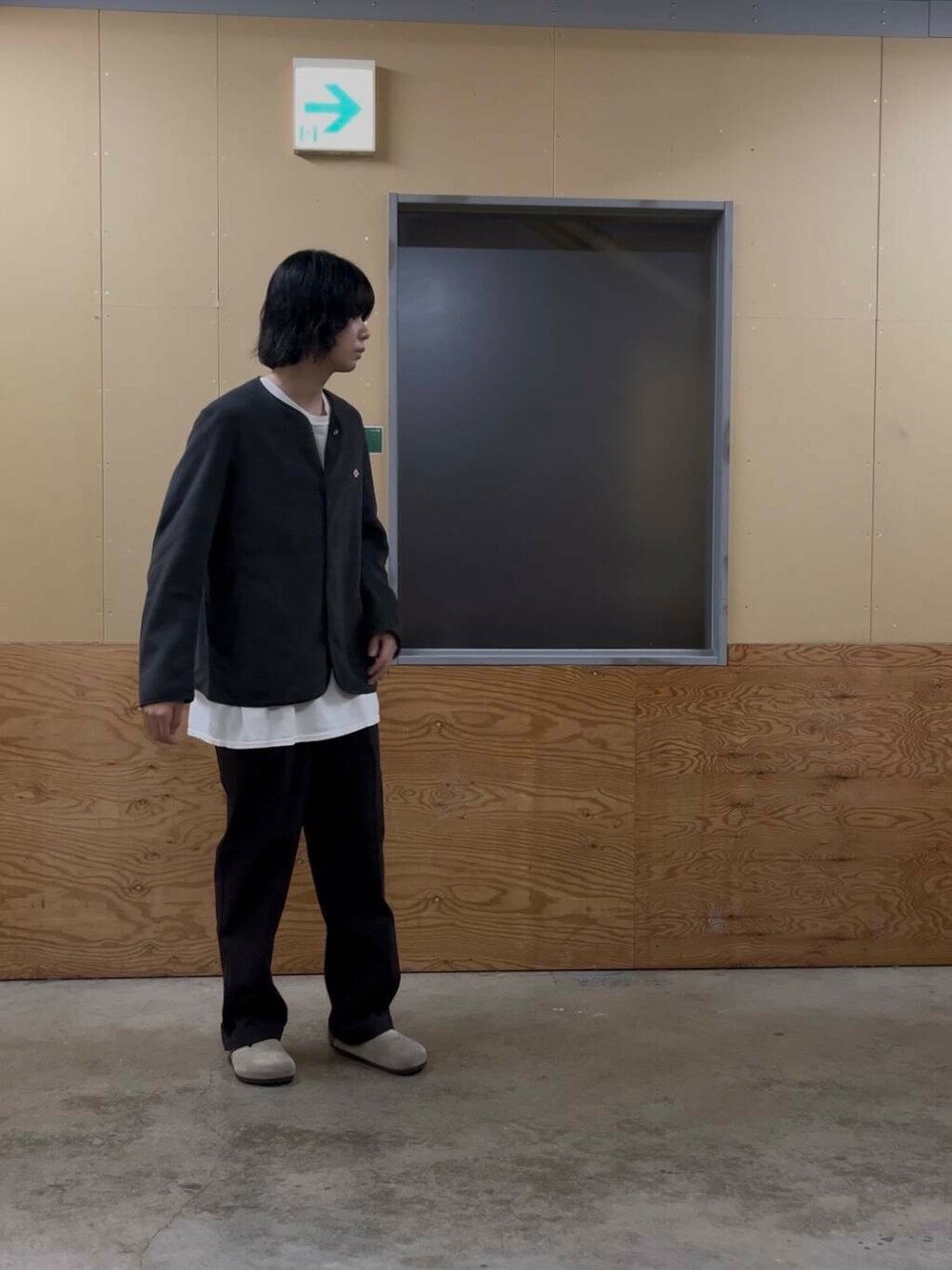 今はtシャツの上に着てますが、これからの時期はノーカラータイプなのでシャツやフーディー、カーディガンをレイヤードしてもカッコよく決まります!