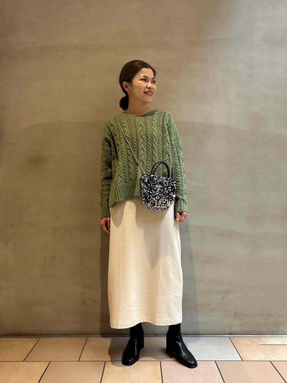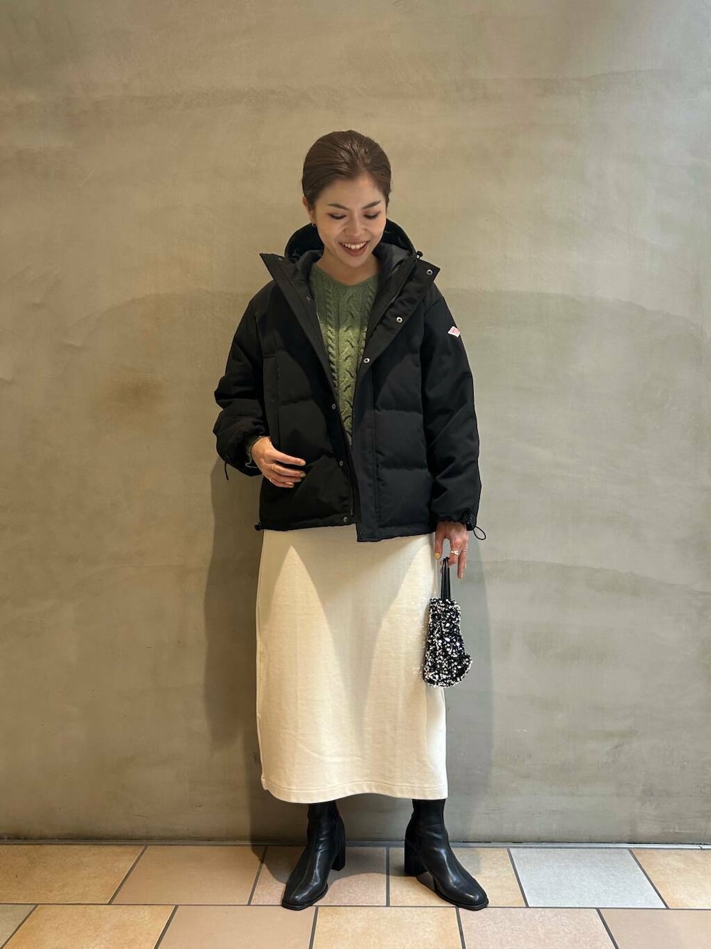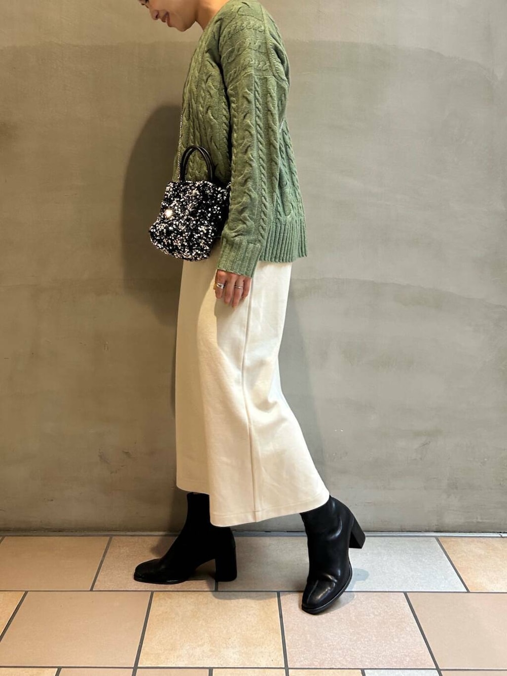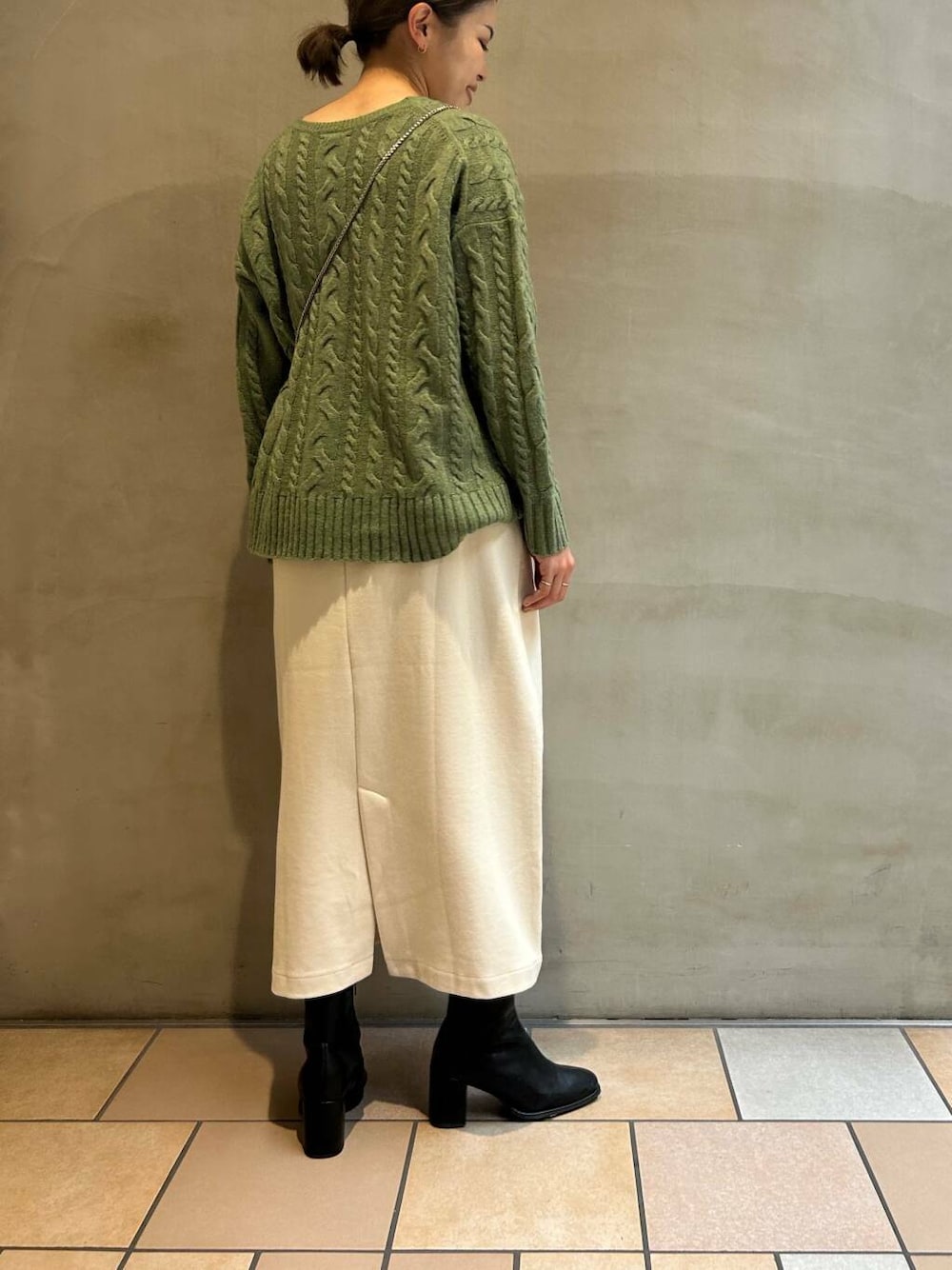 中のニットは、定番人気のハミルトンウールのケーブルニットです🧶ニットの中でも薄手の生地なので、アウターを着ても嵩張らずにあったかく着れるのでこれから冬のお出かけにもおすすめです!!