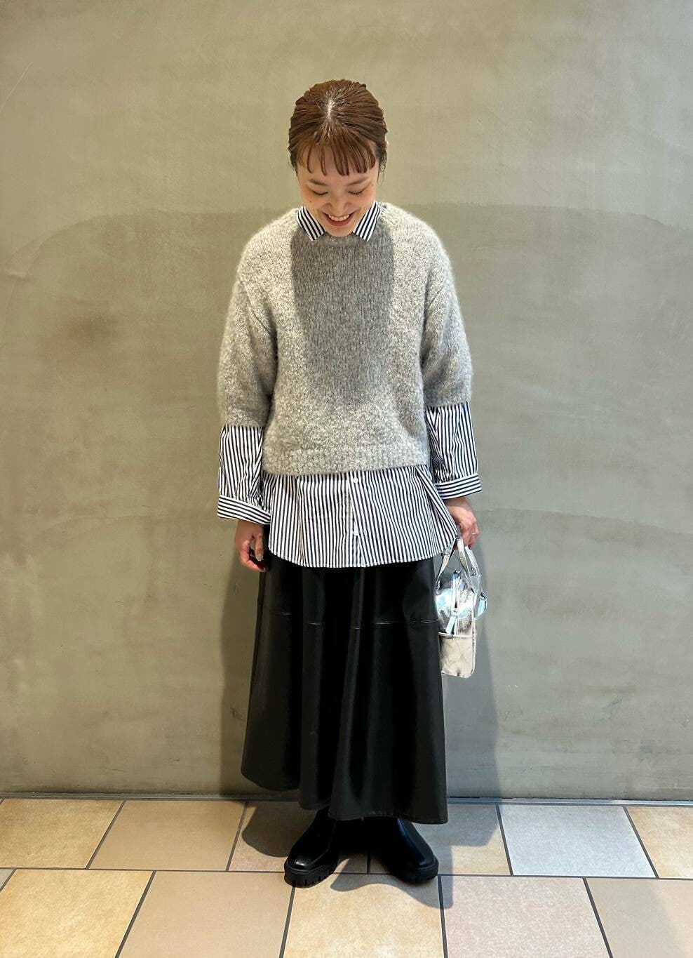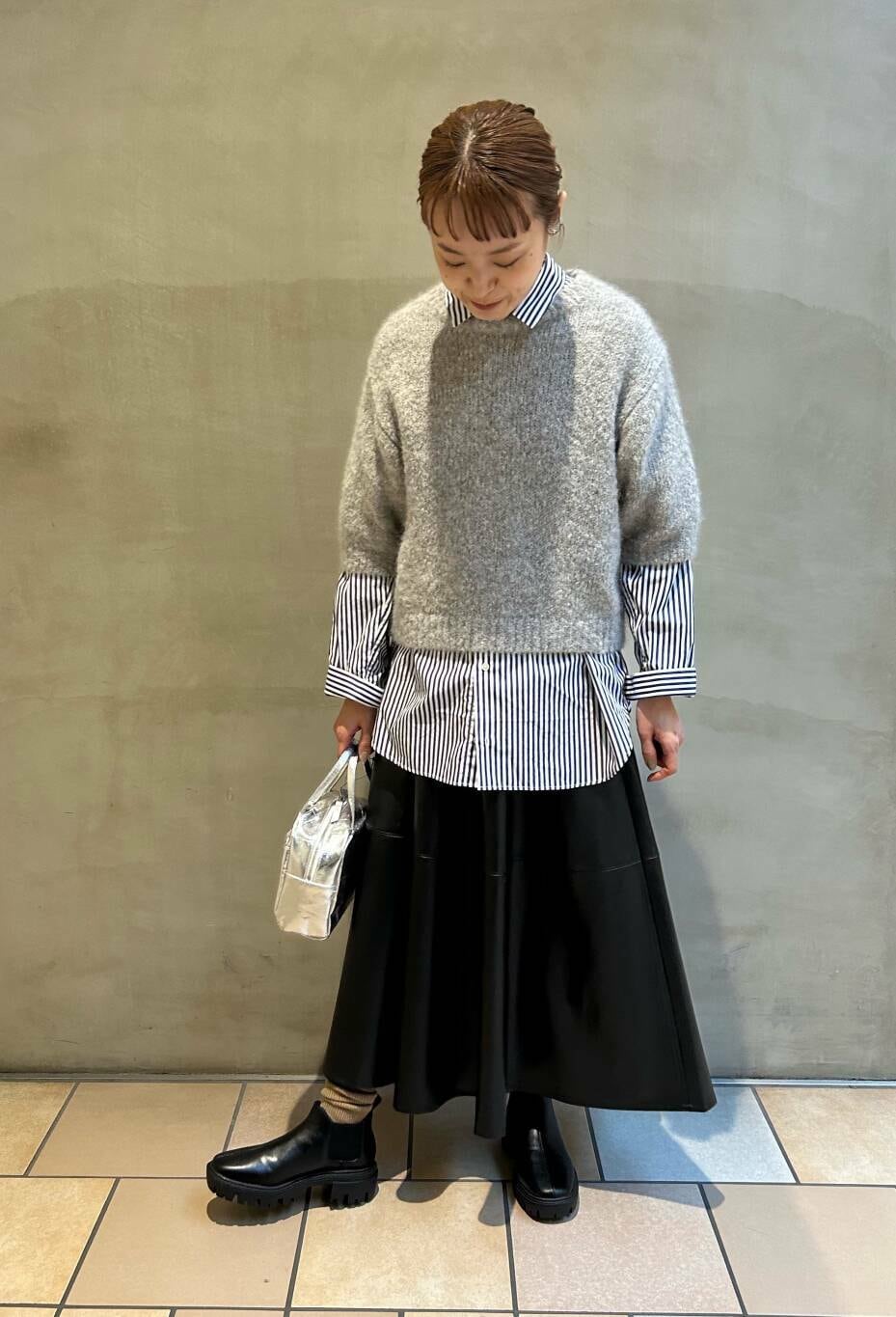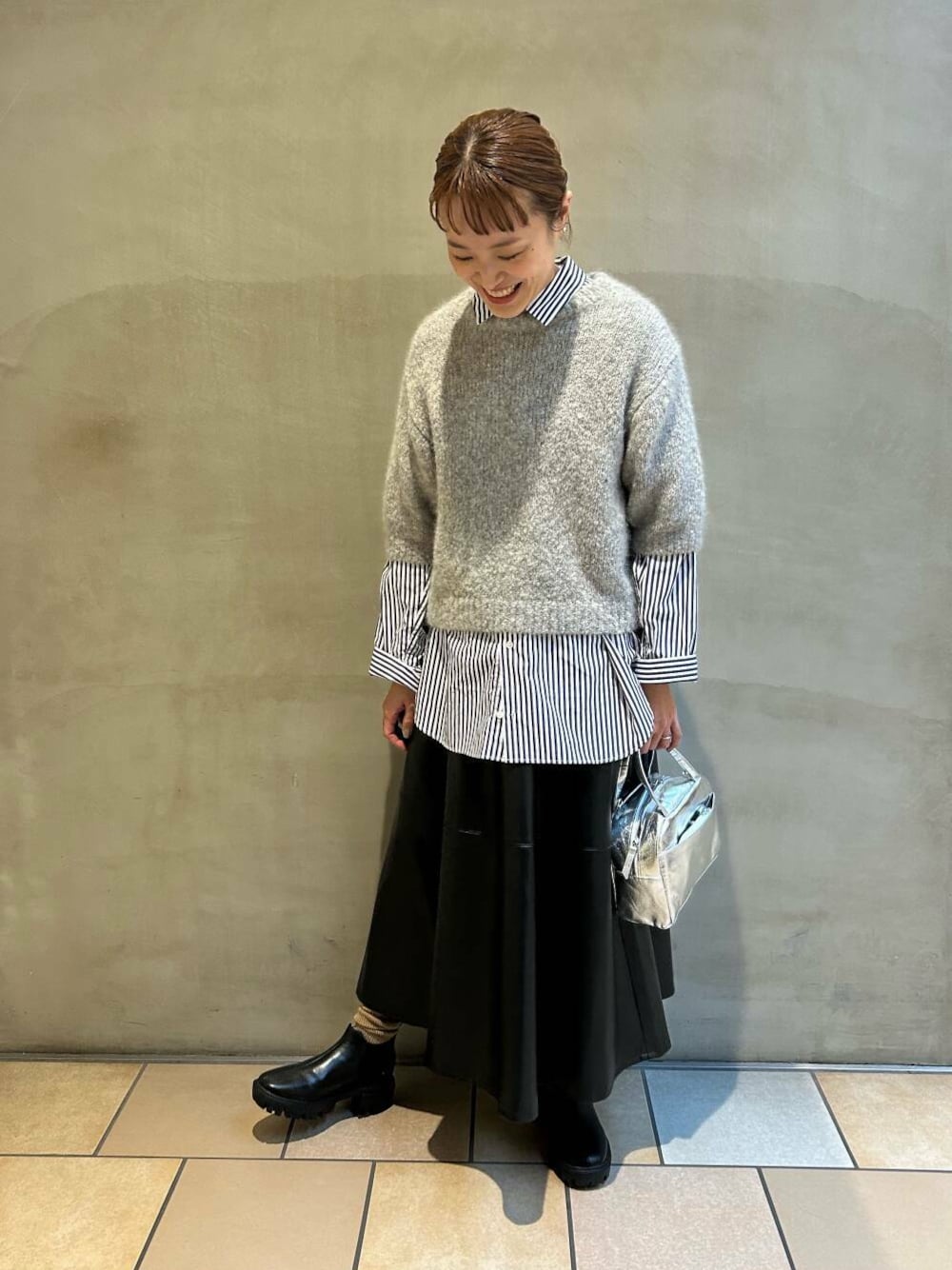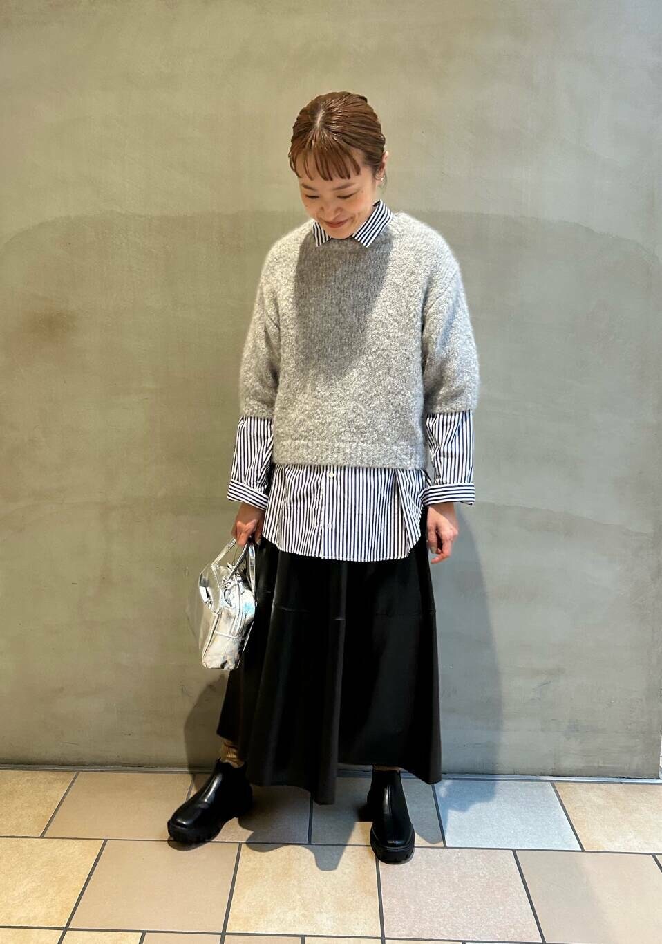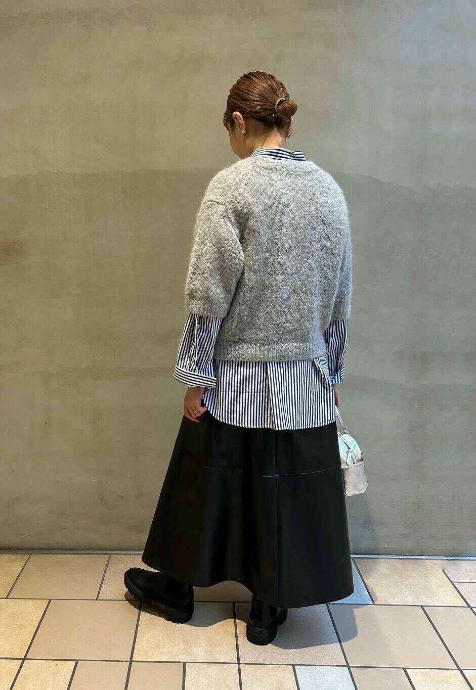 レザーライクのスカートと合わせてお出かけスタイルです。