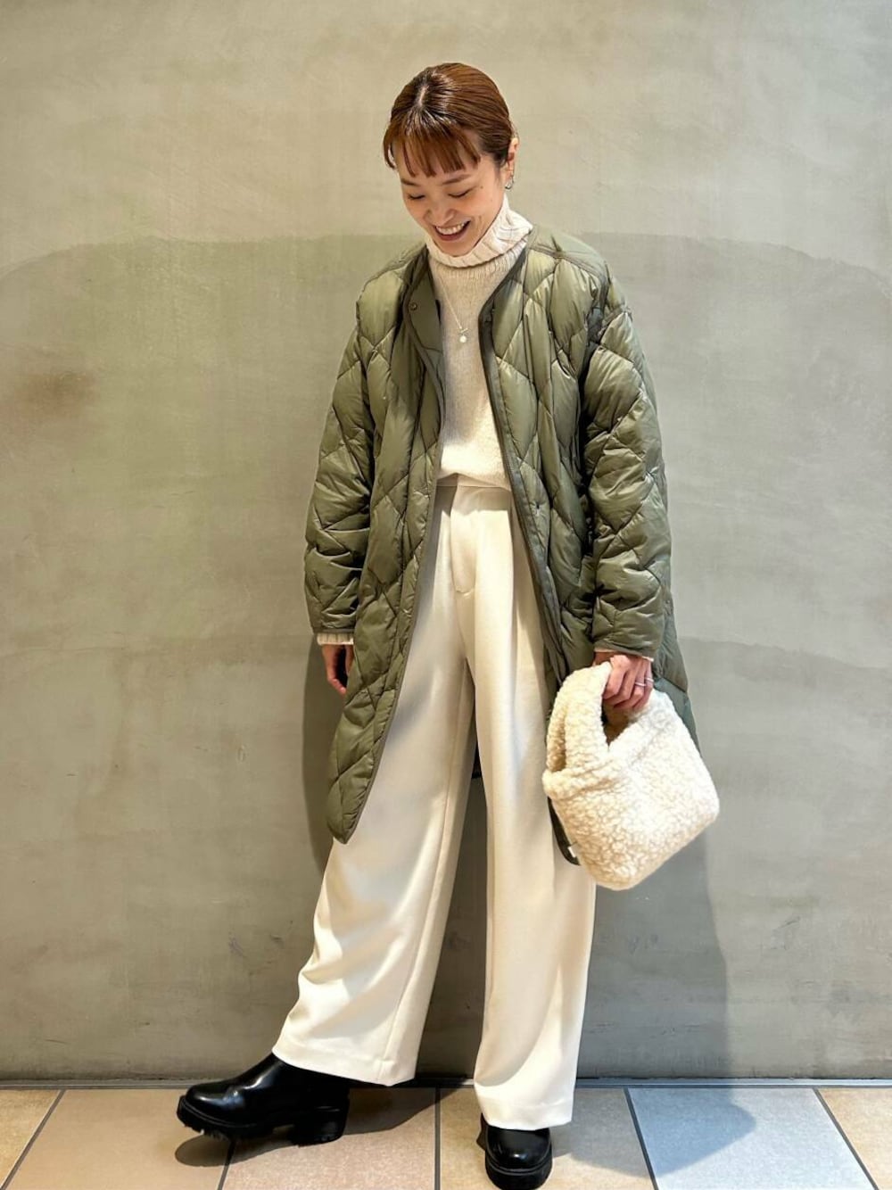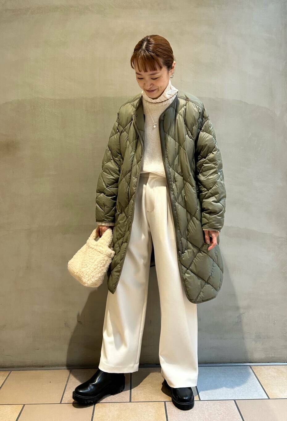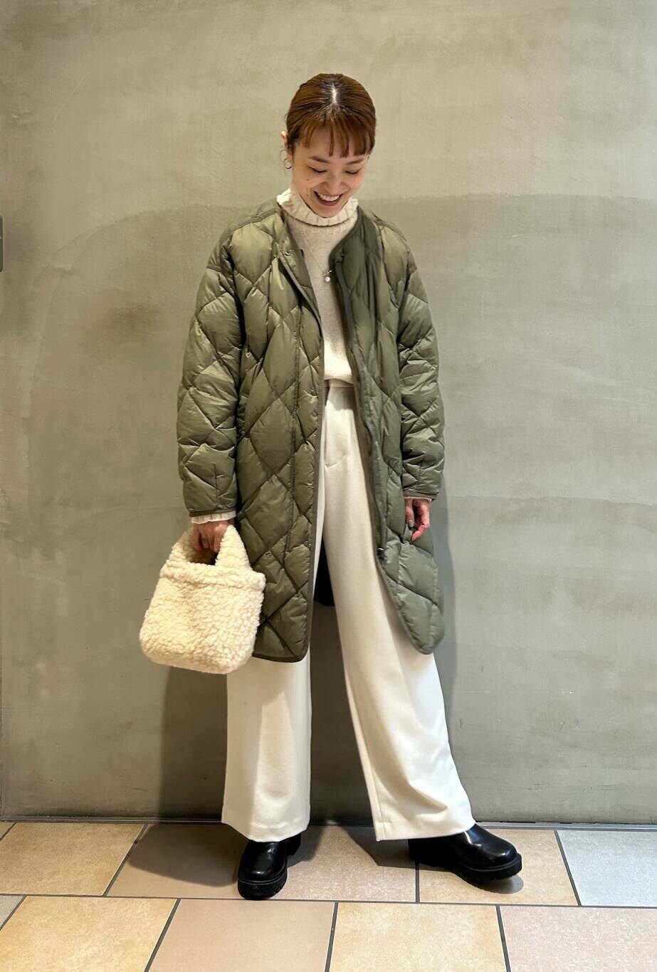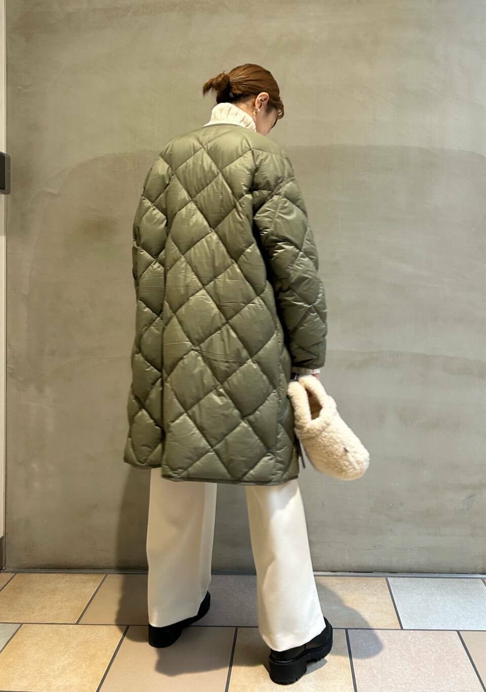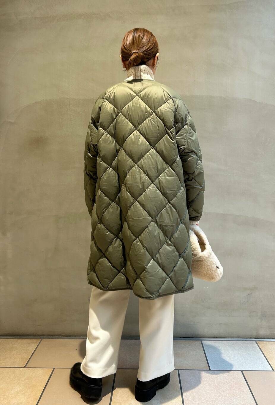 キルトダウンコート、とても軽くて暖かいです。ノーカラーなのでハイネックやフード、マフラー等お楽しみいただけます。