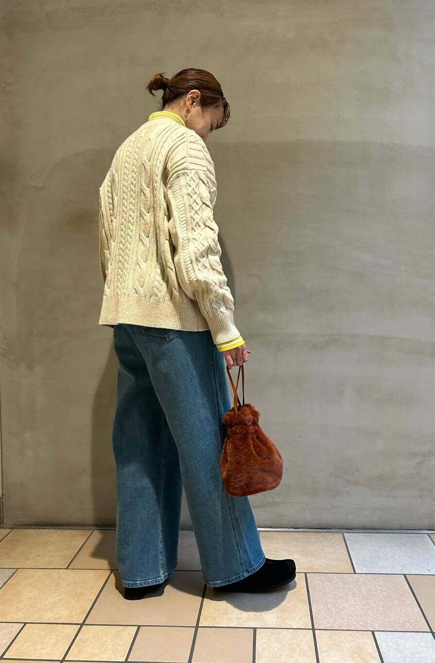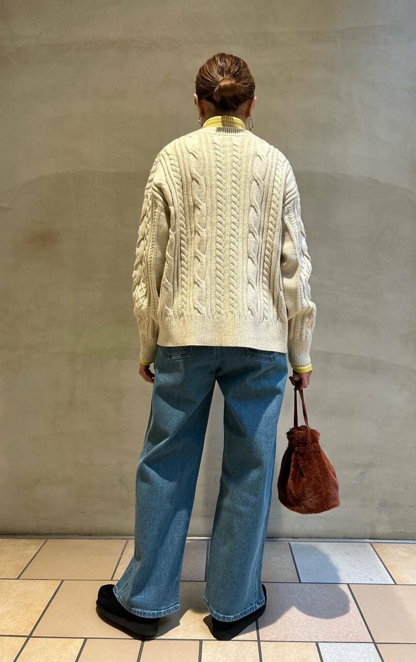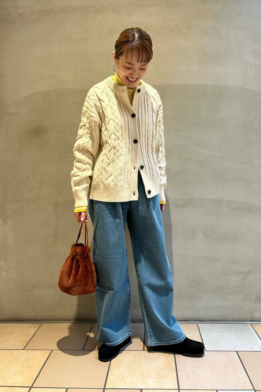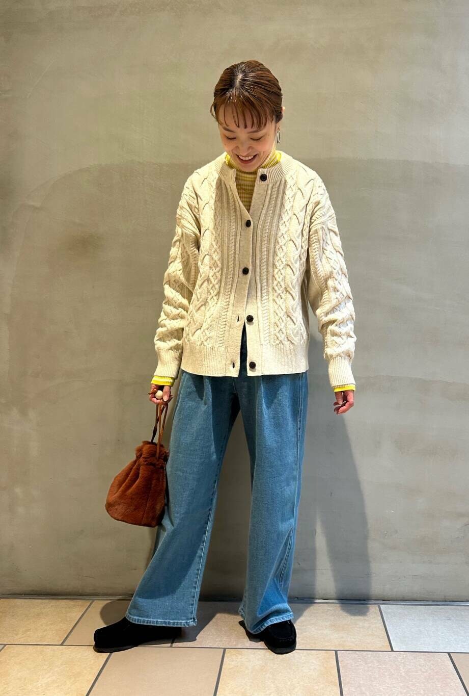 アラン柄のカーディガン、存在感もあり、色々と着回し出来てコーデの主役になってくれます。