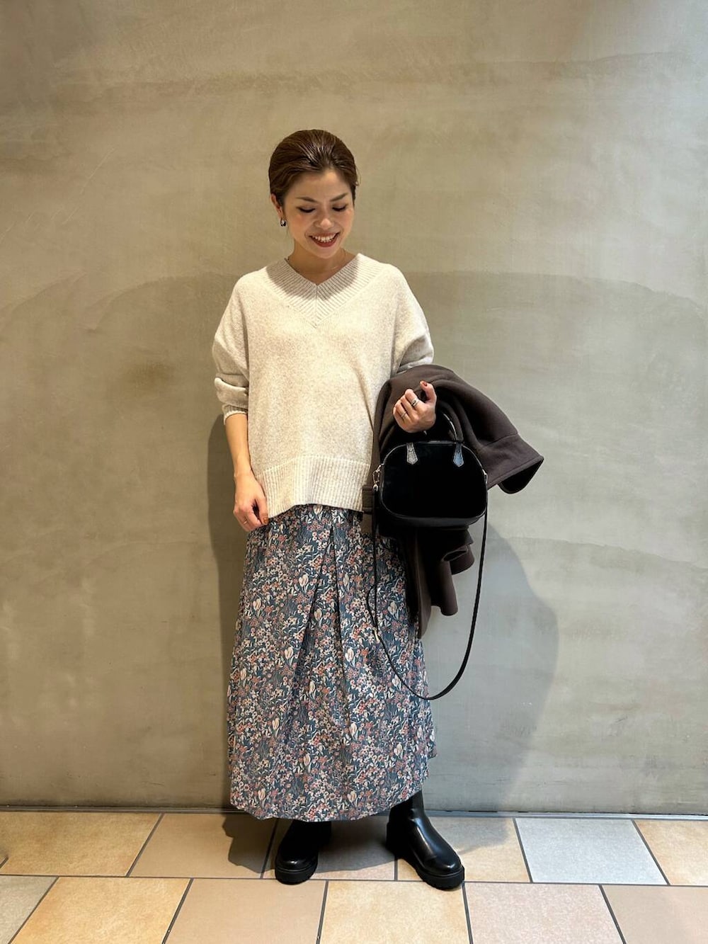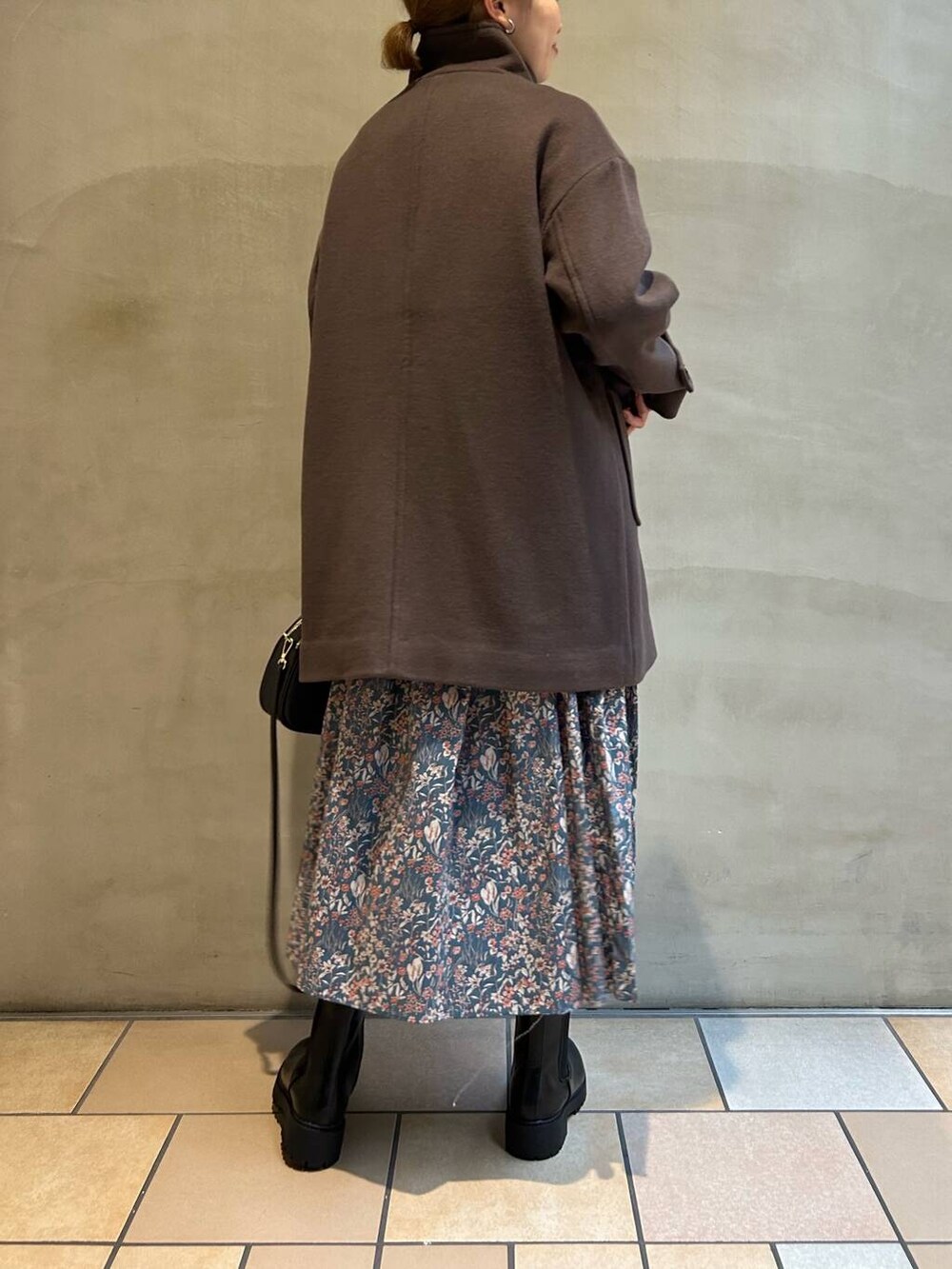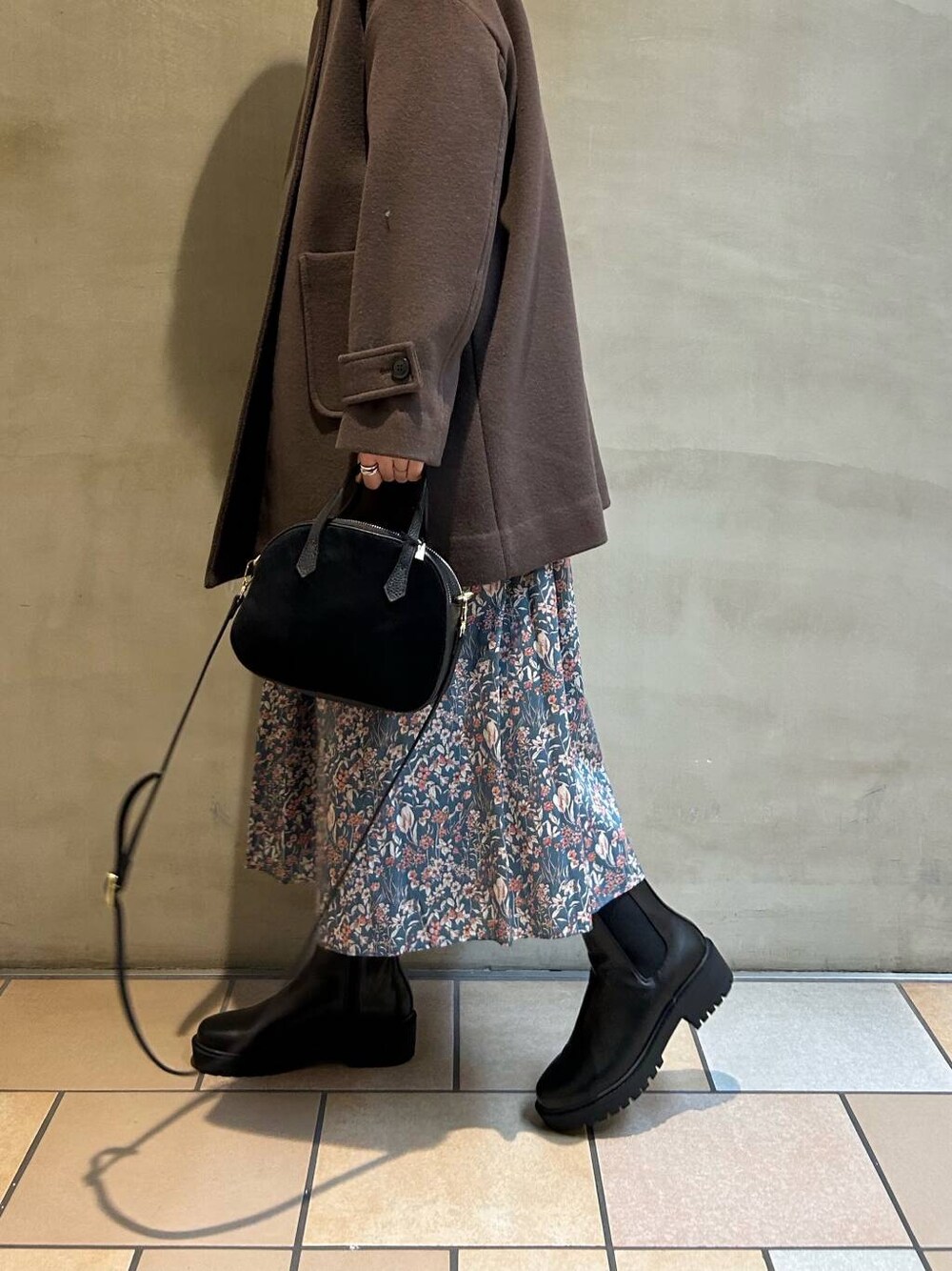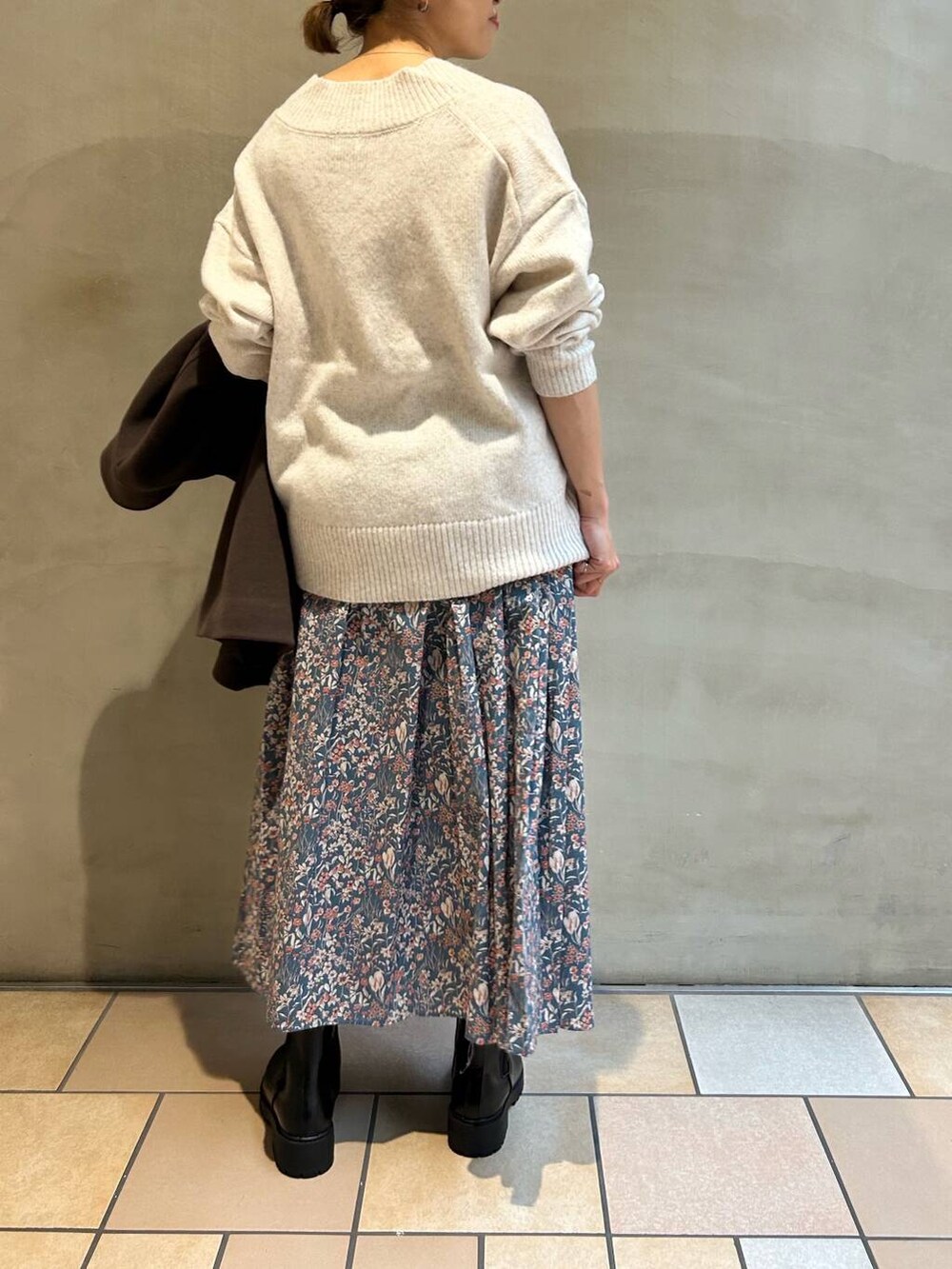 冬のコーデに映えるフラワープリントのスカートは柄だけでなく、ランダムにタックの入ったデザインで広がりすぎず上品に着て頂けます。