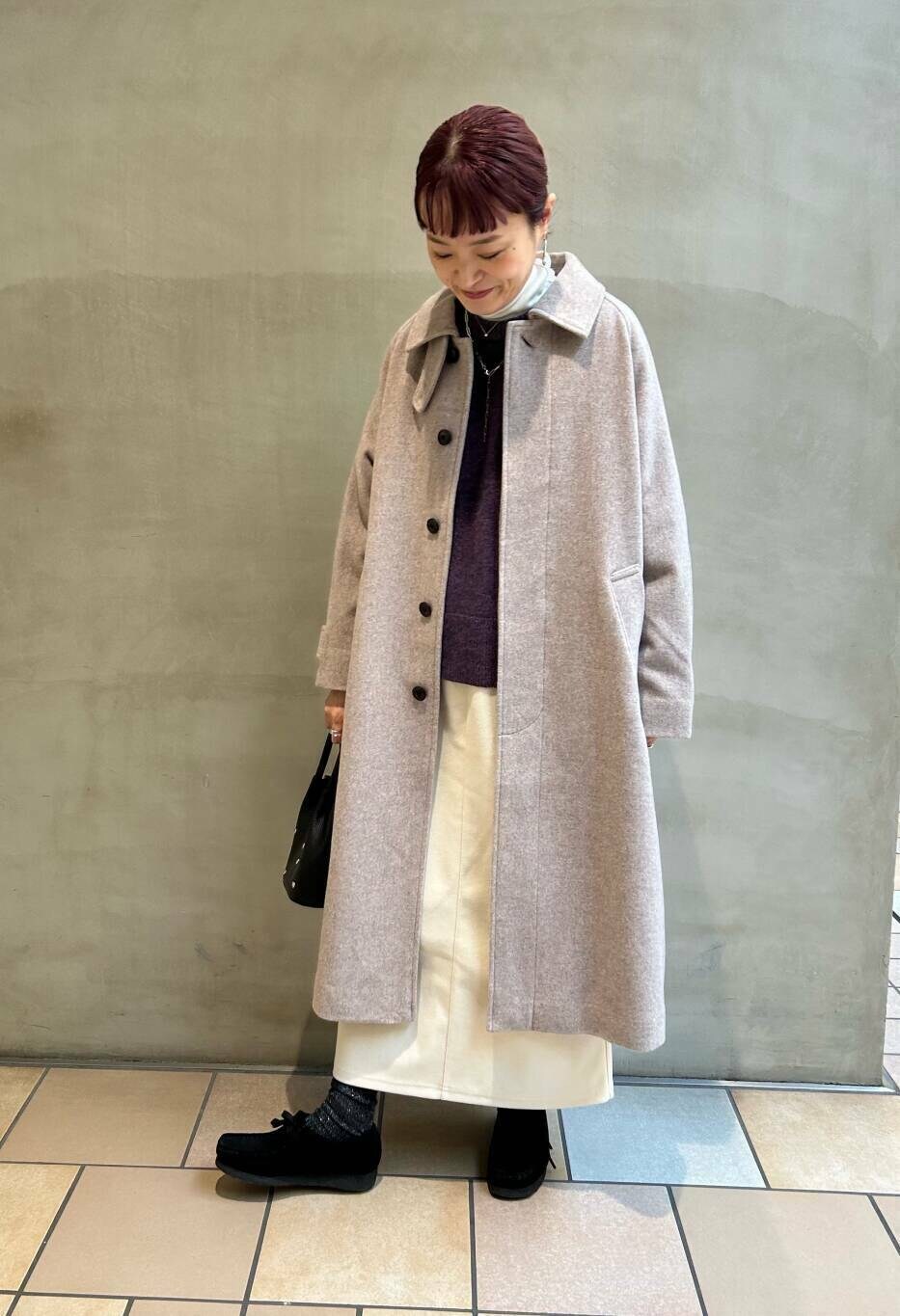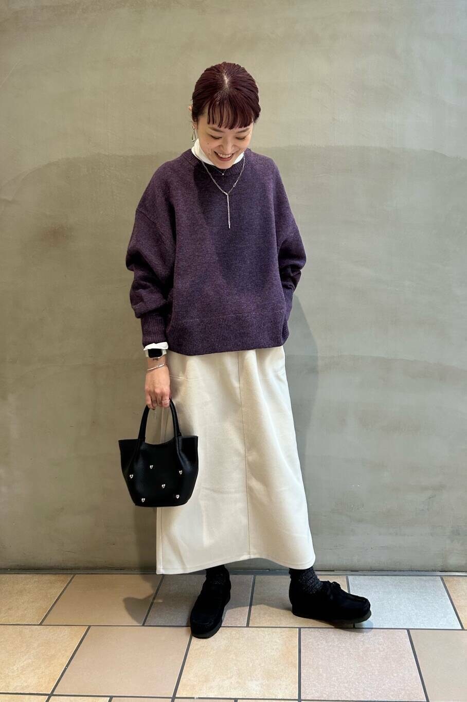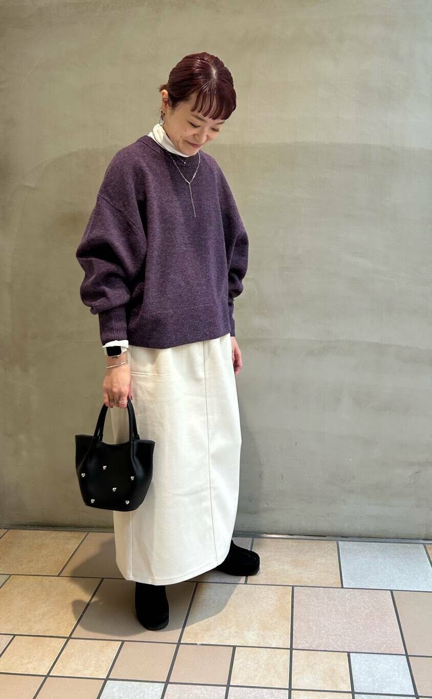 かぐれのハミルトンニット、パープルが珍しく、とてもキレイな色味です。サイズもゆったりしてるので中にインナーはさんでいただけます。