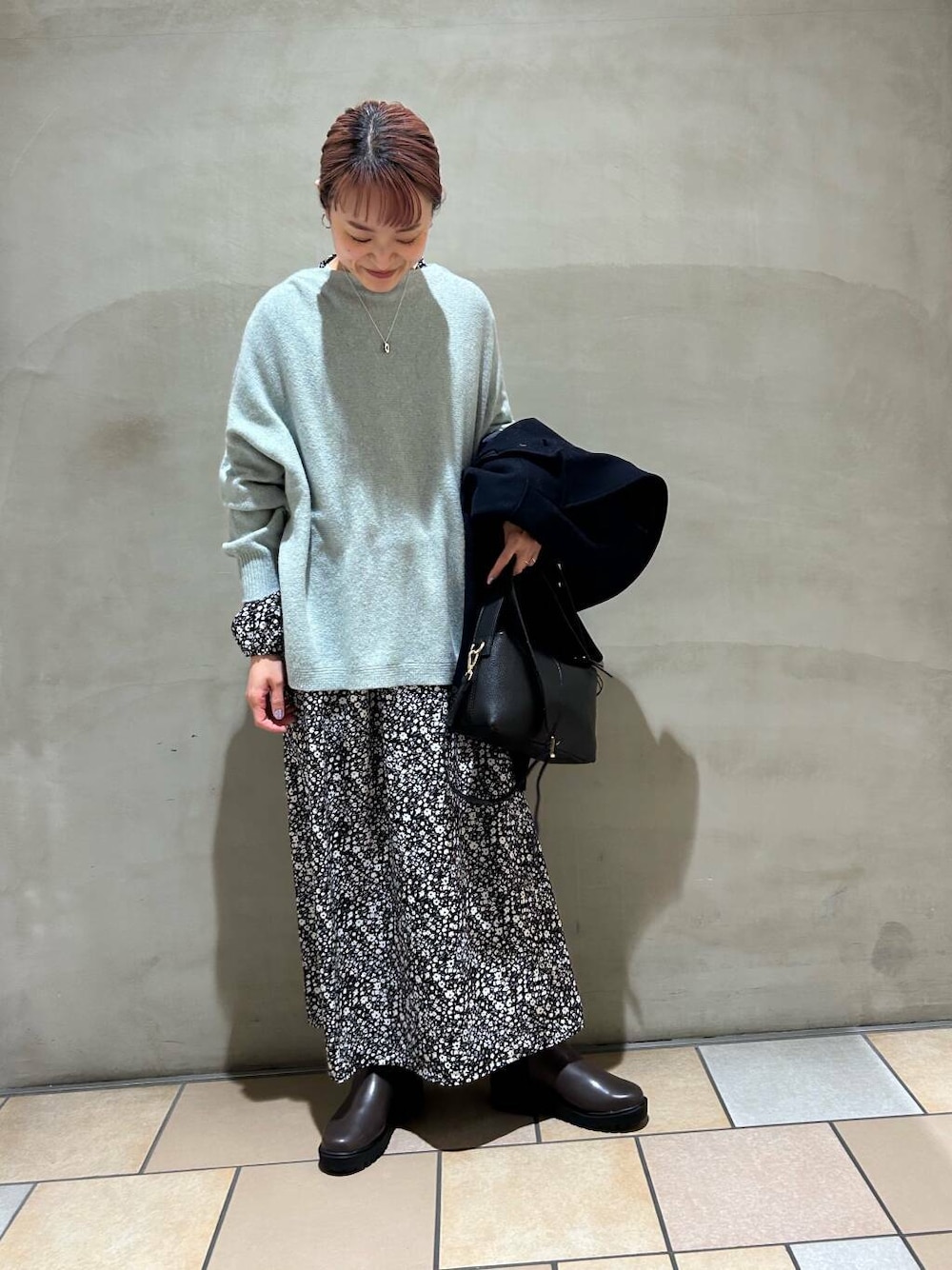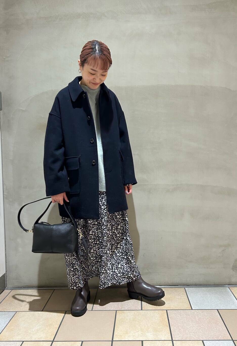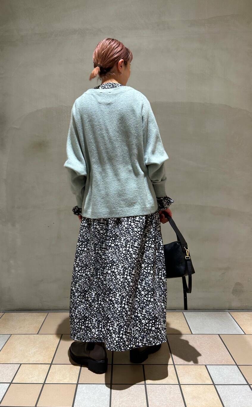 花柄ワンピースにニットを重ねてみましたコーデです。寒い日が続きますが、明るいカラーを着ると気分が上がります!