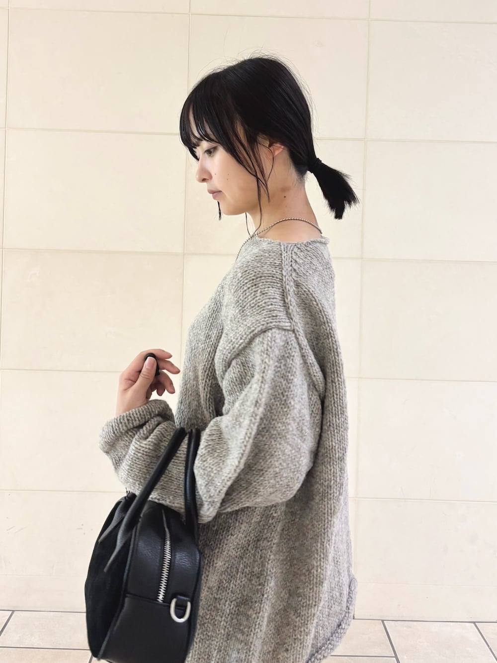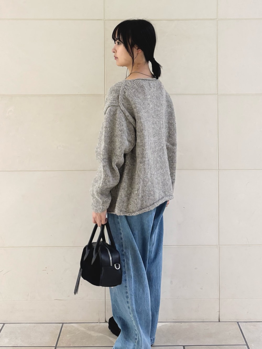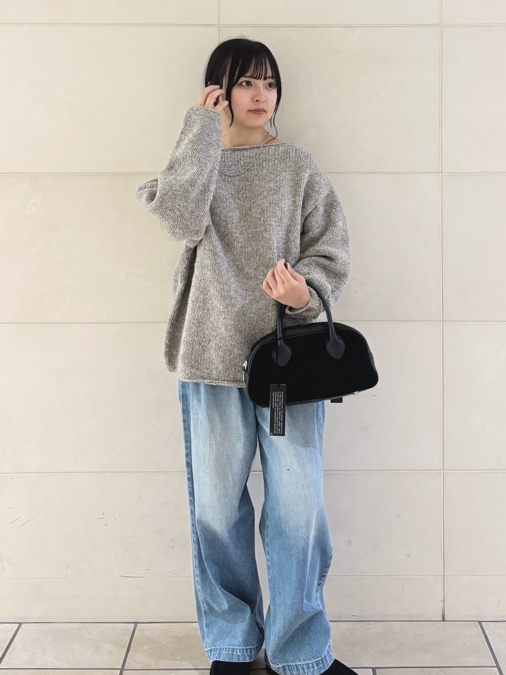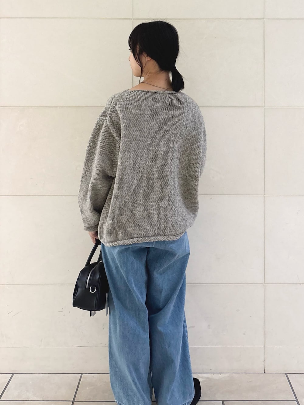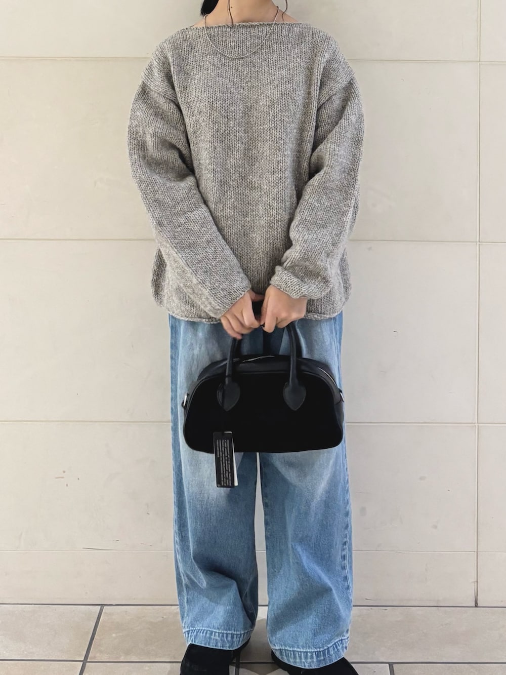 ボートネックになっているので、ニット自体に厚みはありますが、首元がすっきり綺麗に見えて上品に着こなしていただけます◎今回はカジュアルにかぐれのデニムと合わせてみました♩