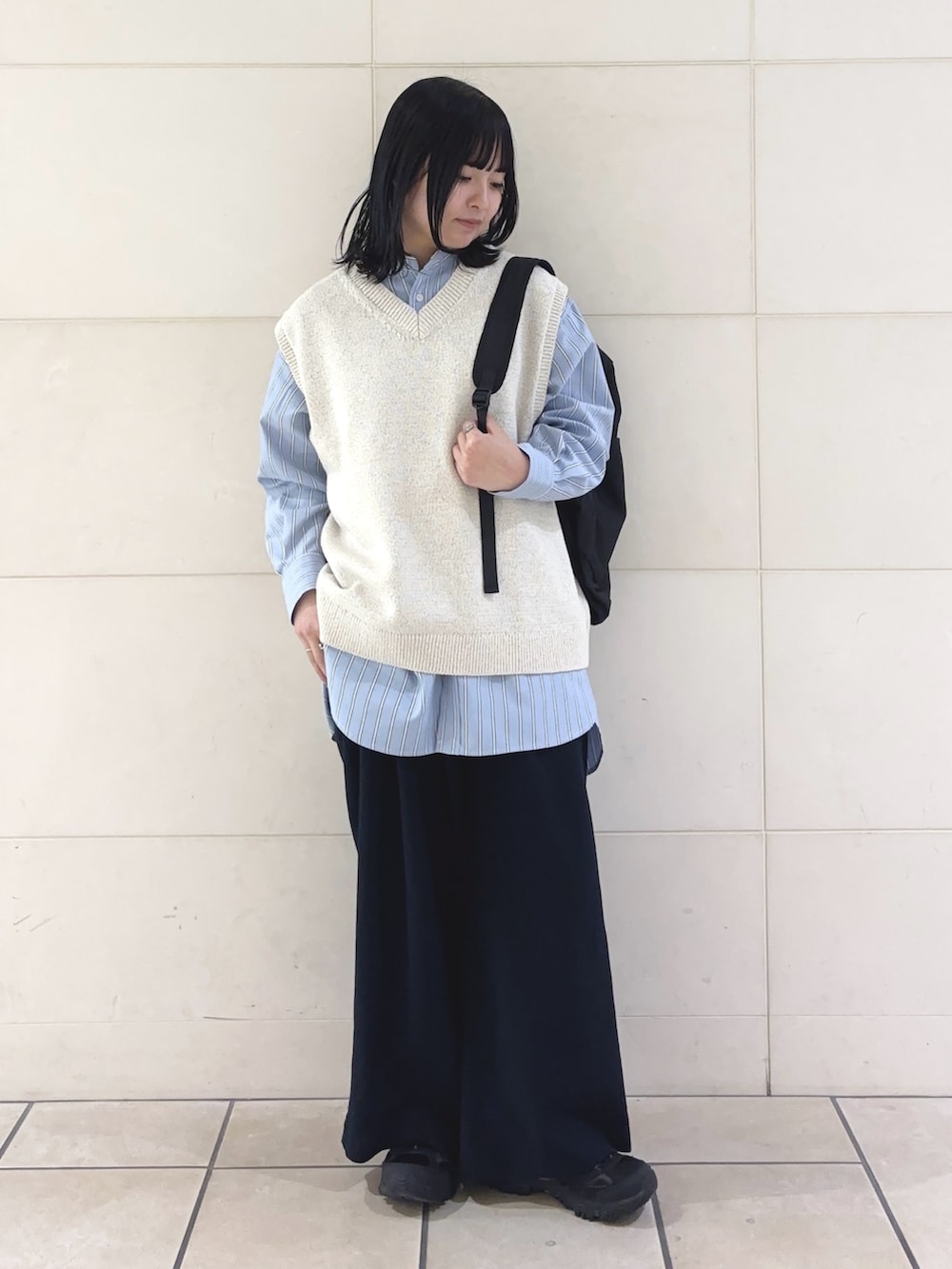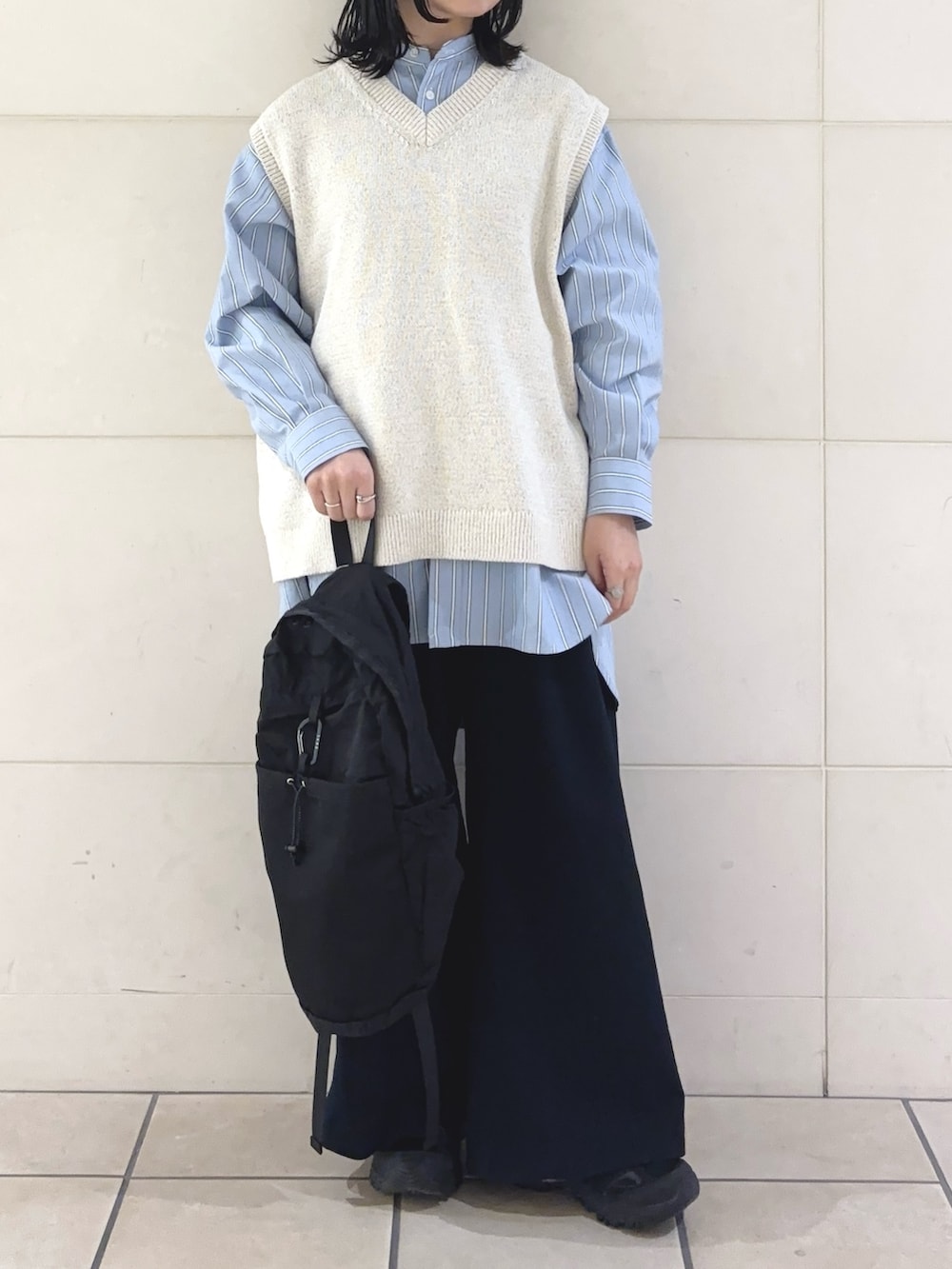 ヤーンを使用し、ワントーンでまとめたミックスカラーを扱っているためポイントながらも主張しすぎない点が魅力です🙆🏻伸縮性があるので着心地や着脱も楽にできシャツやTシャツの上に重ねるのはもちろん、冷え込む今の季説にはタートルの上から重ねたりするのもおすすめです!