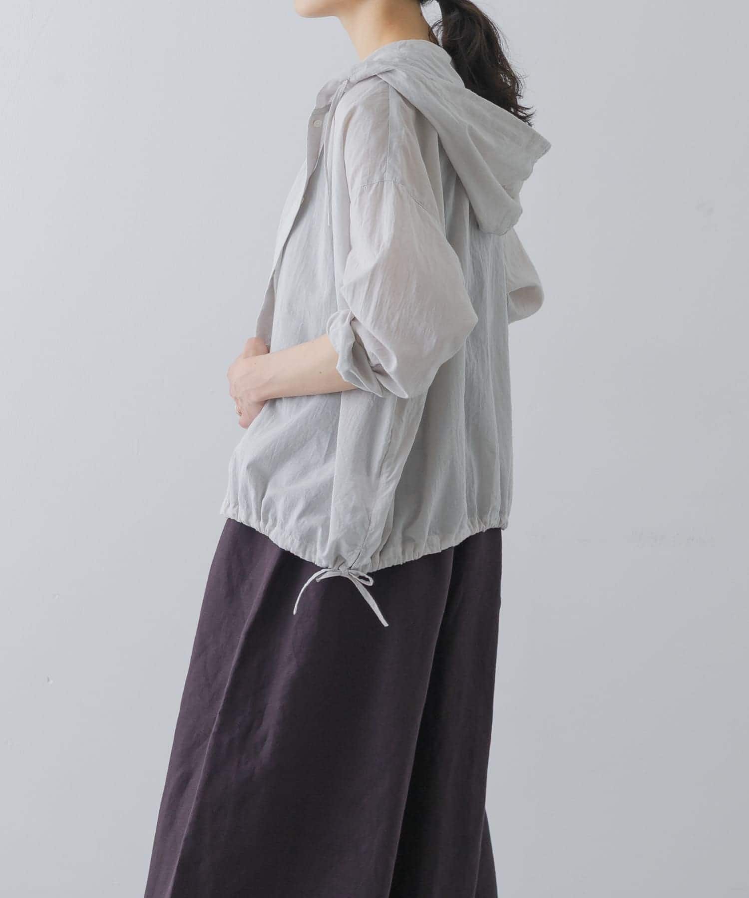 トップスは今の時期から秋口まで使っていただける素材になっています!カジュアルなフードのデザインが存在感があり、1枚でコーデが決まります🫧日よけや冷房対策としても使っていただけます🙆🏻裾には共生地の紐が通してあり、絞ってブラウジングするとシルエットが変わります◎