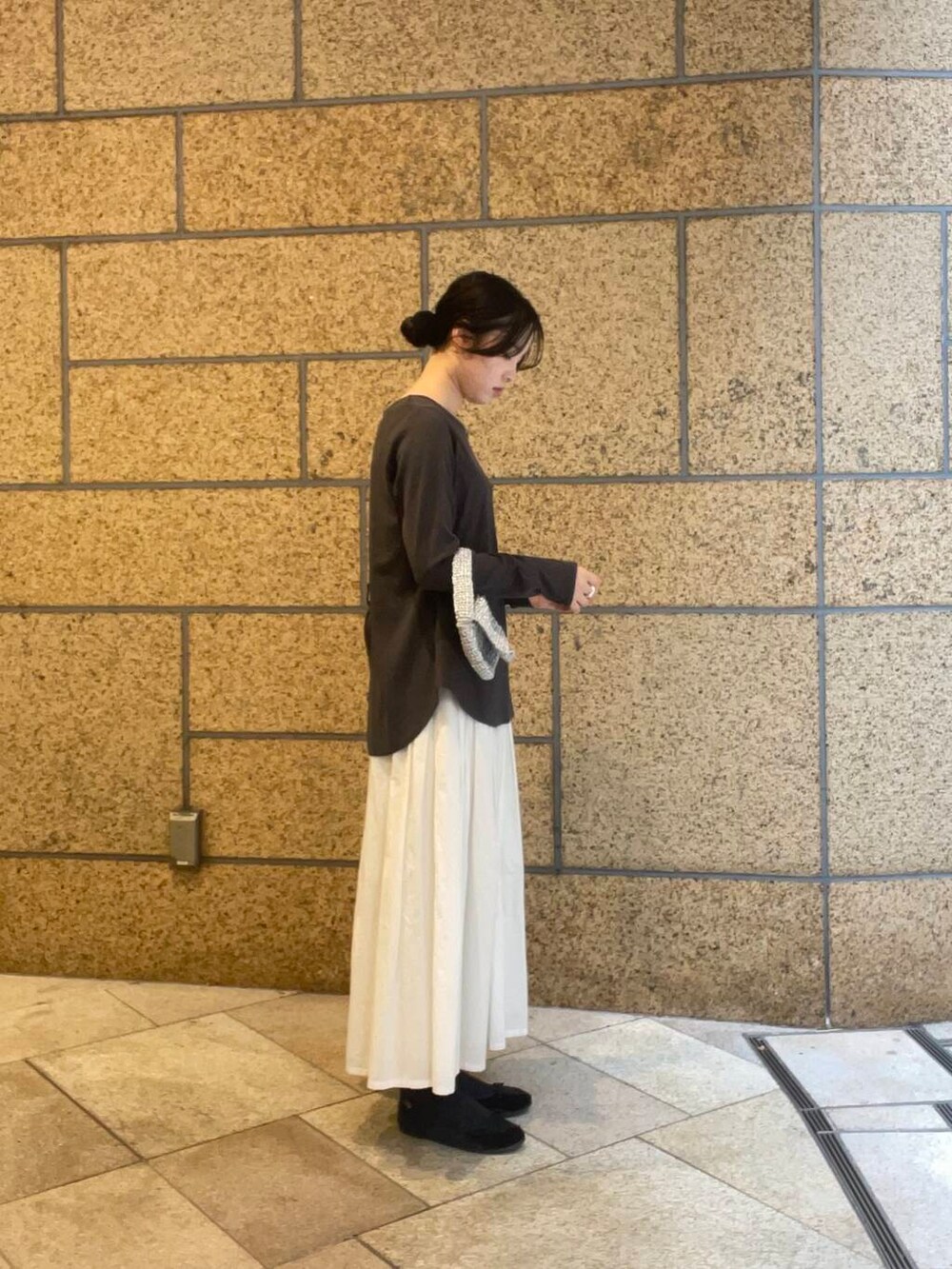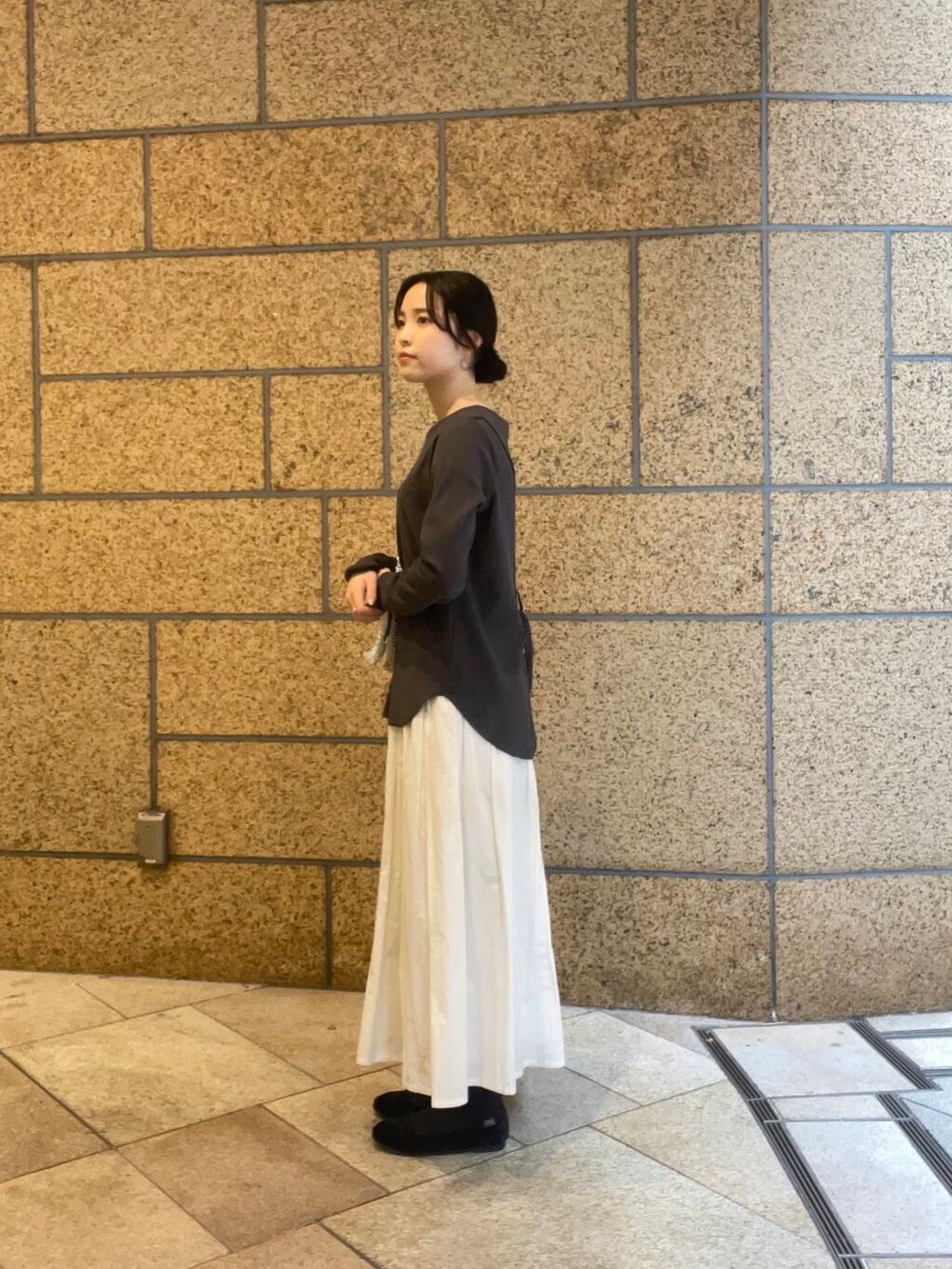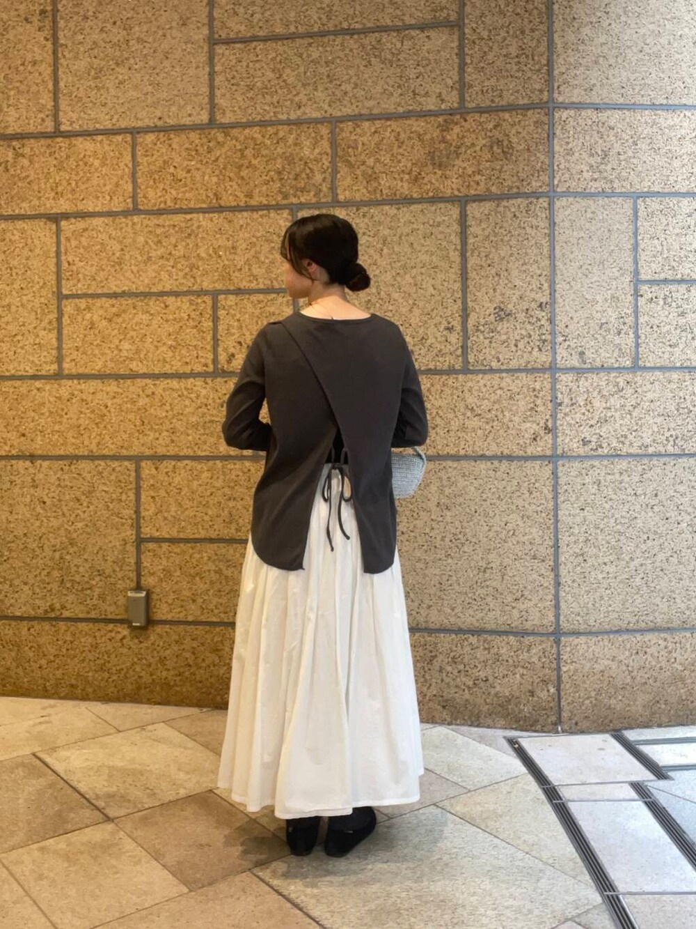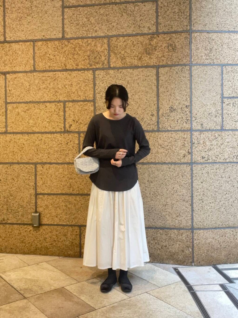 色味は秋っぽくチャコールで。でも気持ちは明るく行きたいので白のスカートでキレイ目に仕上げてみました♩