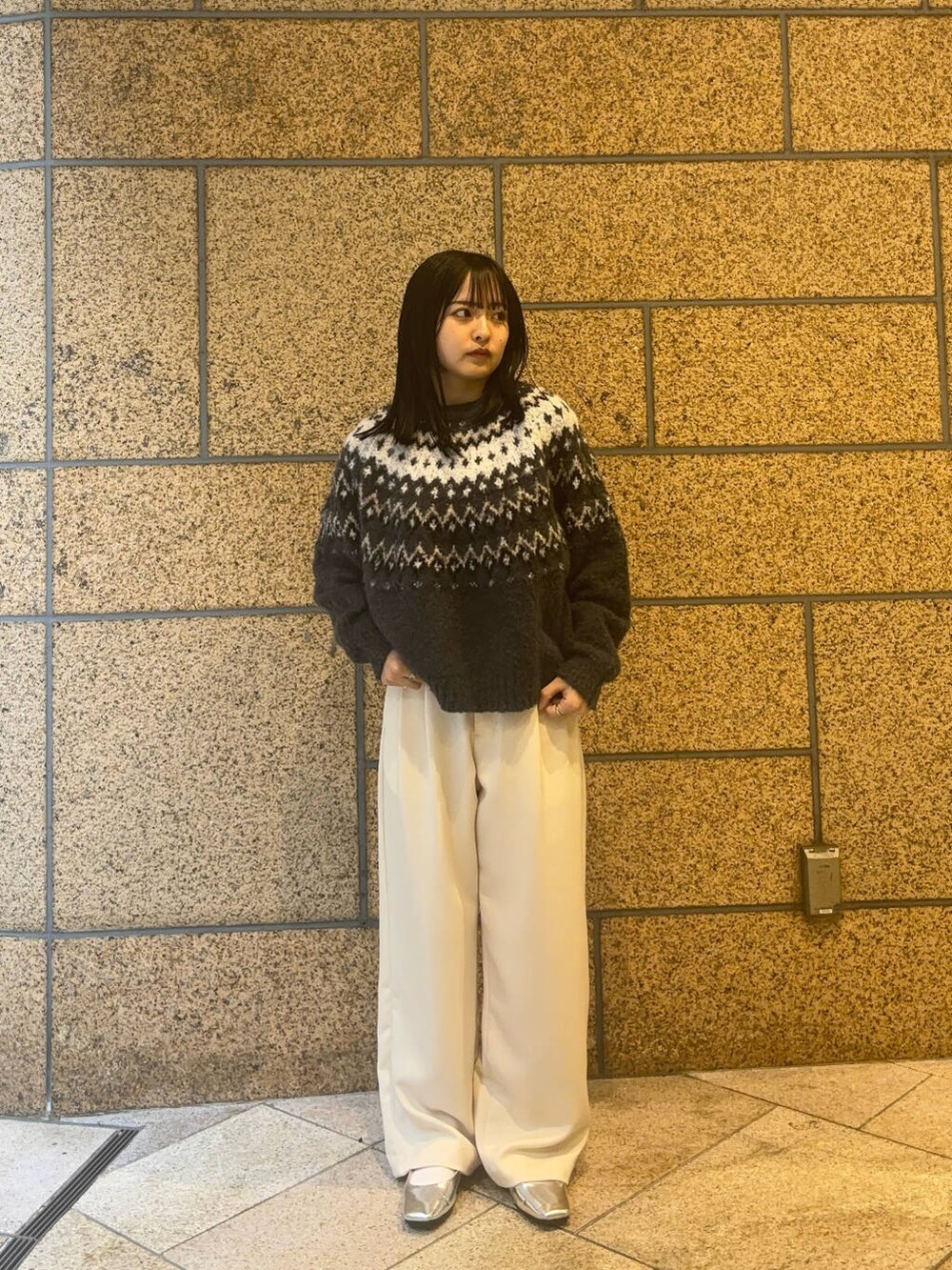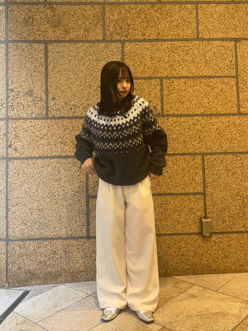 パッと目を引くノルディック柄のニットは冬らしさ全開で、この季節に一枚あると着こなしの幅が広がると思います❄️