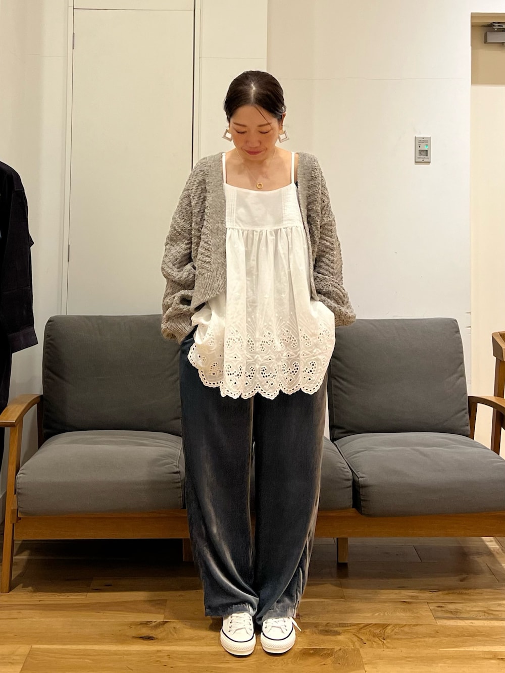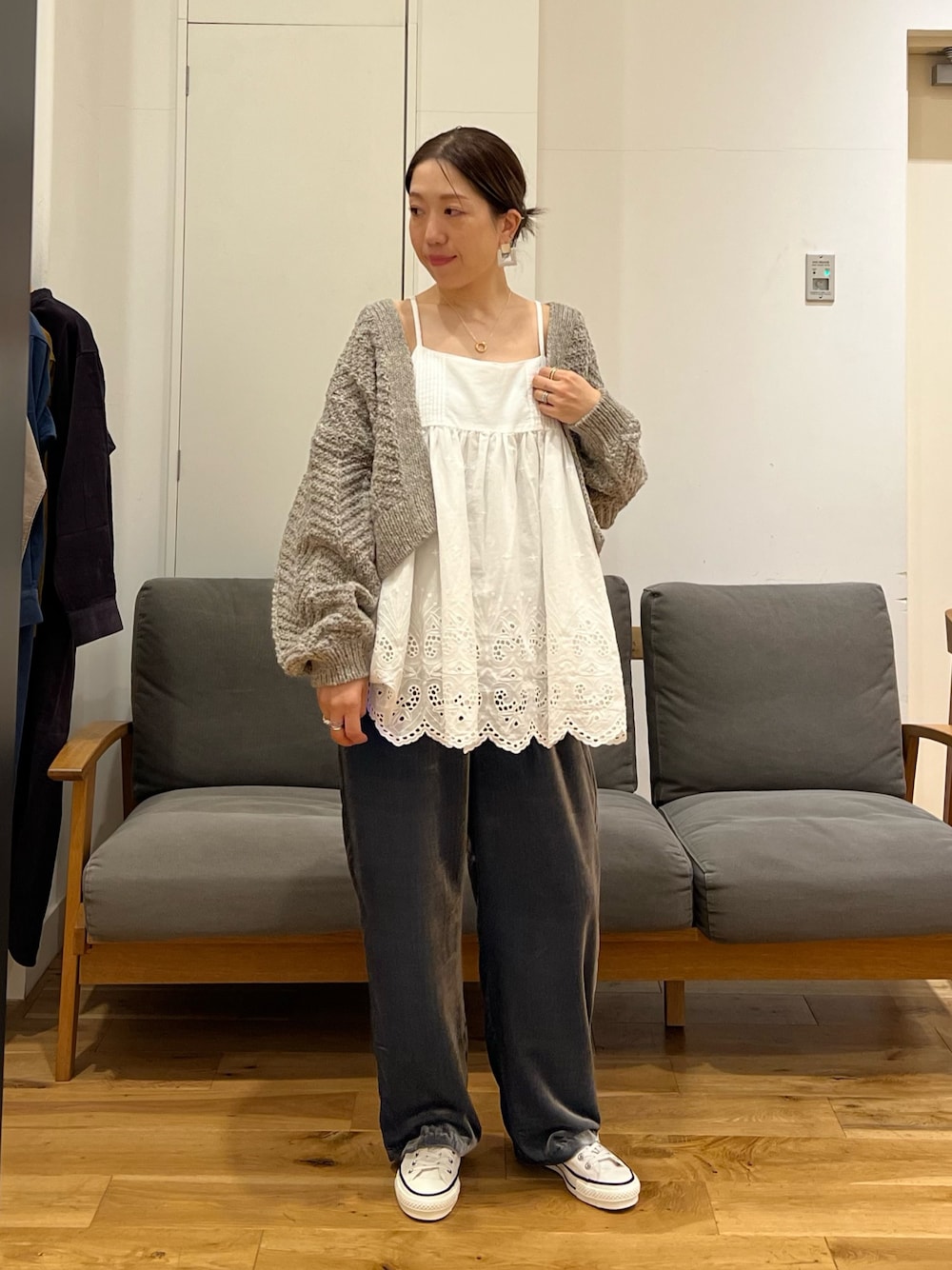 全体的にゆるーいシルエットですが、スカラップ刺繍のキャミソールをインナーにして少し肌見せ。。大好きなスタイルです^_^