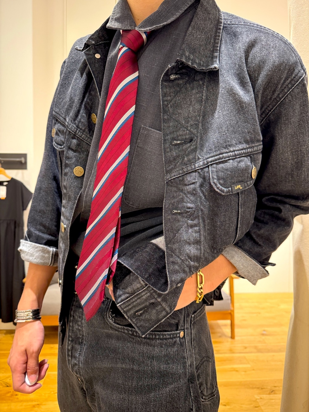 全体が黒だと統一はしていますが、一体感を感じにくいので、赤のネクタイを巻き、コーデ全体の雰囲気