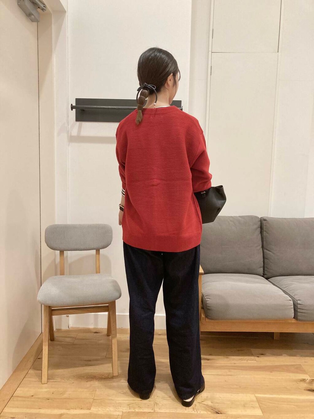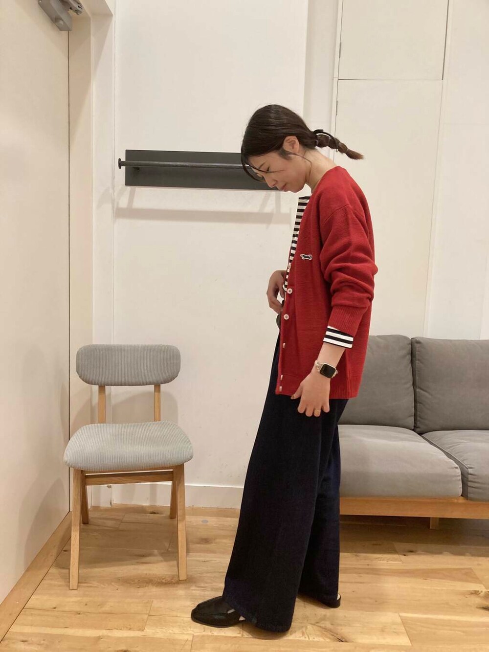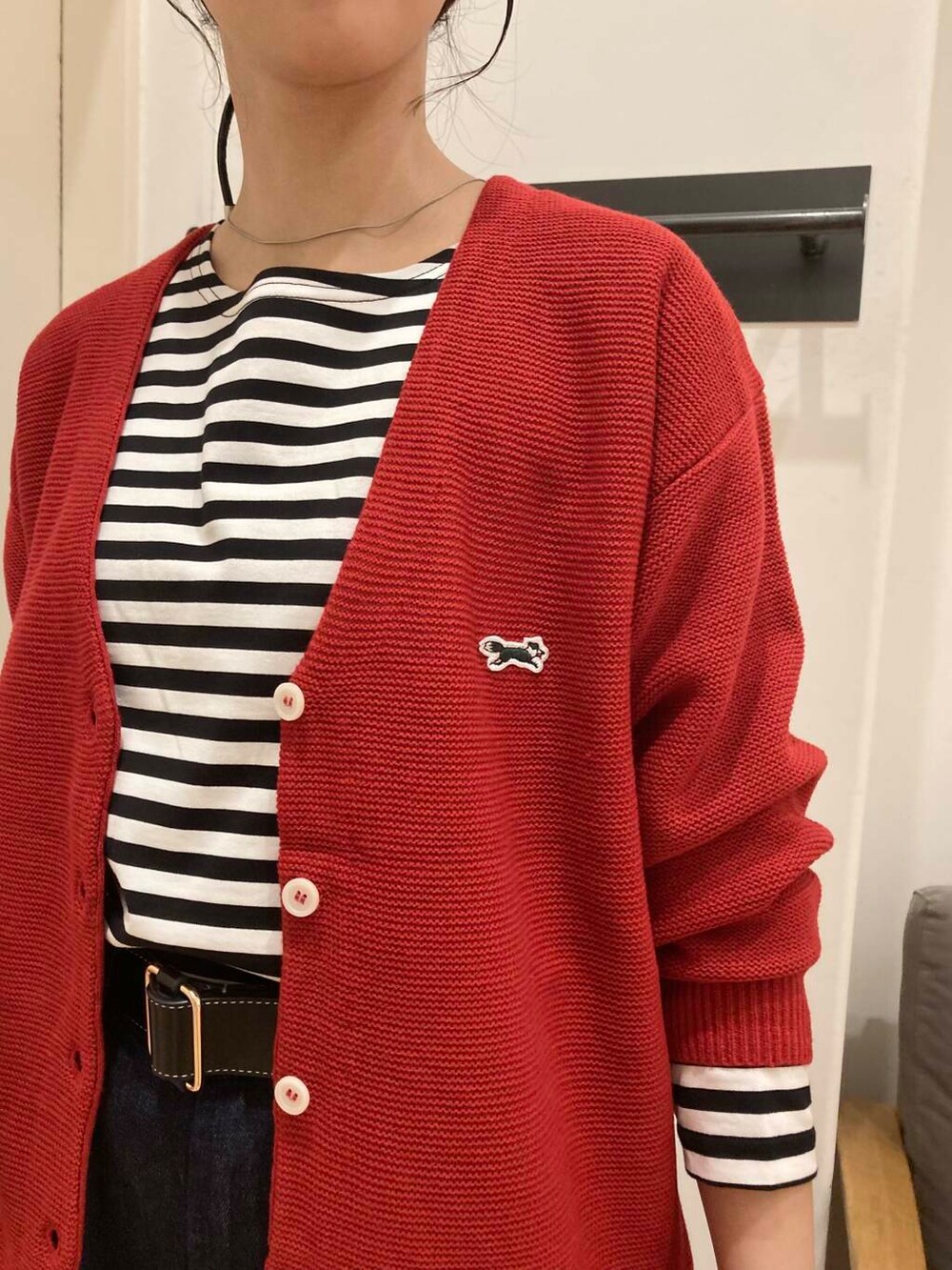THE FOXのVネックニットカーディガンの赤色は主張しすぎない落ち着いた色味で、デニムとの相性いいです◎