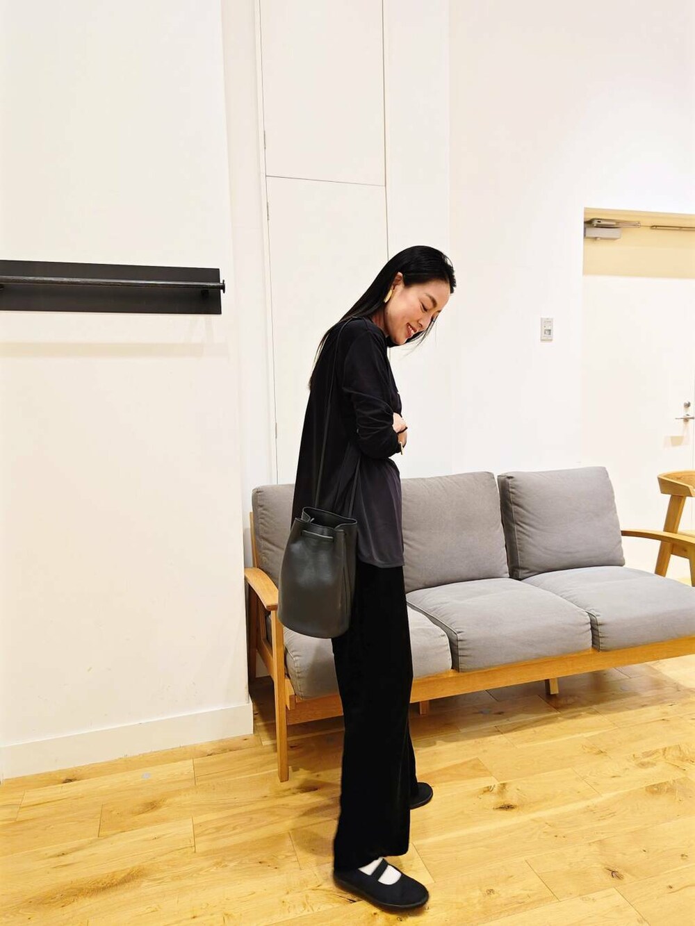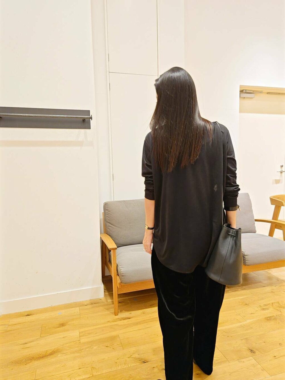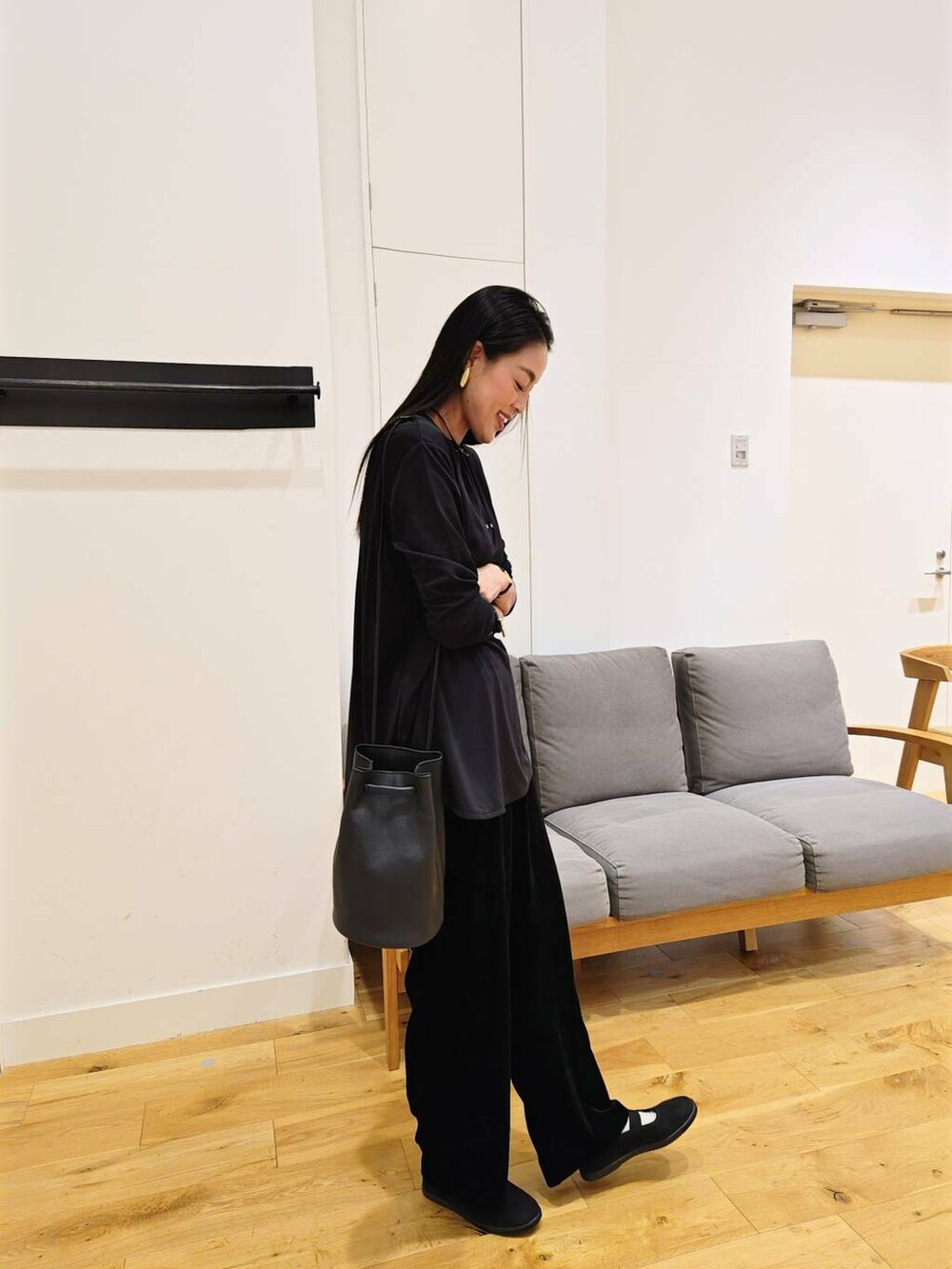 マットな質感で高級感があるパンツはストレートシルエットが綺麗でお気に入り。
